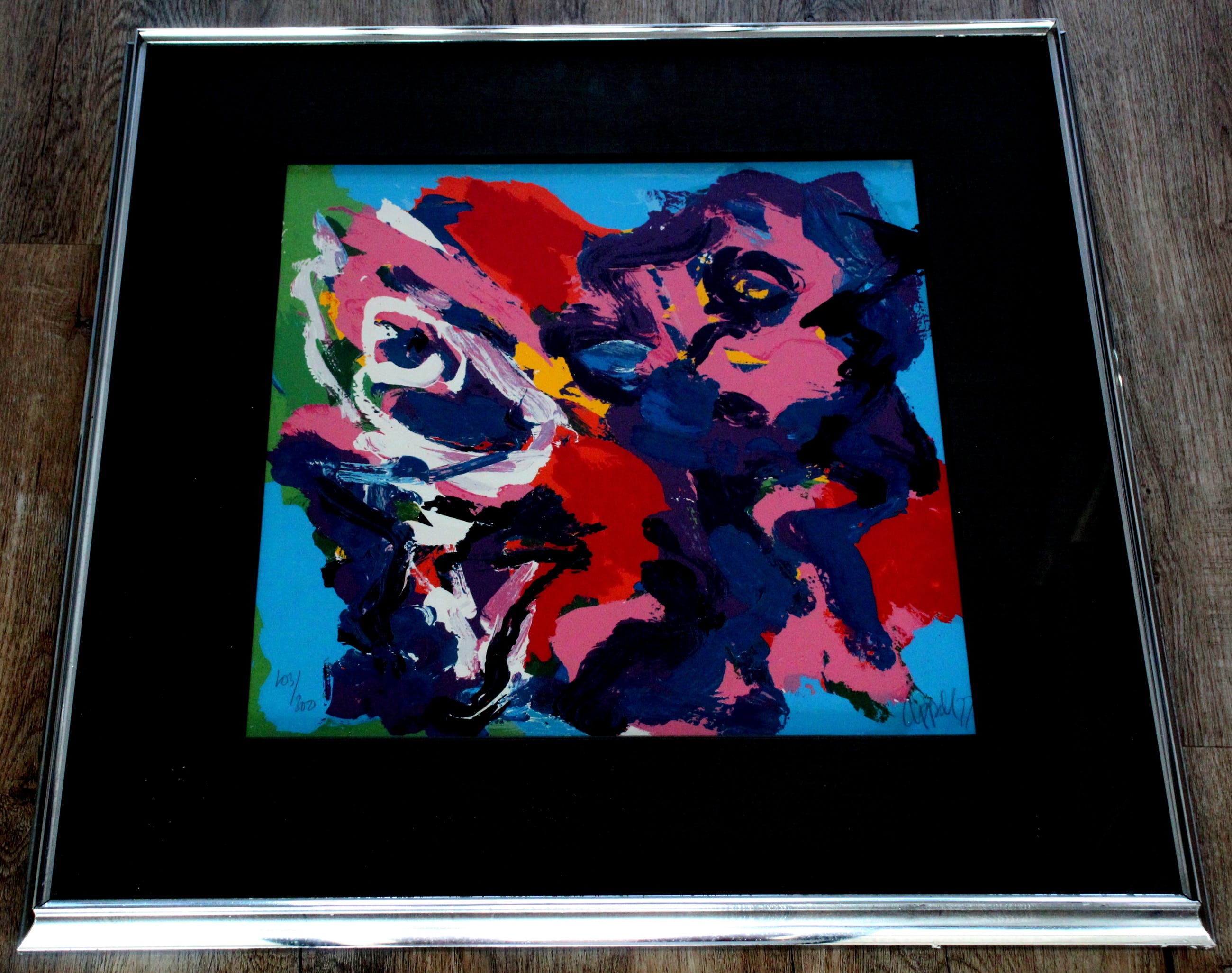 ingelijste zeefdruk van Karel Appel uit de serie: "Kijk, leef & speel". Nummer: 103/300. Jaar: 1977. Afmetingen incl lijst: H78 x b78cm. Afmetingen voorstelling: H49 x b49cm. Het werk is rechts onderaan, met potlood, gesigneerd door de kunstenaar. De authenticiteit van het, aangeboden werk, wordt volledig gegarandeerd. Een certificaat van echtheid zal worden gemaild.