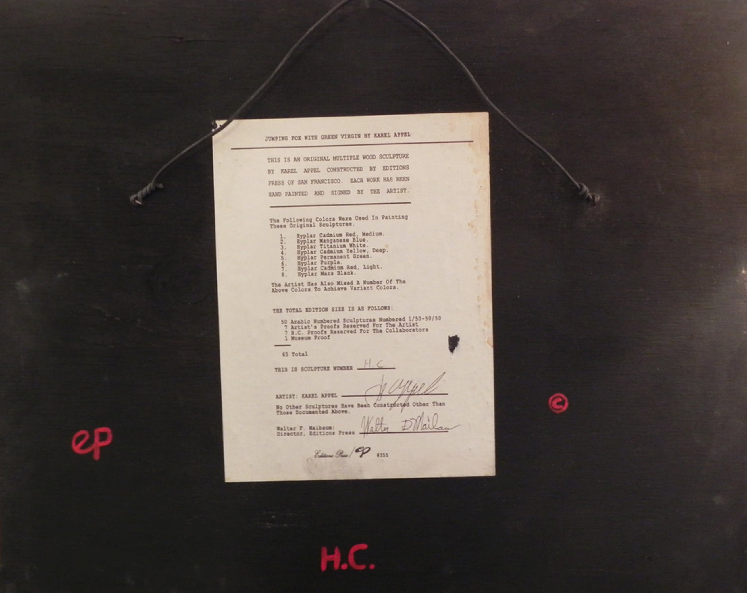 Certificaat van echtheid gesigneerd door Karel Appel en Walter Maibaum is gemonteerd op de achterkant.