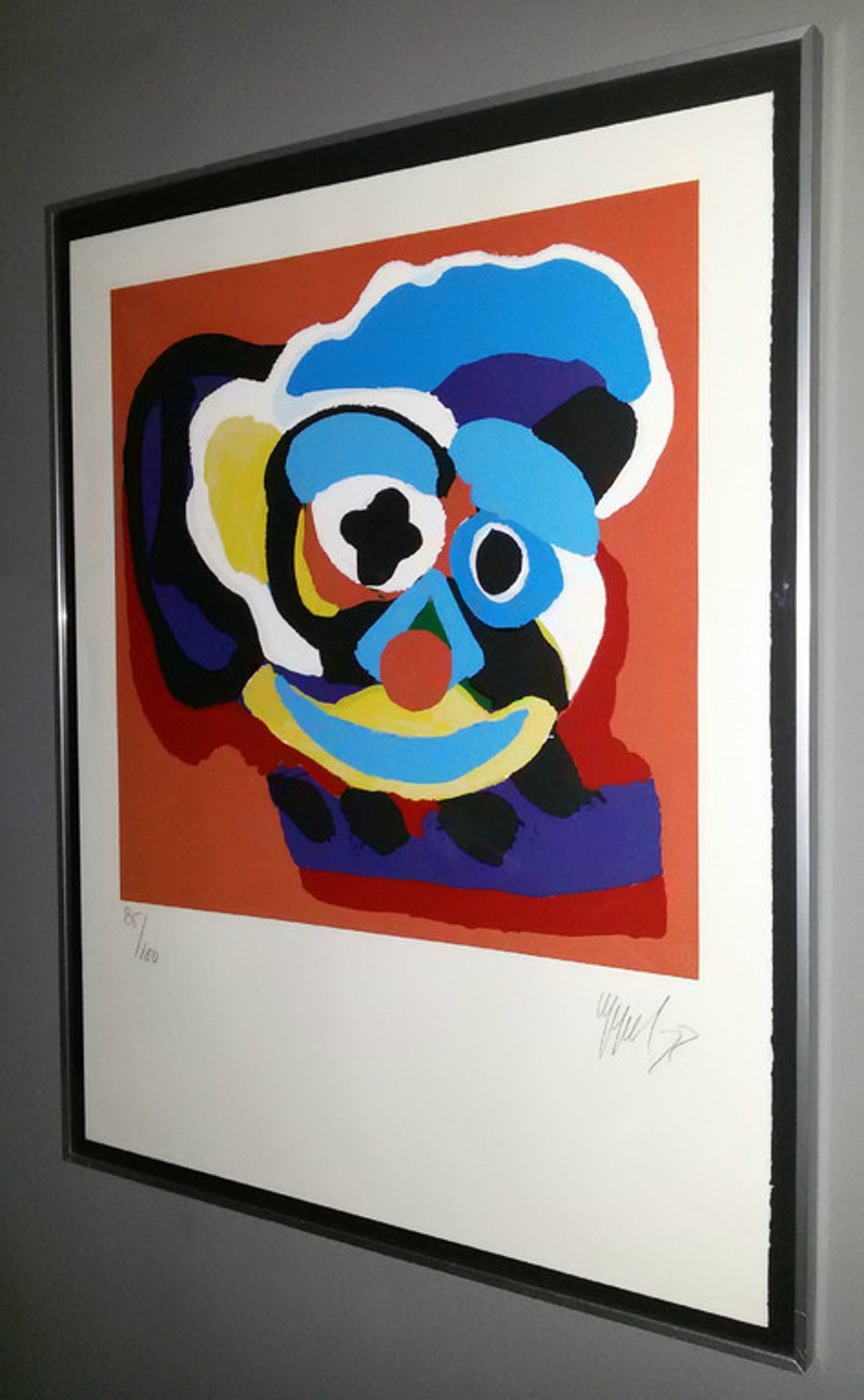 Prachtige zeefdruk van Karel Appel uit 1977. Zeefdruk op 350 grams Economos-Etching papier, met potlood gesigneerd, gedateerd en genummerd (85/100), en met blindstempel van Henk van der Vet Screenprinting. Het volledige blad in strakke aluminium lijst, achter glas, zonder passe-partout.