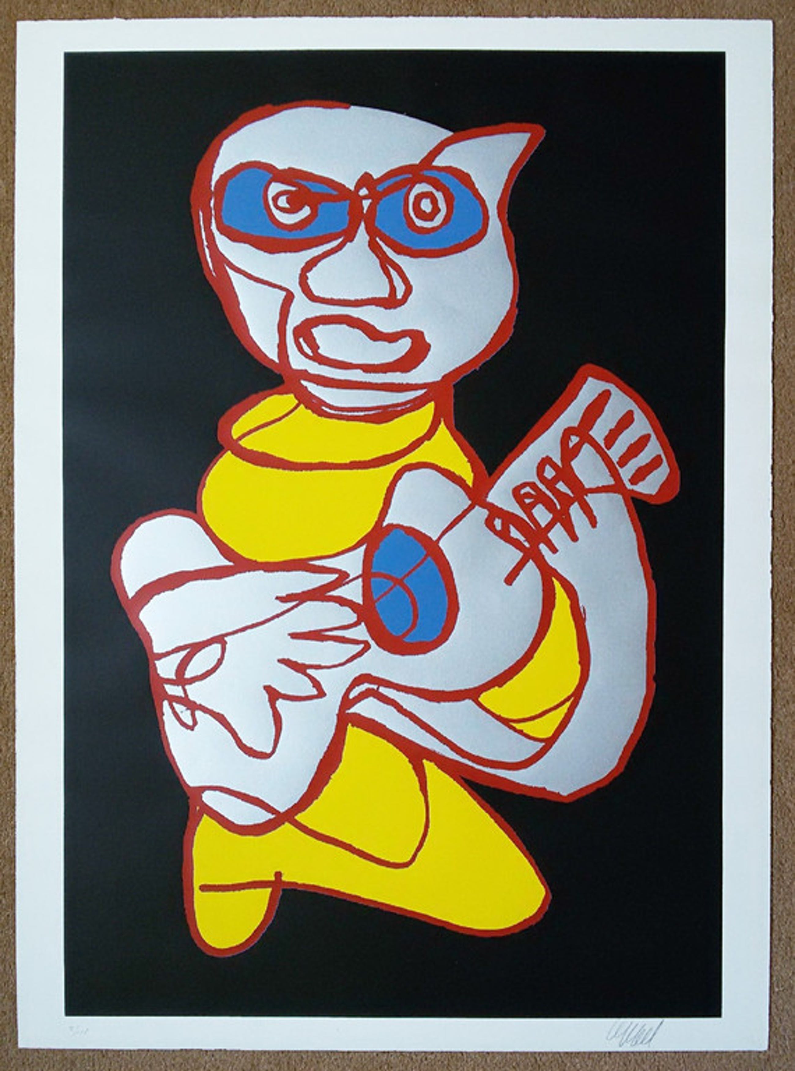 Prachtige, grote zeefdruk van Karel Appel uit 1977. Zeefdruk op Rives papier, met potlood gesigneerd en genummerd (I/XXV = 1/25), in verso stempel van London Arts Inc en nogmaals genummerd. Het volledige blad in eenvoudige houten lijst, achter glas, zonder passe-partout. Zeefdruk in uitstekende conditie, lijst in redelijk goede conditie.