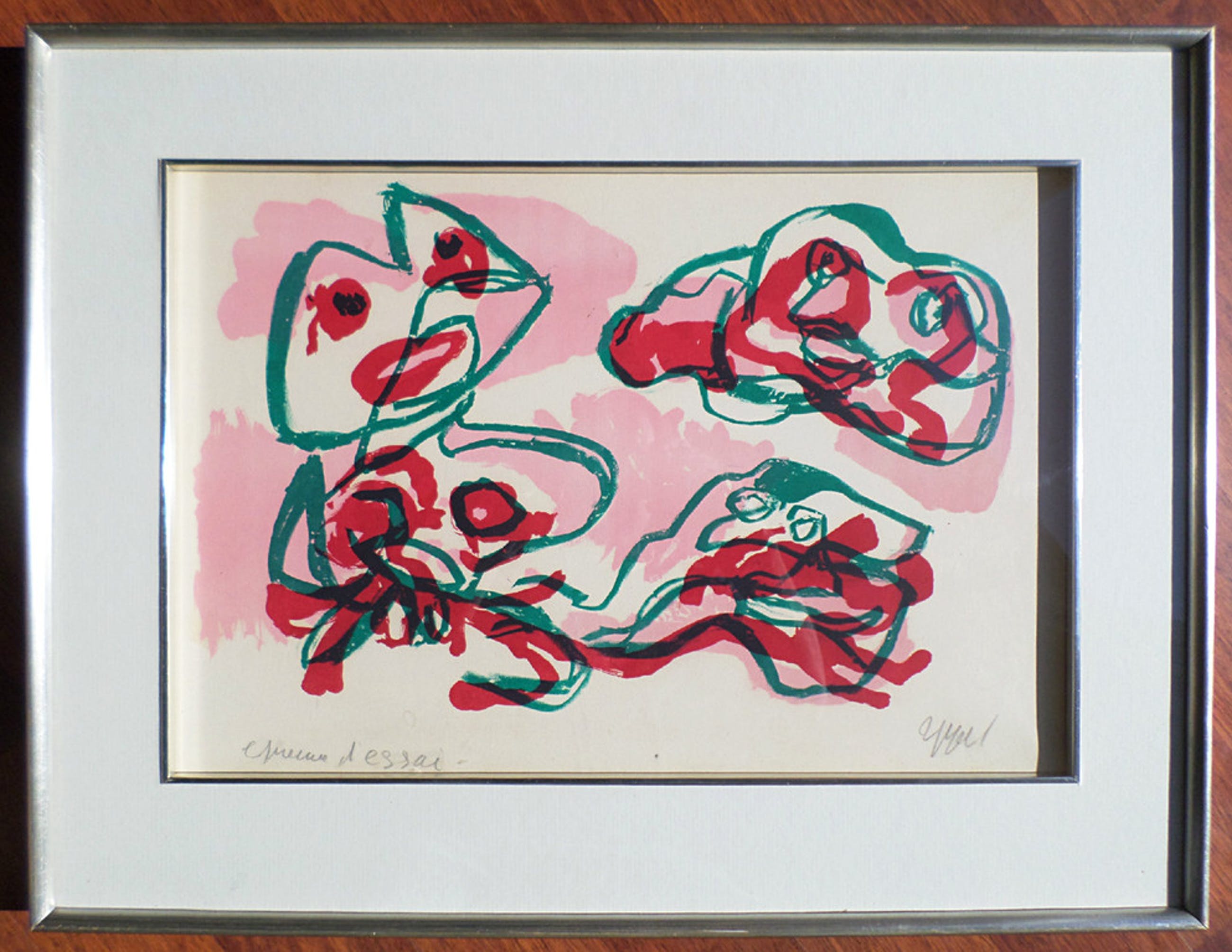 Prachtige litho van Karel Appel uit 1968. In mooie lijst, achter glas en zeer luxe passe-partout. Met potlood gesigneerd rechtsonder. Een proefprint (Epreuve d’Essai) in goede conditie.