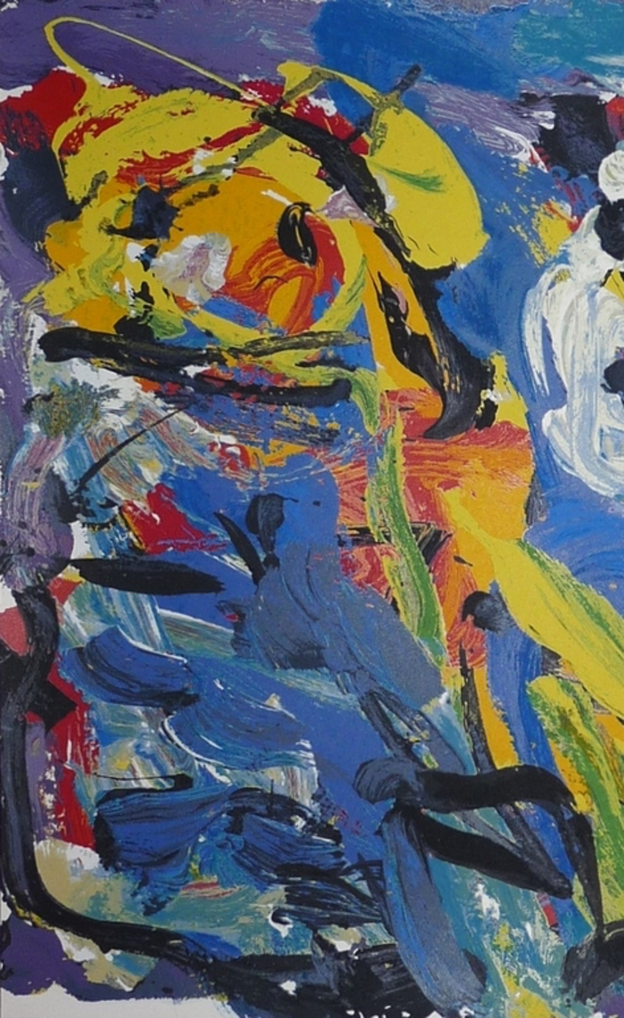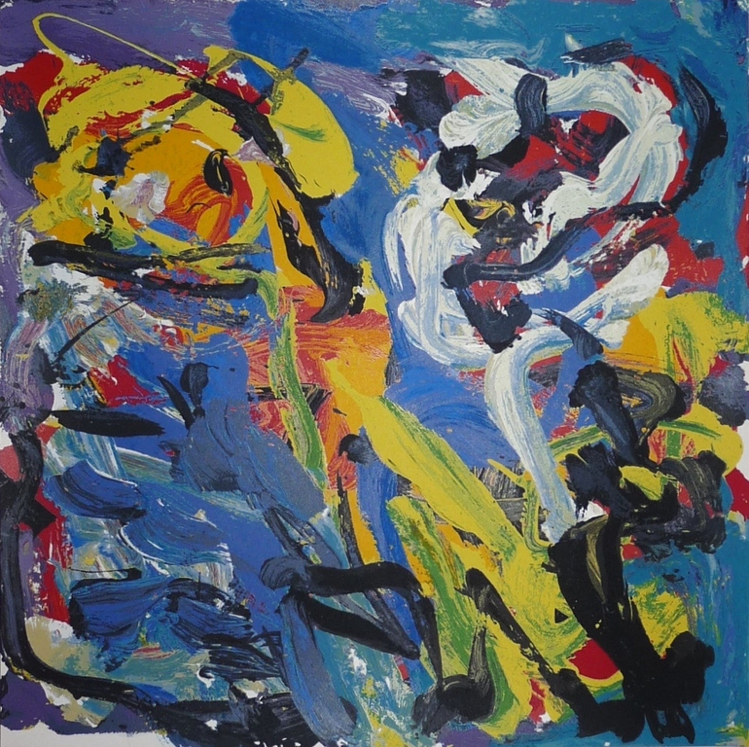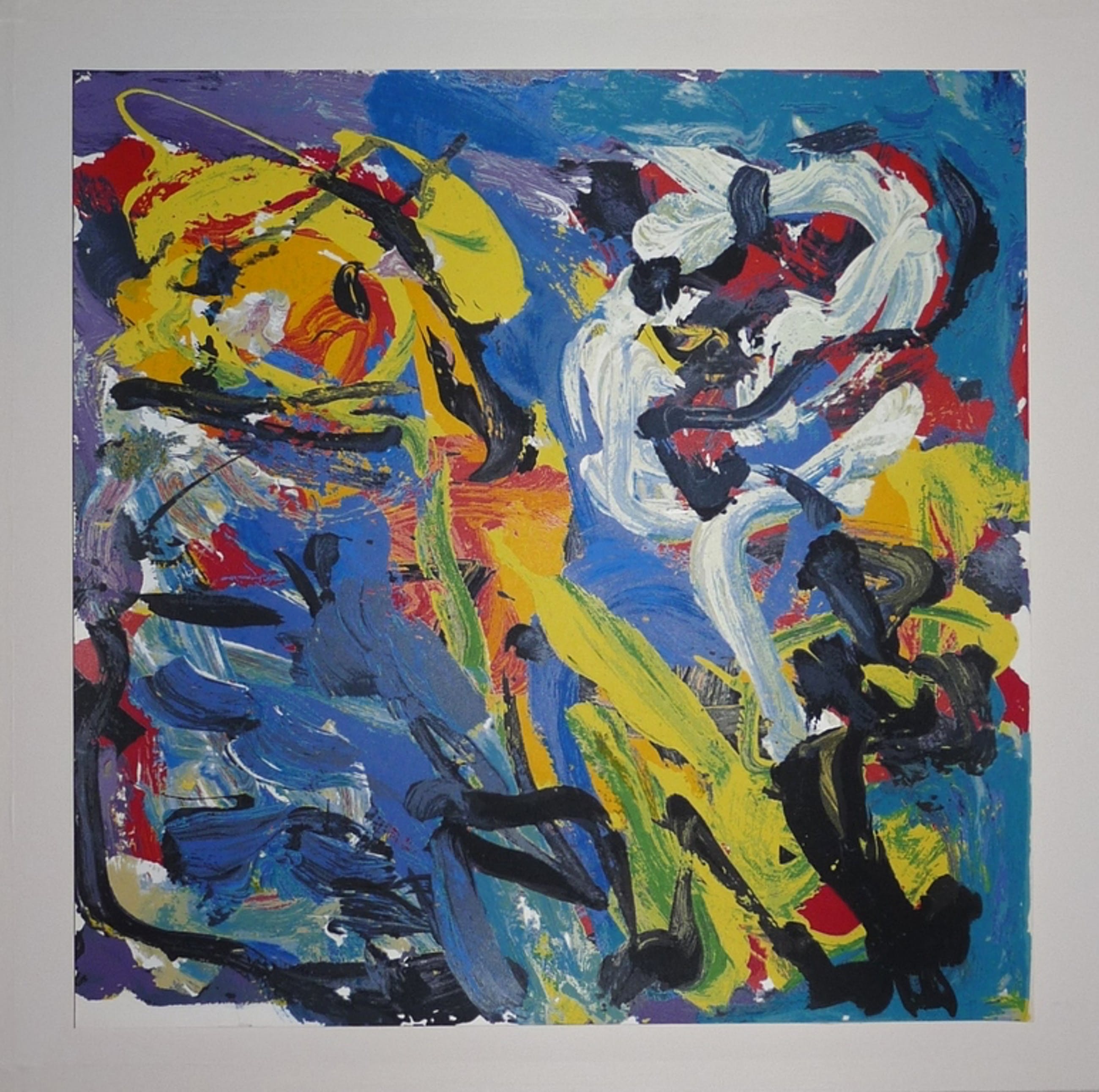 *Prachtige kleurenzeefdruk van Karel Appel met de titel: Spelend in het blauw, uit het jaar 1977. Het gaat hier om een proefdruk exemplaar uit de collectie van meesterdrukker Henk van der Vet die deze zeefdrukken voor Karel Appel drukte. Niet gesigneerd, maar de echtheid is voor 100% gegarandeerd.