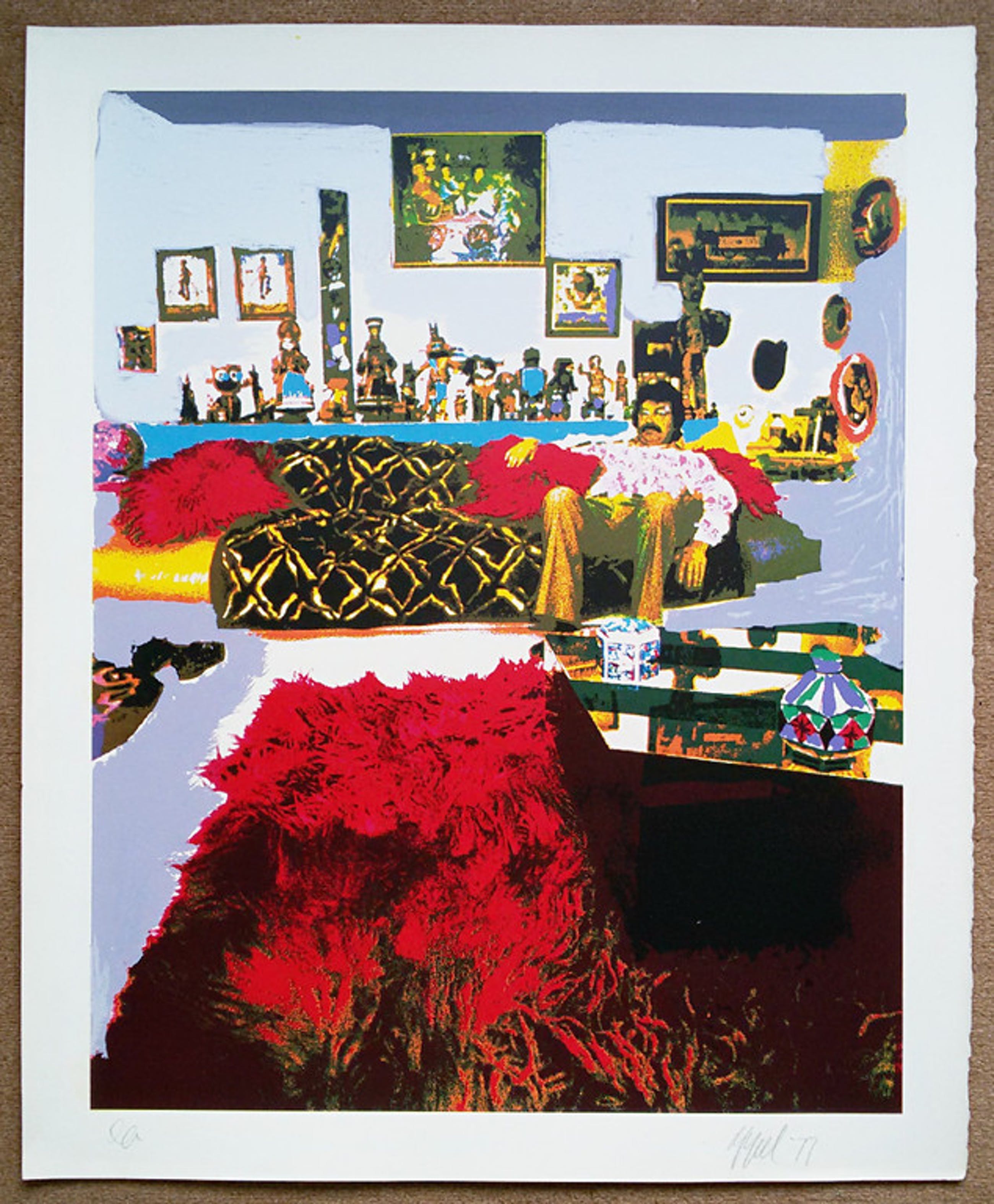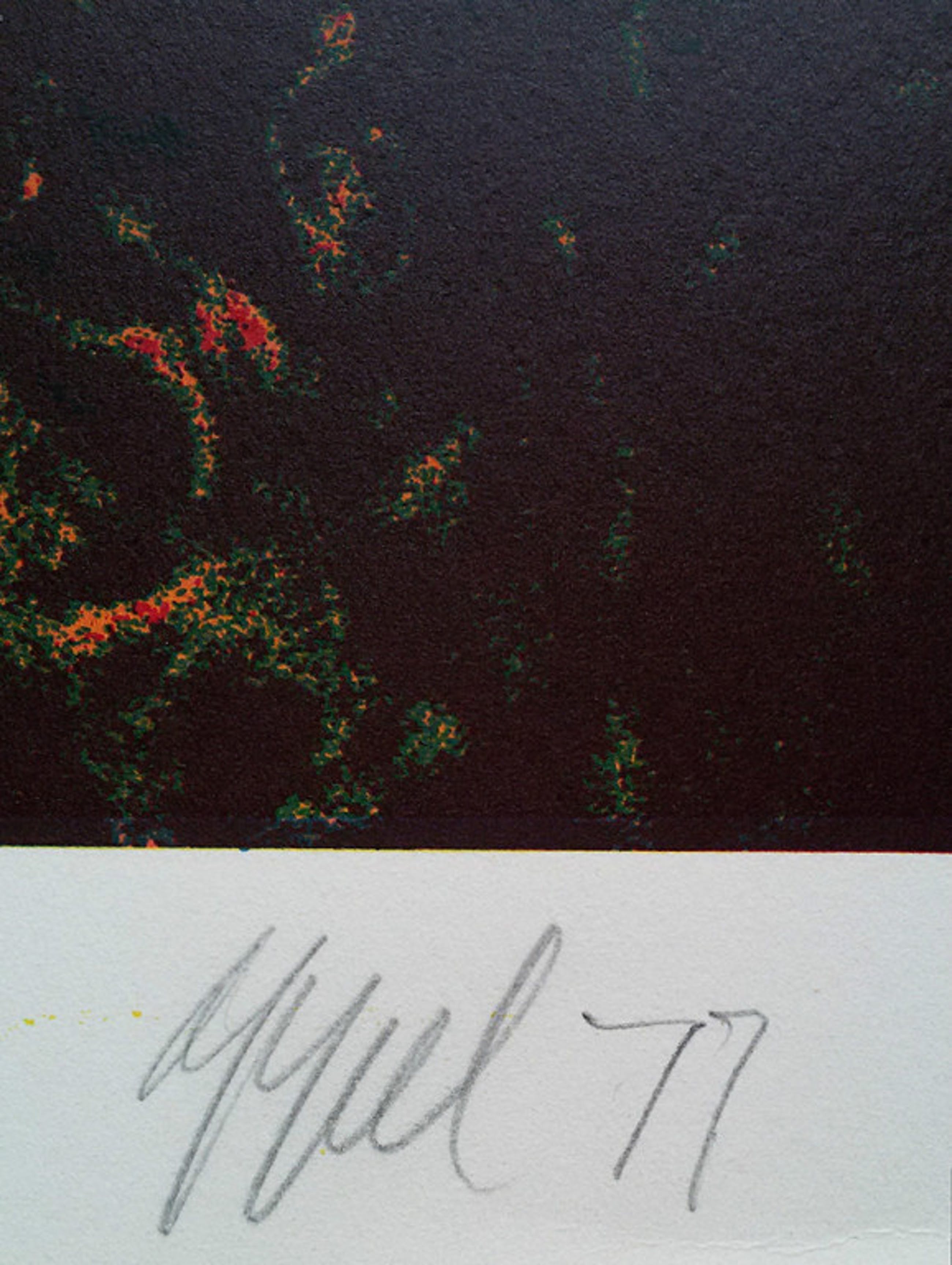 Zeefdruk van Karel Appel uit Seven Summer Days, een album dat hij samen met Henk van der Vet maakte in de jaren 1976/77. Zeefdruk op 350 grams Economos-Etching papier, met potlood gesigneerd en gedateerd rechtsonder, een E.A. (Épreuve d’Artiste) exemplaar met blindstempel van Henk van der Vet Screenprinting.