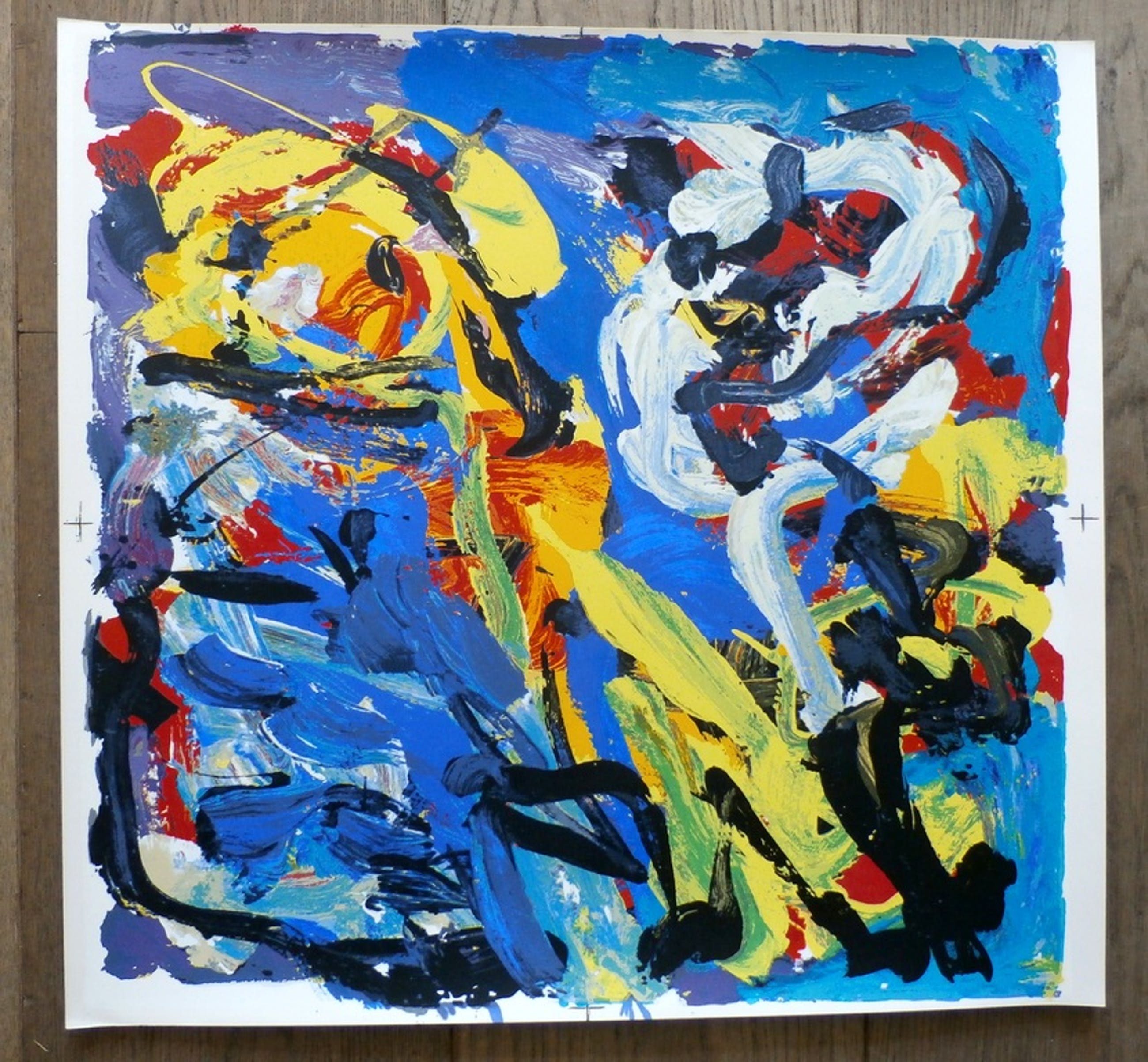 Karel Appel - zeefdruk: Spelend In Het Blauw; Jaar: 1977; zeefdruk uit de nalatenschap van Henk van der Vet (drukker); achterop het blad zit ook een notarieel atelierstempel; dit werk is niet gesigneerd; de gesigneerde zeefdruk had een oplage van 300 stuks; afm. blad: h52 x b54 cm; afm. voorstelling: h50 x b50 cm; literatuur: Karel Apel, Henk van der Vet, Christian Dotremont, van Spijk uitgeverij, 1981.