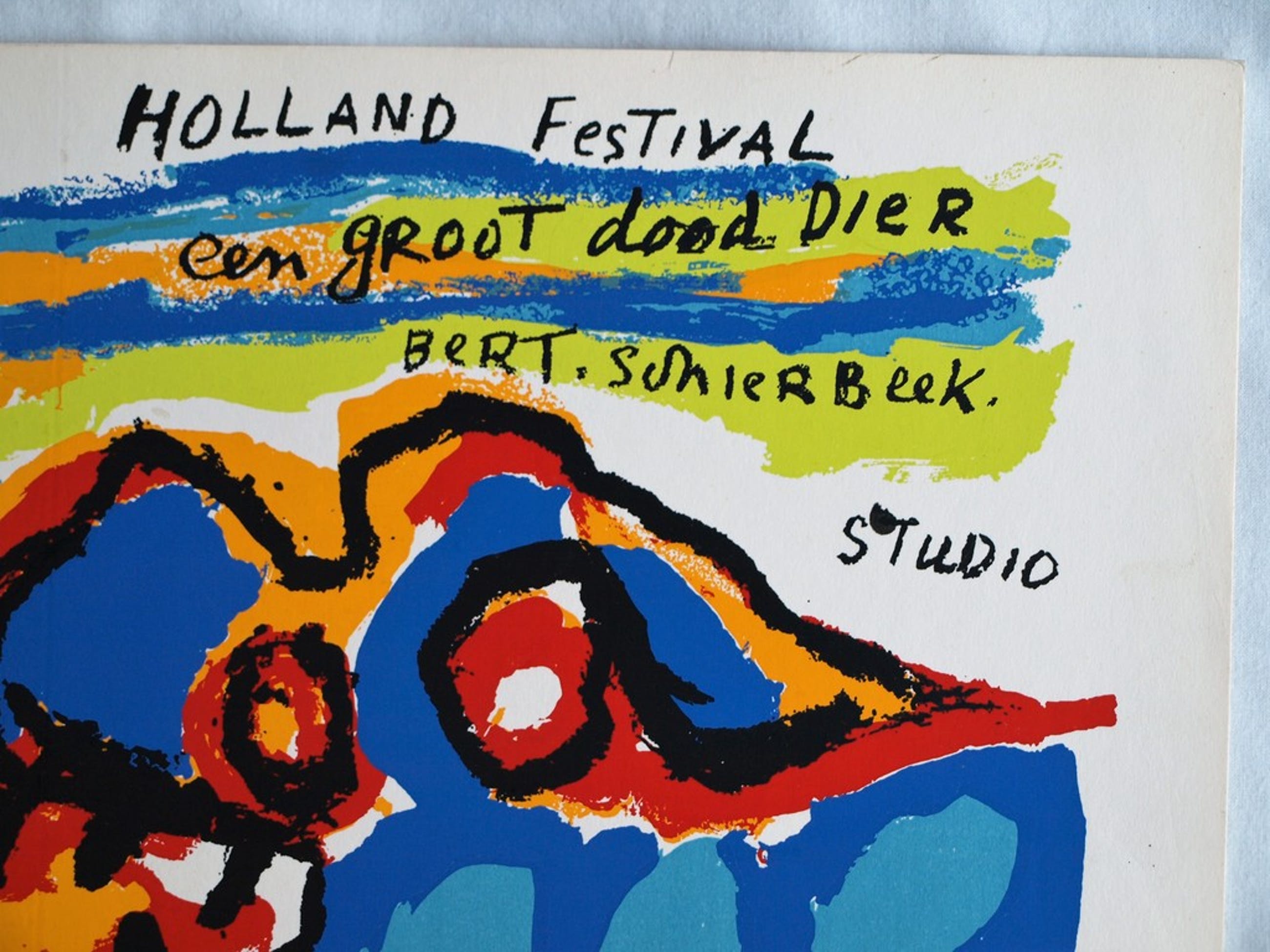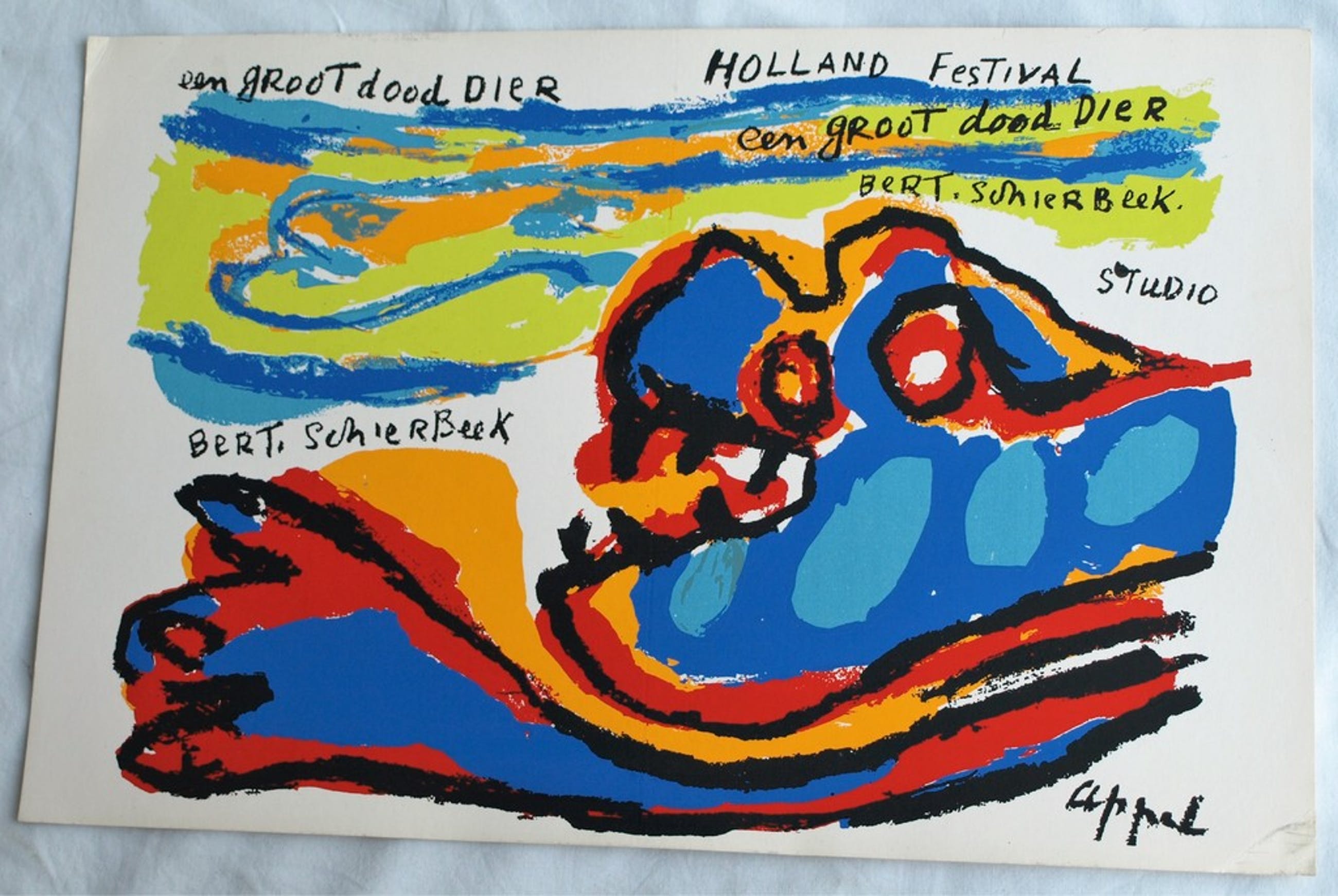Deze zeefdruk op dun karton is gemaakt voor het programmaboekje van de theatervoorstelling “Een groot dood Dier” van Bert Schierbeek, uitgevoerd door Toneelgroep Studio tijdens het Holland Festival in 1963.