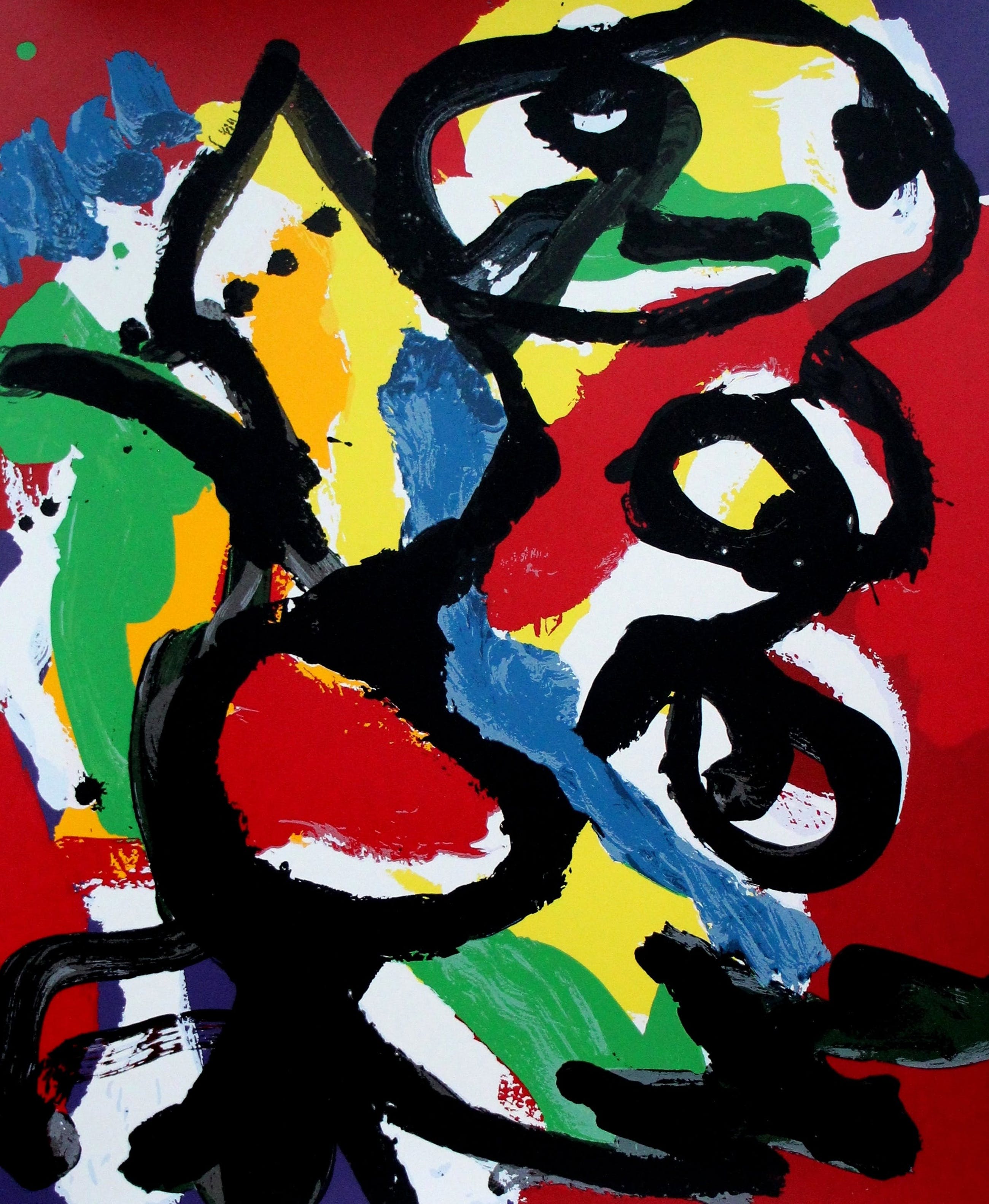 Fraaie kleuren zeefdruk van Karel Appel uit 1977. Titel: Seven Summer Days. Afmeting blad: H85 x b70 cm. Afmetingen voorstelling: H72.5 x b59.5cm. Het werk is rechts onderaan, met potlood, gesigneerd door de kunstenaar.