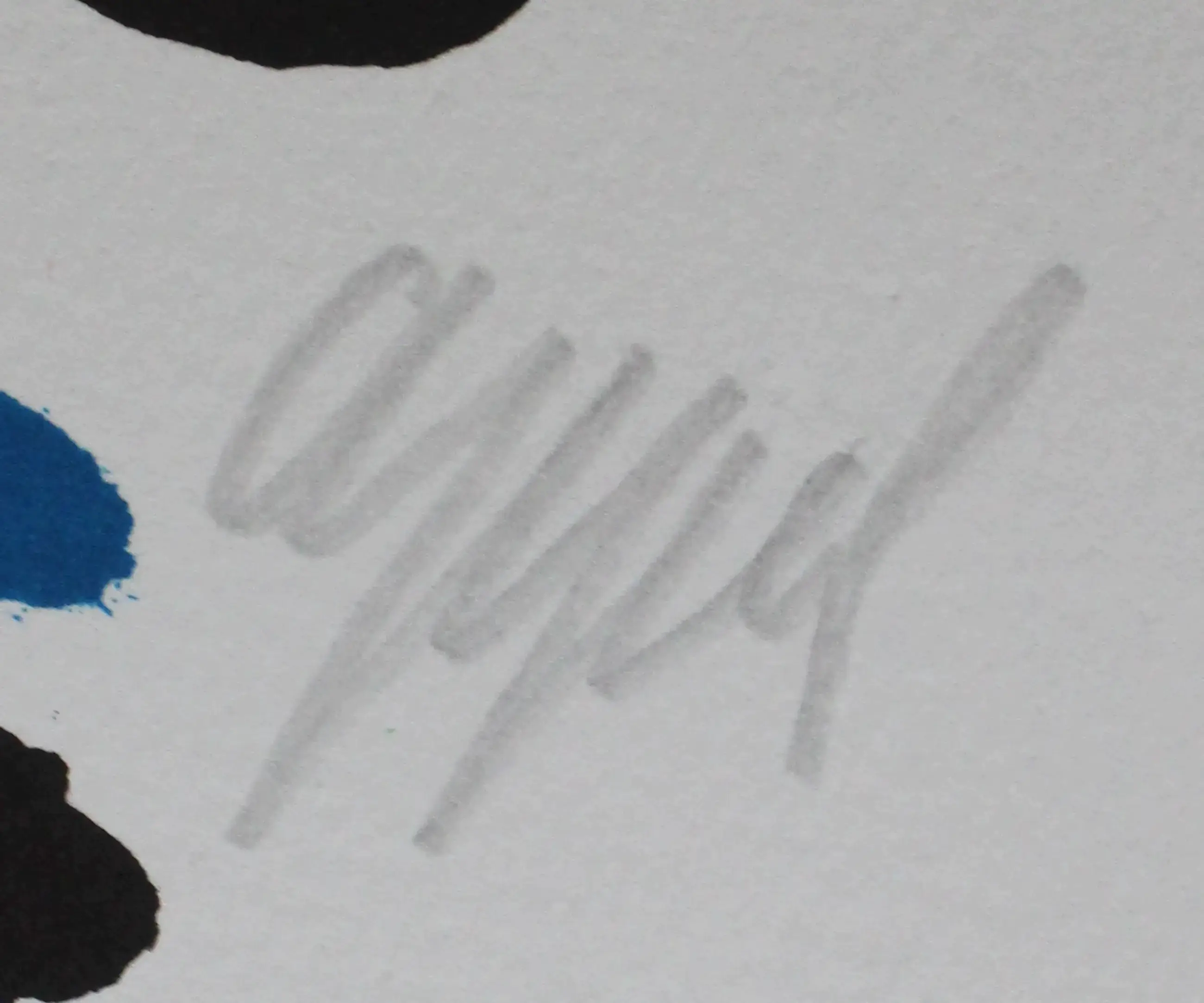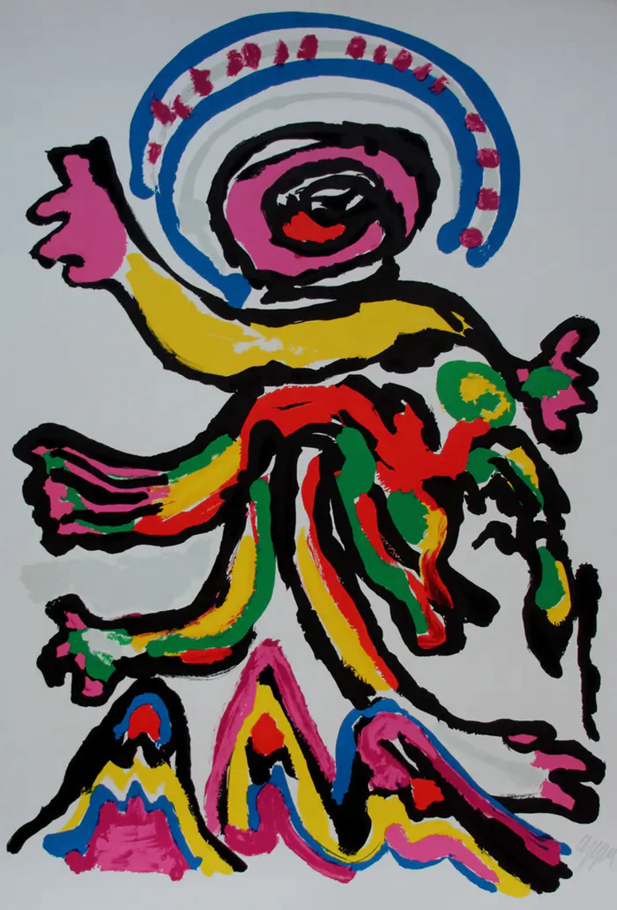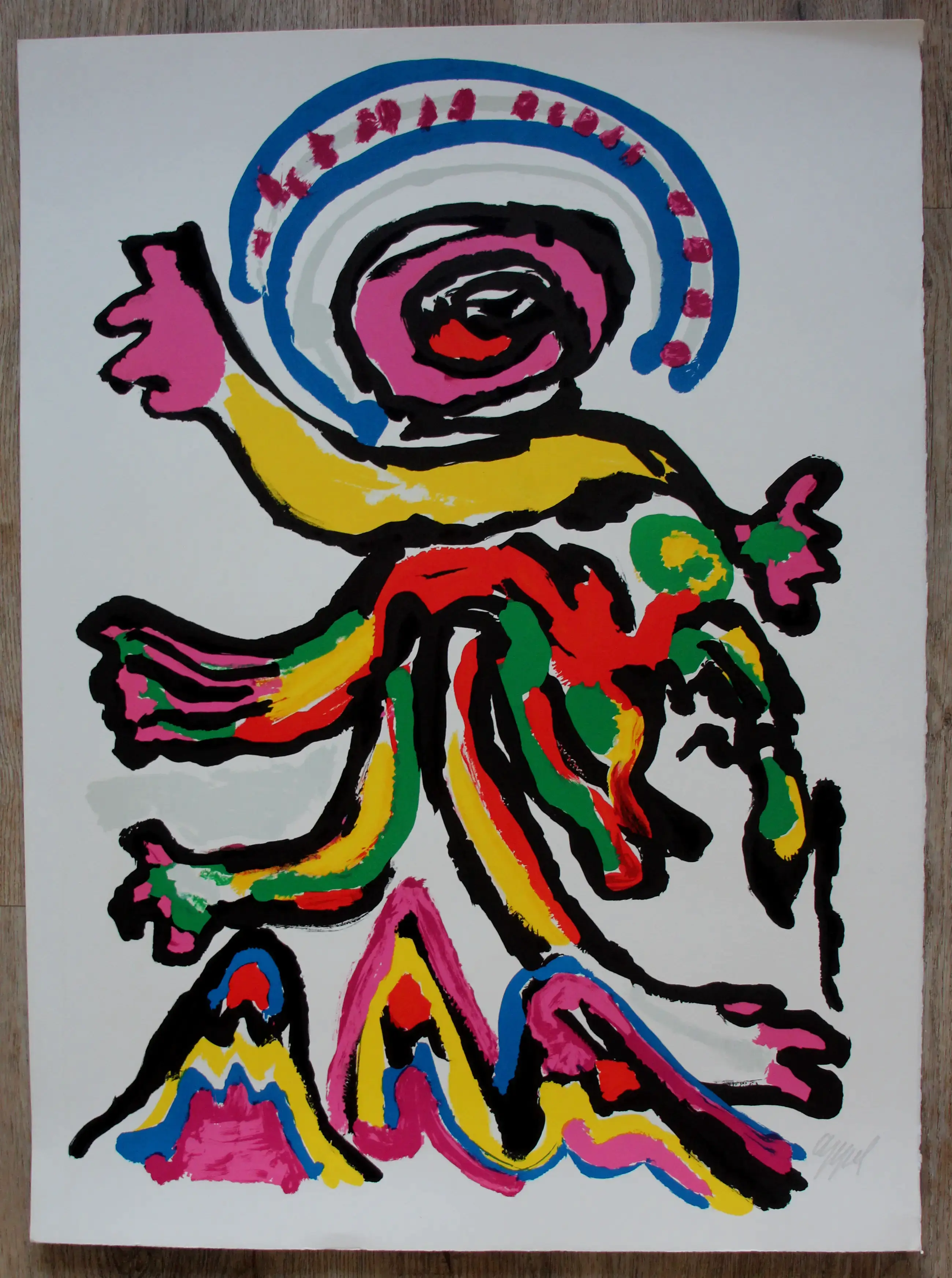 Kleurrijke zeefdruk van Karel Appel. Titel: Tantrika II. Afmetingen blad: H76 x b56cm. Afmetingen voorstelling: H71 x b50cm. Het werk is rechts onderaan gesigneerd door de kunstenaar. De authenticiteit van het aangeboden werk wordt volledig gegarandeerd. Een certificaat van echtheid kan, op aanvraag, worden gemaild.