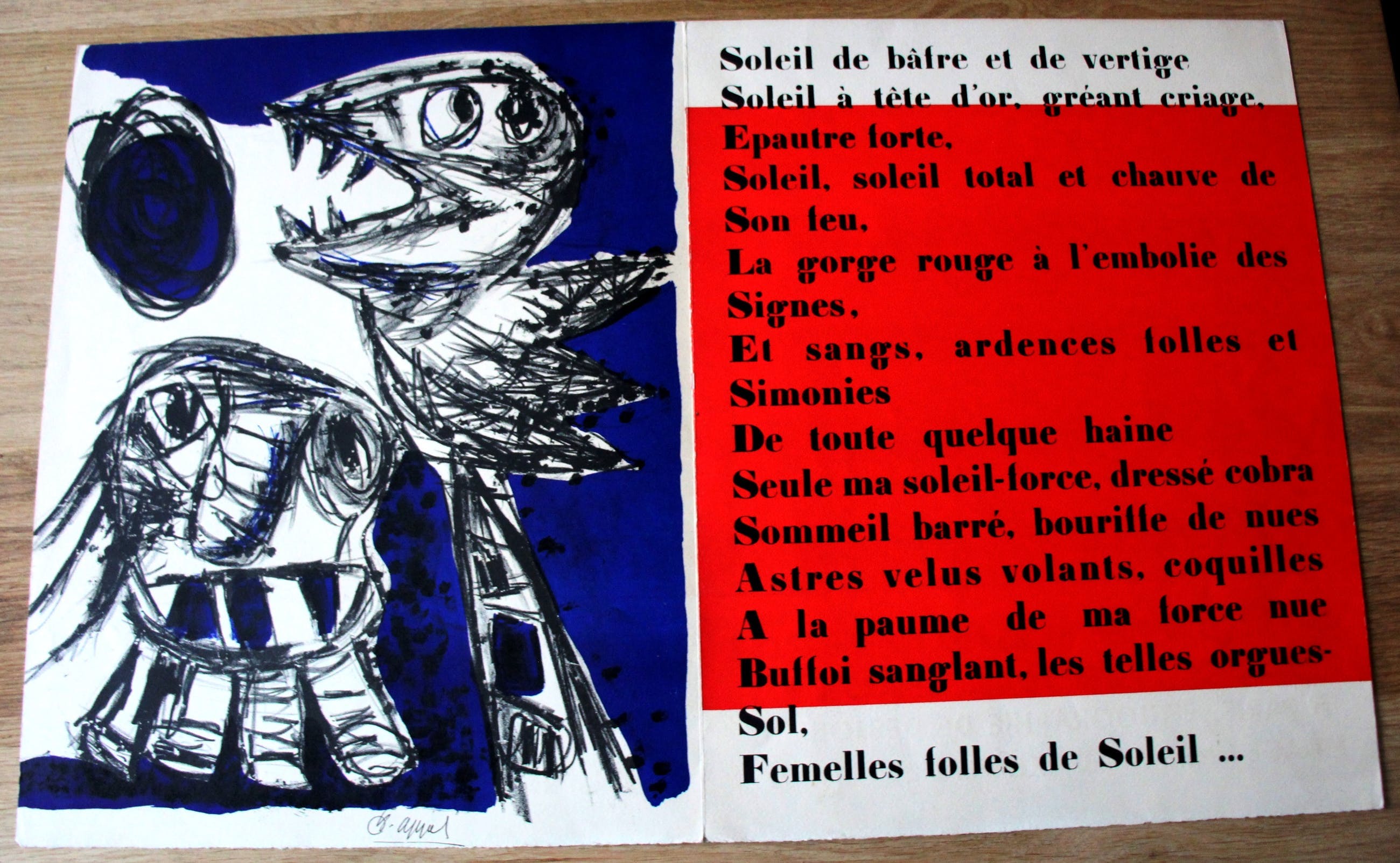 Zeer bijzondere litho van Karel Appel met een gedicht van Emmanuel Looten uit 1954! In zeer goede staat! Titel: Haine. Jaar: 1954. Afmetingen blad litho : H42 x b33cm. Afmetingen blad gedicht: H42 x b 33 cm. Het werk is onderaan, gesigneerd met potlood, door de kunstenaar. De authenticiteit van dit werk wordt volledig gegarandeerd. Een certificaat kan, op aanvraag, worden gemaild.