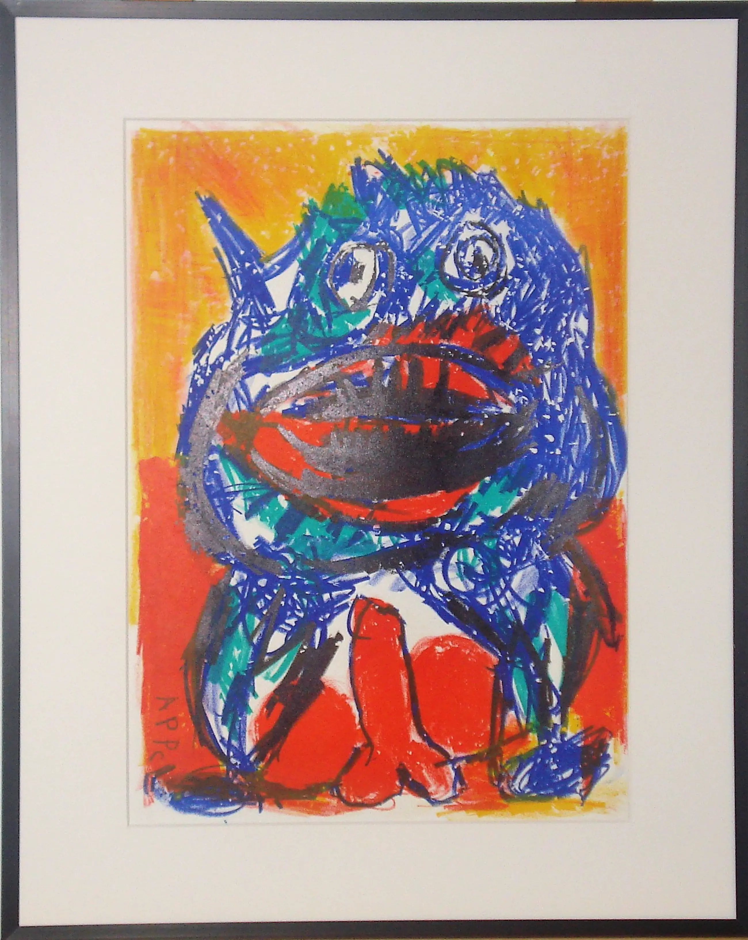 Lithografie van Karel Appel Jaar: 1964 Uit de portfolio One Cent Life Aan het begin van de jaren '60 bracht Walasse Ting een groep kunstenaars (o.a. Lichtenstein, Karel Appel, Andy Warhol en Mel Ramos) bijeen, die gevangen zaten in het moment tussen het abstract expressionisme en de pop-art. In het boek '1 Cent Life' brengt Walasse Ting deze kunstenaars samen, met zijn beeldende kunst en zijn gedichten. Originele lithografie op wit geweven papier. Gedrukt door Maurice Beaudet in Parijs en gepubliceerd door E. W. Kornfeld, uit Bern, Zwitserland. Editie van 2000, niet ondertekend zoals uitgegeven in de reguliere editie van '1 ¢ Life' portfolio van Walasse Ting uit 1964.