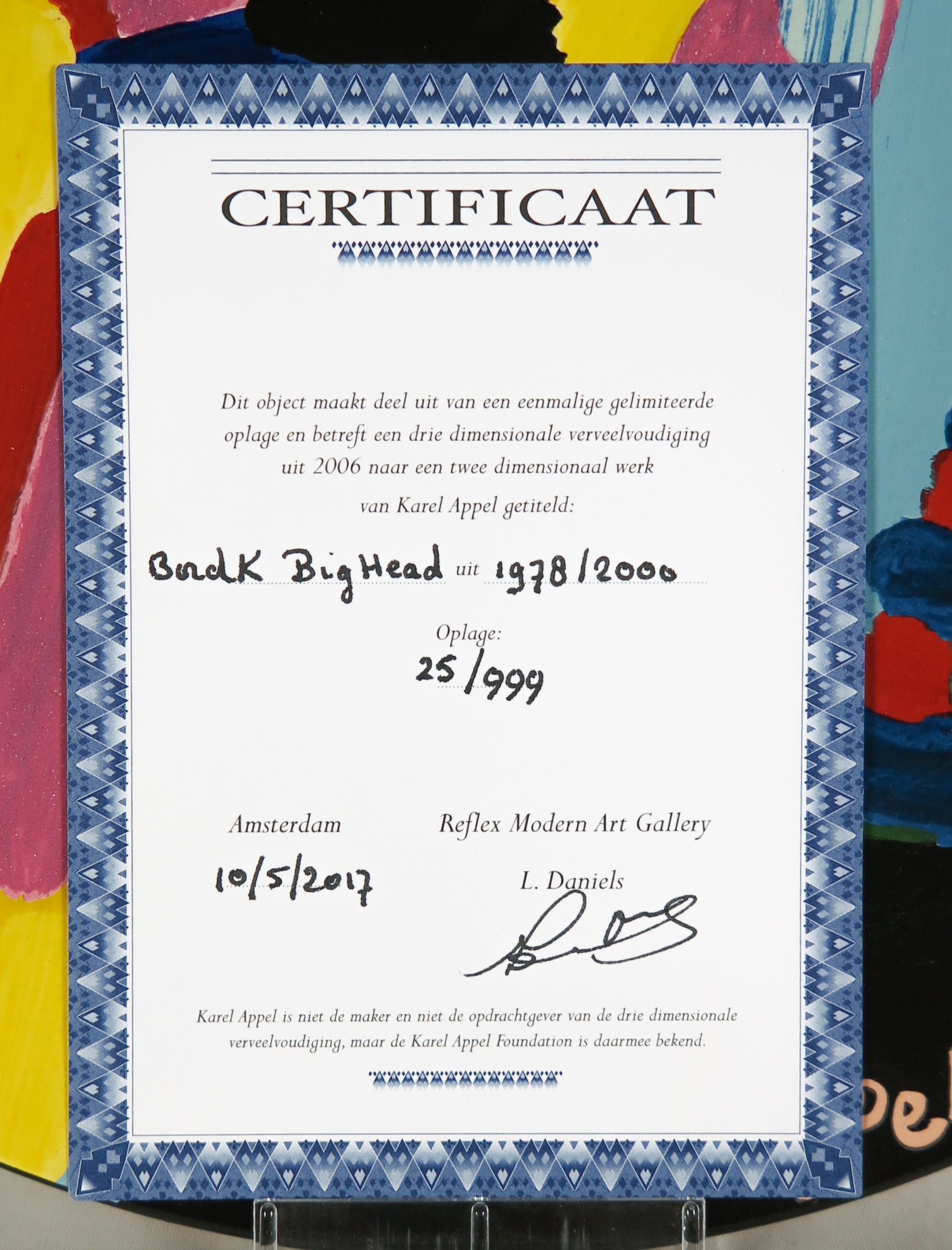 Aardewerken bord met een voorstelling van 'Big Head' van Karel Appel, uitgegeven door Reflex Modern Art Gallery in een gelimiteerde oplage van 999 exemplaren.