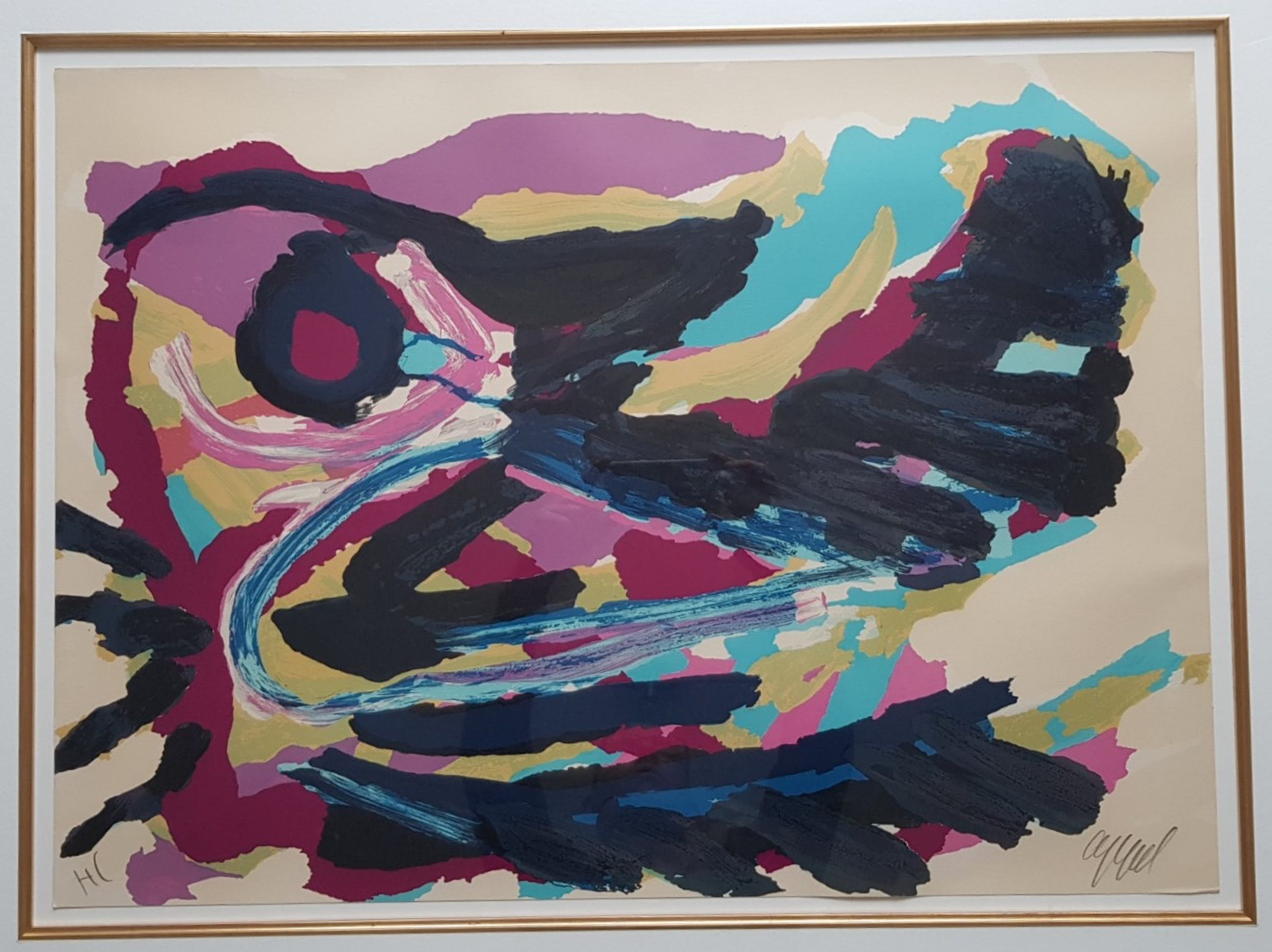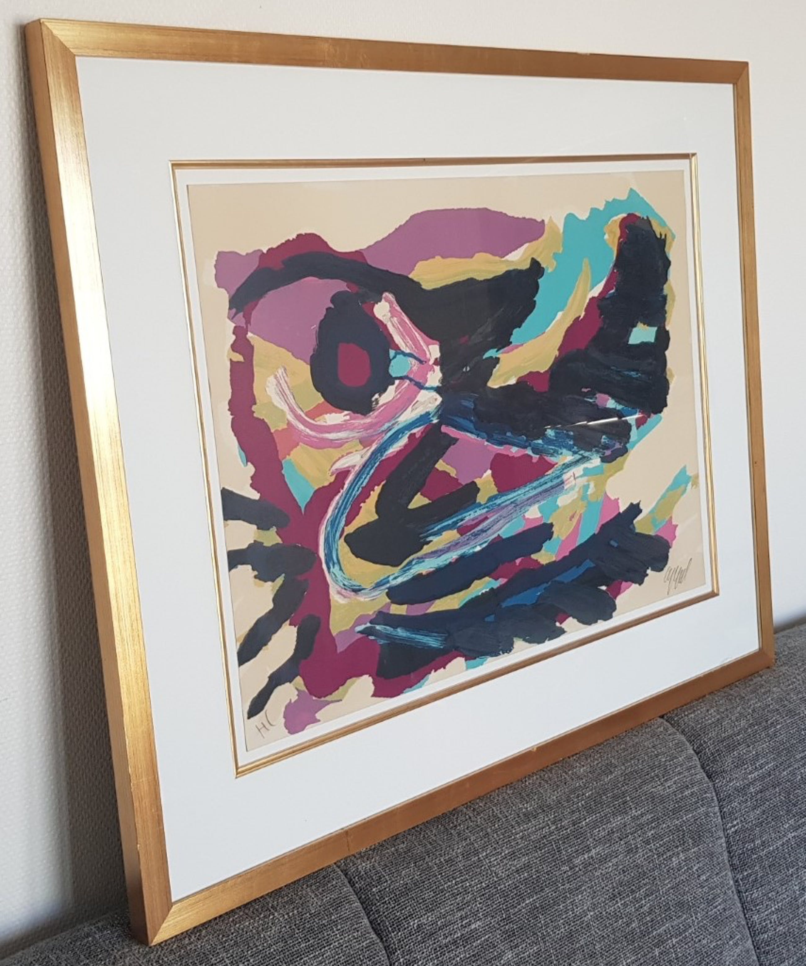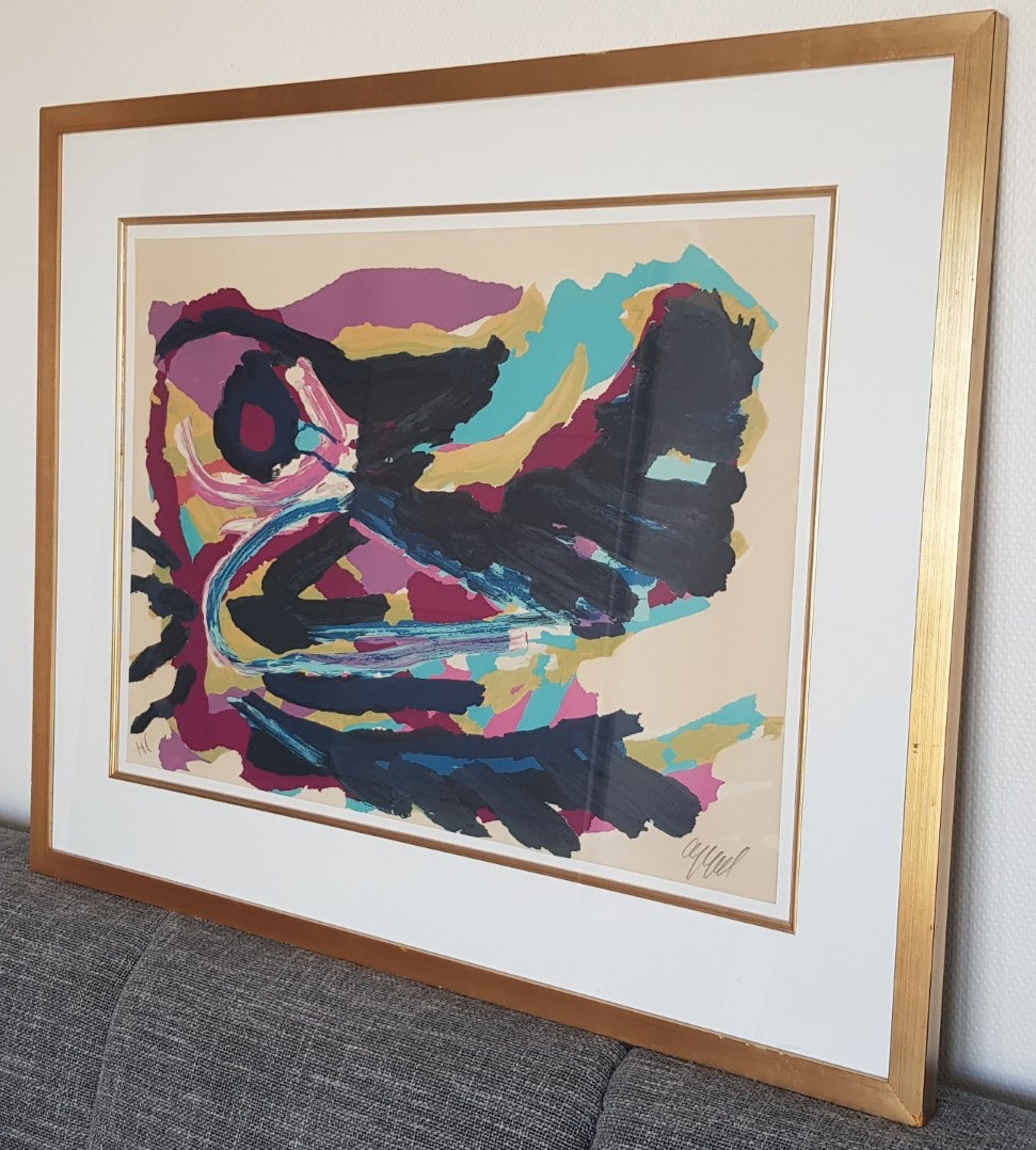 'Nesting Bird' is een levendige en zeldzame litho van Karel Appel met een mooi en warm kleurgebruik. Het werk is handgesigneerd met potlood en het gaat hier om een HC exemplaar. Schitterend ingelijst achter dik Frans passe-partout met gouden rand.