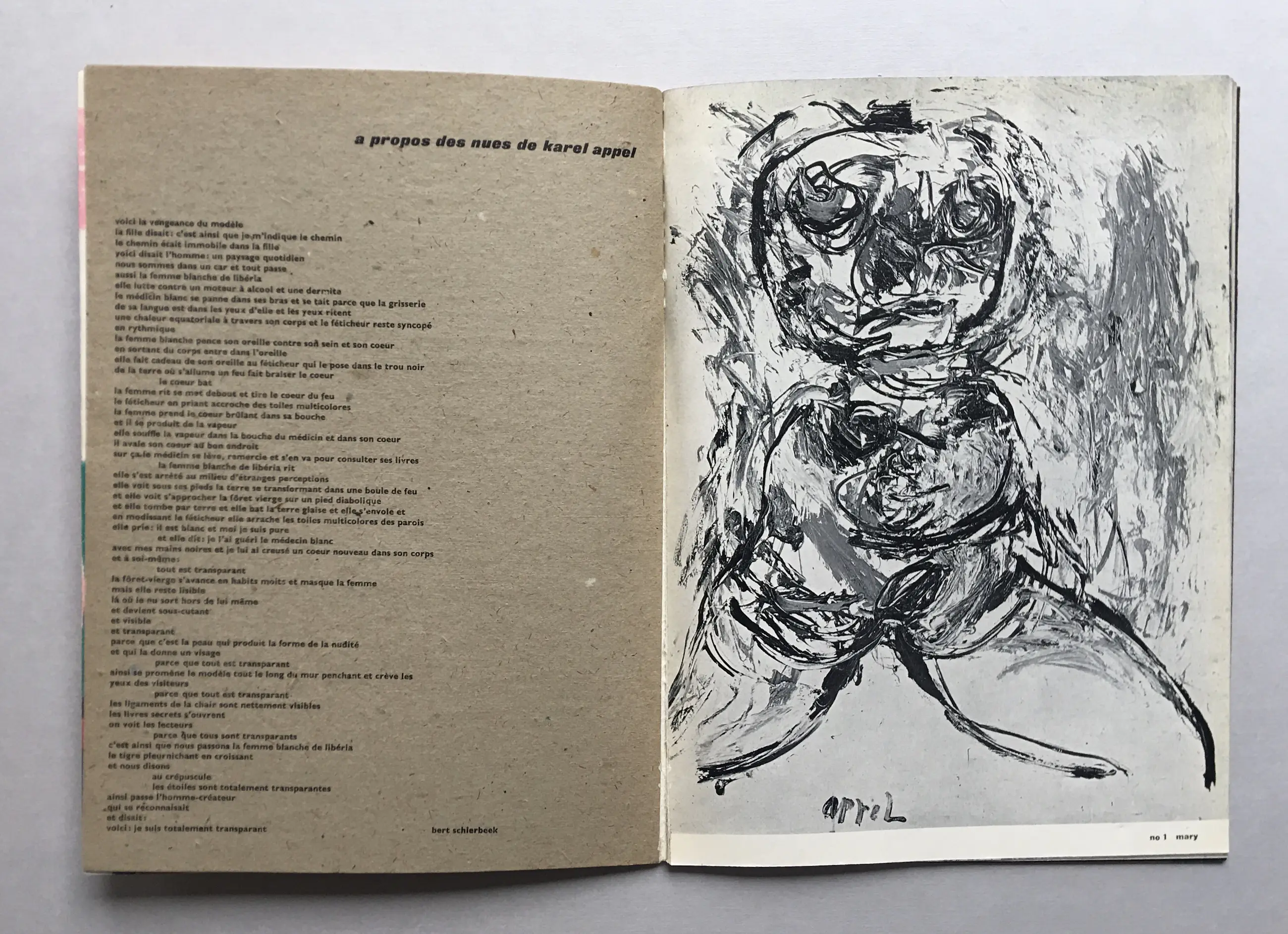 Uitgegeven ter gelegenheid van drie tentoonstellingen van Karel Appel - in Zürich (1963), Parijs en Londen (beide 1964). Met teksten gedrukt op bruin vezelpapier getiteld 'a propos des nues de karel appel' ('op Appels naakten'), door Bert Schierbeek, gedrukt in het Engels, Frans en Duits. Een lijst van werken en een biografie zijn achterin opgenomen.