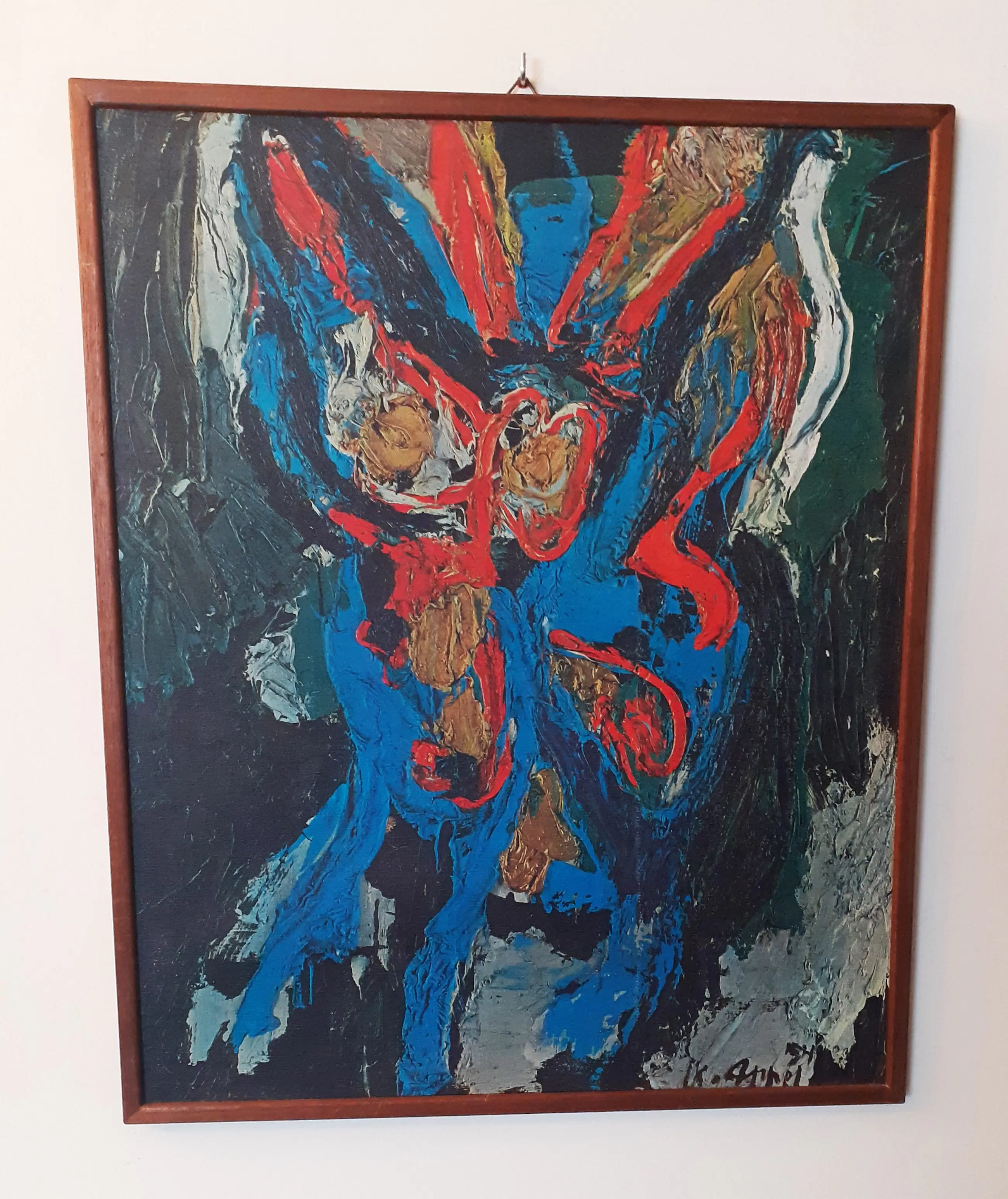 Zeldzame vroege oleografie* op linnen van Karel Appel naar het origineel (in 2008 in de VS nog geveild voor bijna 50. 000 euro). Het linnen doek zit netjes op een houten frame bevestigd.