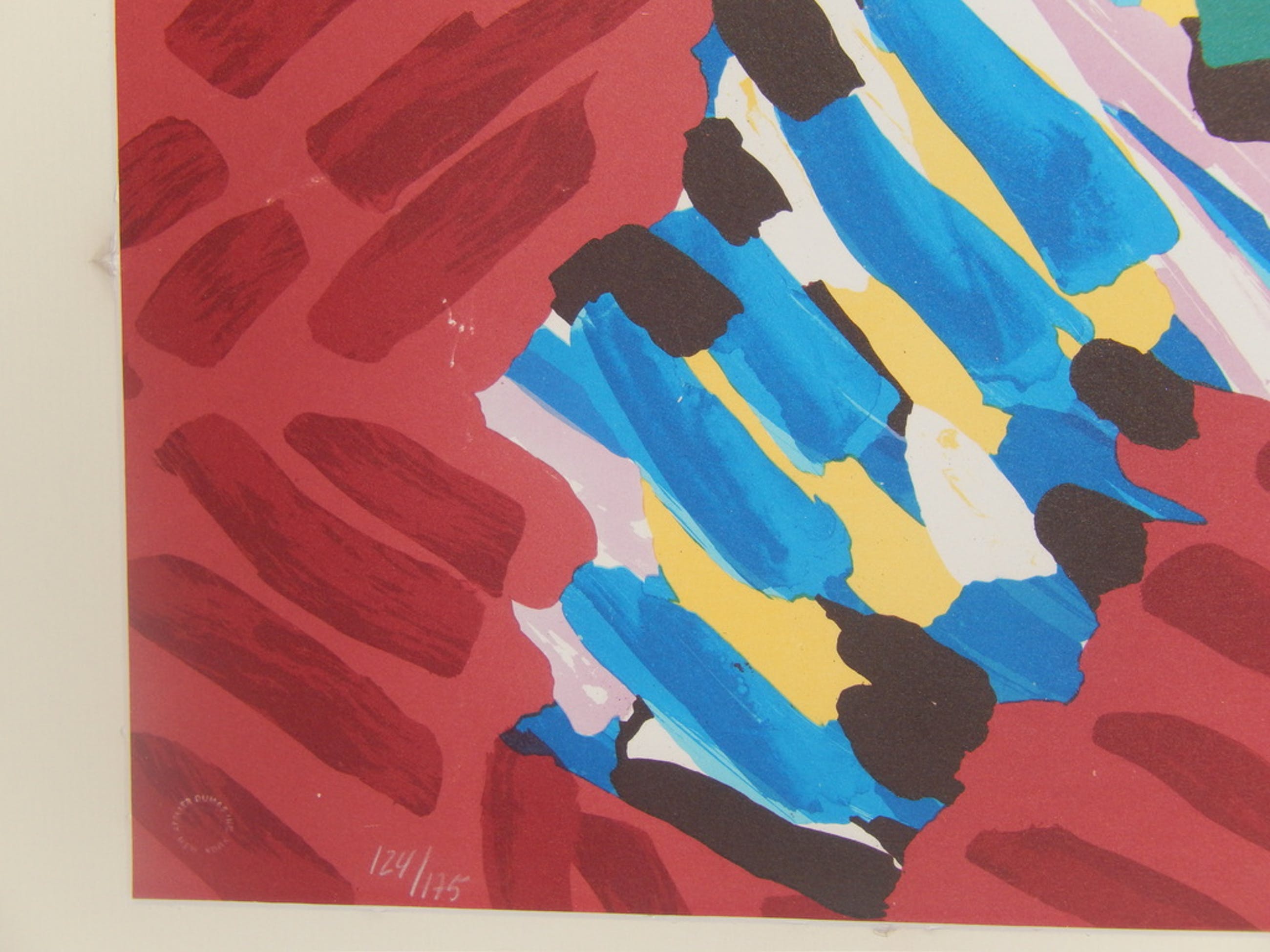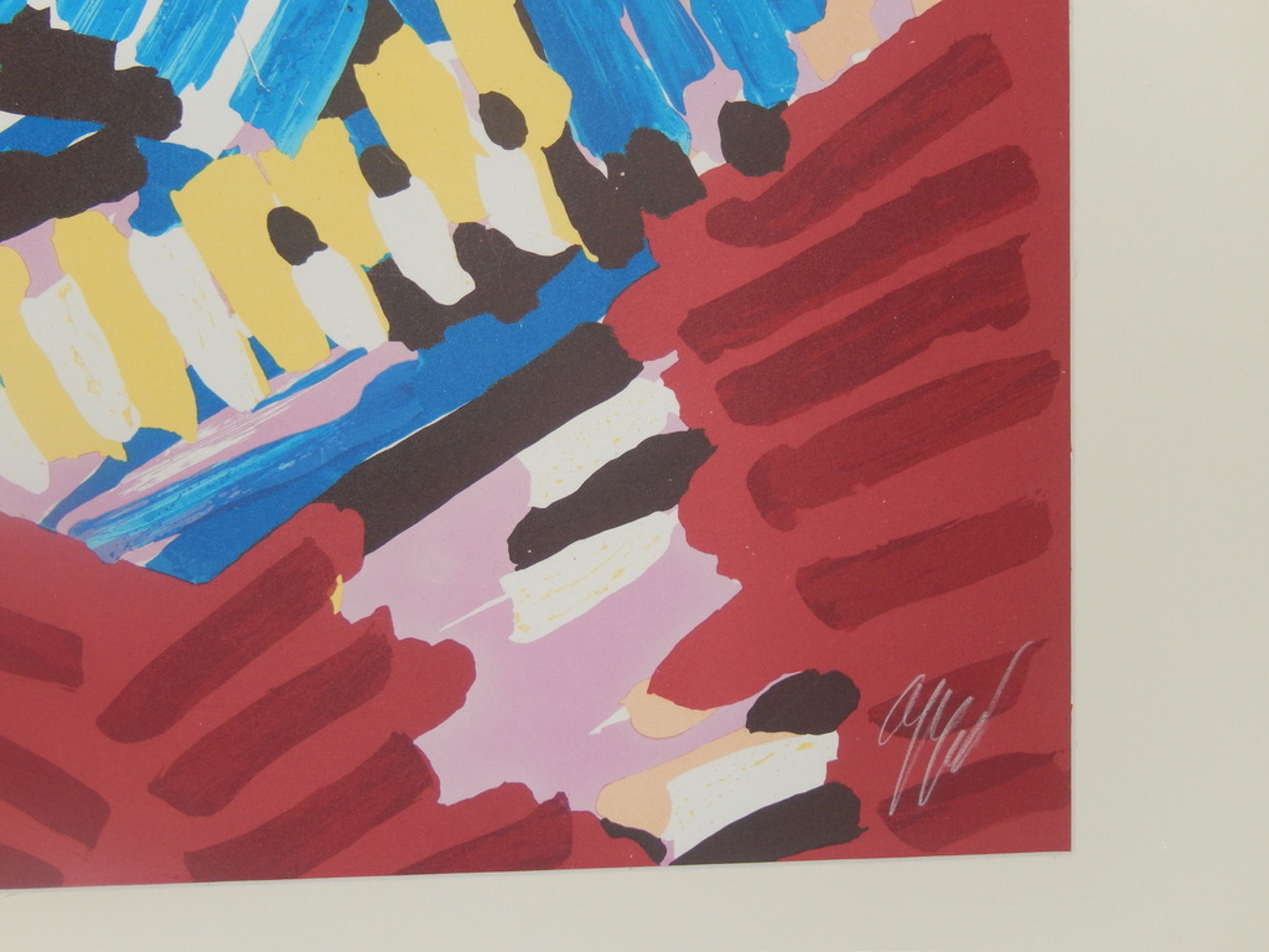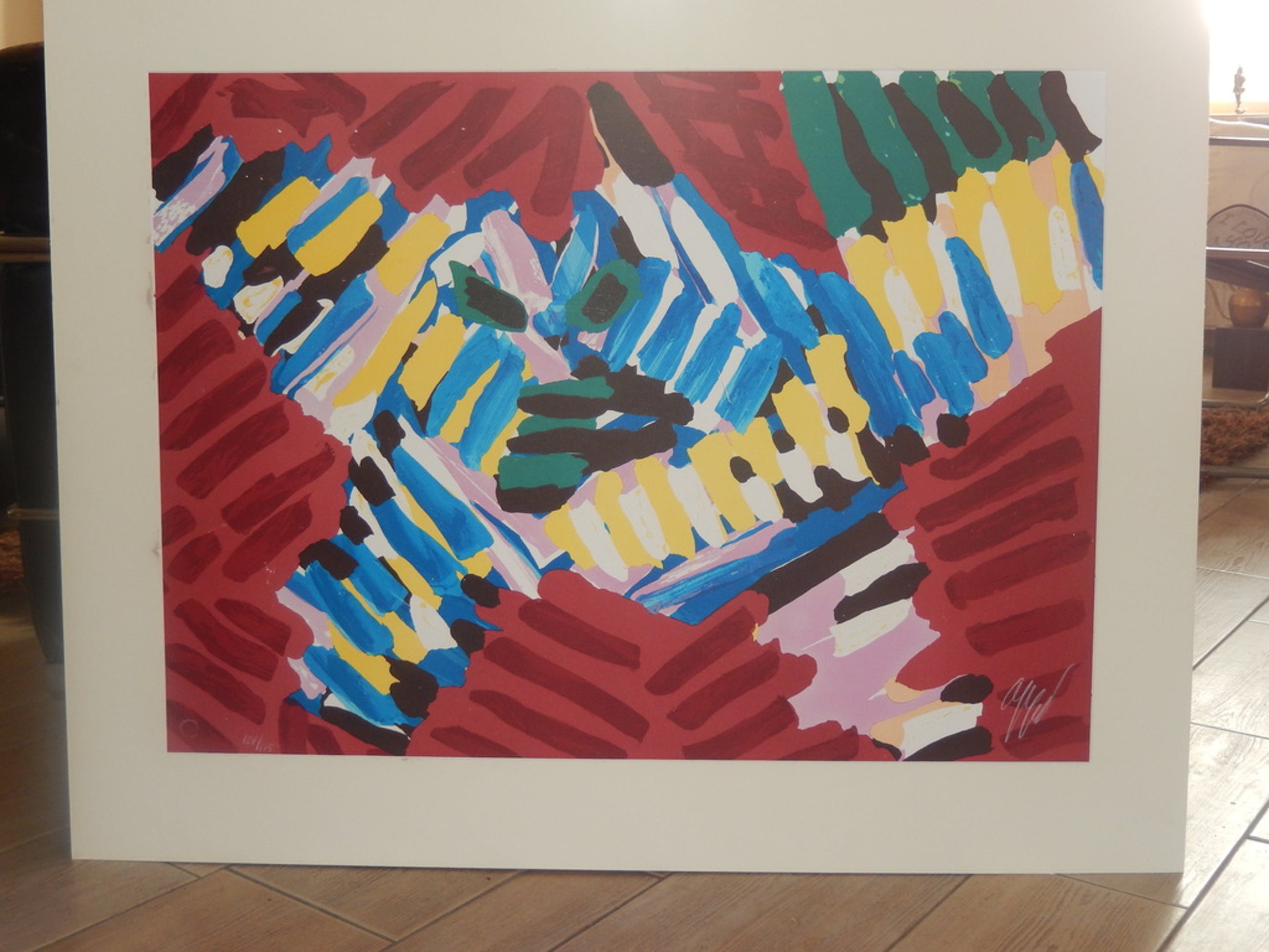 Uit deze periode komt ook deze zeefdruk Payage Visage uit de beroemde streepjes serie. Gesigneerd en genummerd. Beeldformaat 76 x 56 cm. De zeefdruk heeft een met het blote oog nauwelijks zichtbare beschadiging. Het passepartou zou ook vernieuwd kunnen worden. Voor de beschadiging is deze zeefdruk geschat op een waarde tussen 650 en 1150 Euro.