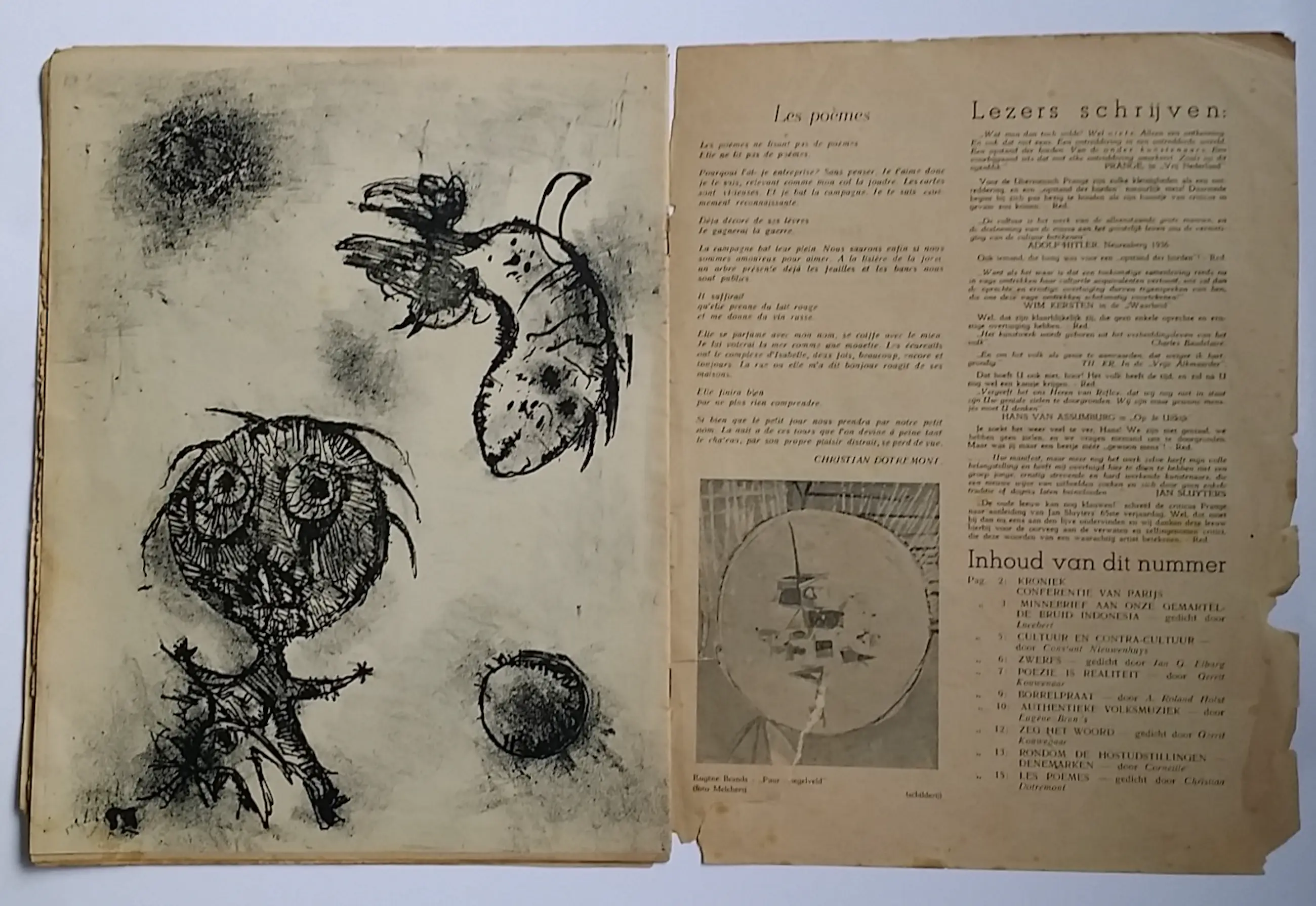Papieren omslag, 30 x 23 cm. Met houtsnede van Jacques Doucet. 18 pagina's met 4 originele zwart/wit litho's (fullpage en drukgesigneerd) van: Corneille, Eugène Brands, Anton Rooskens en Theo Wolvecamp.