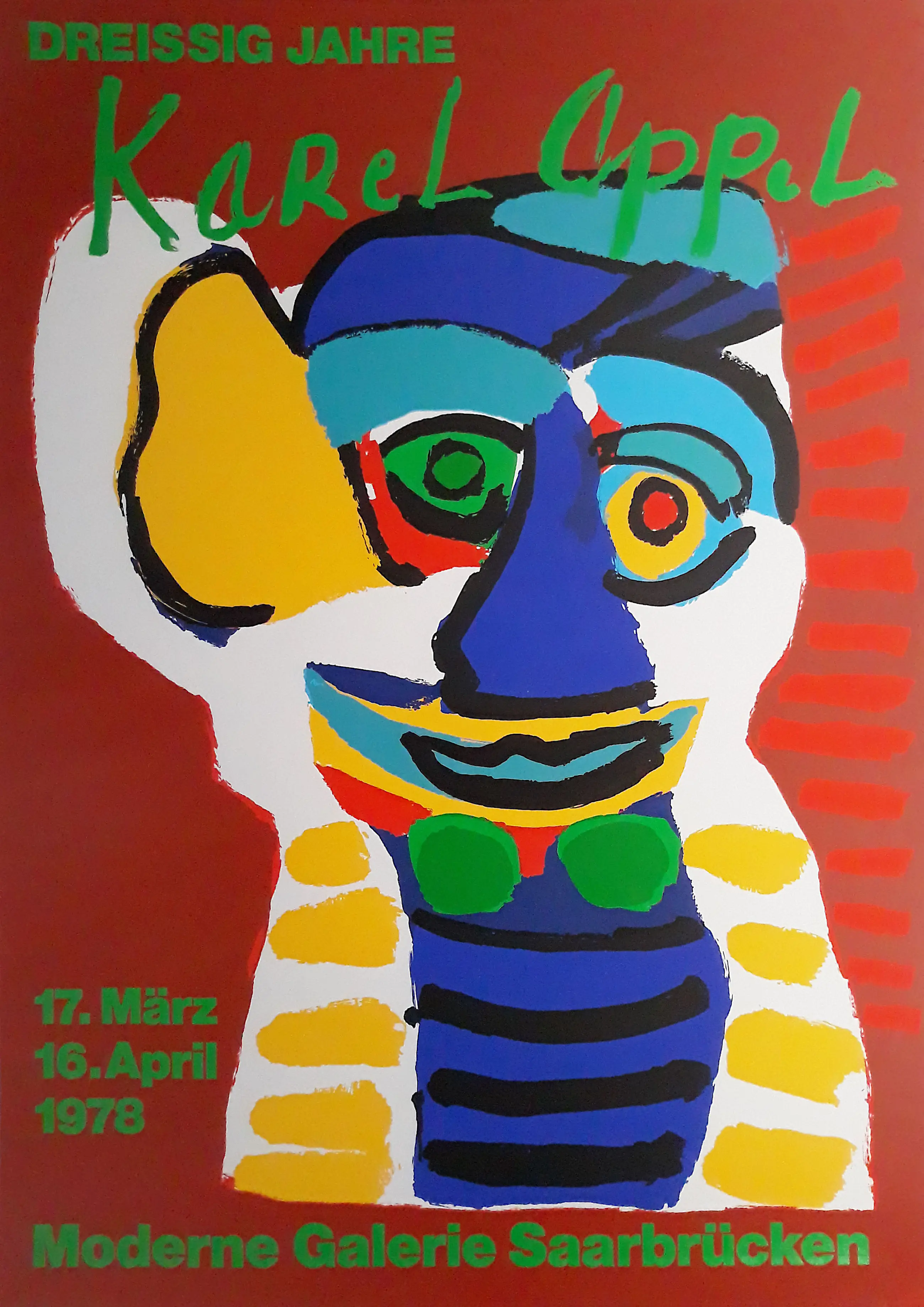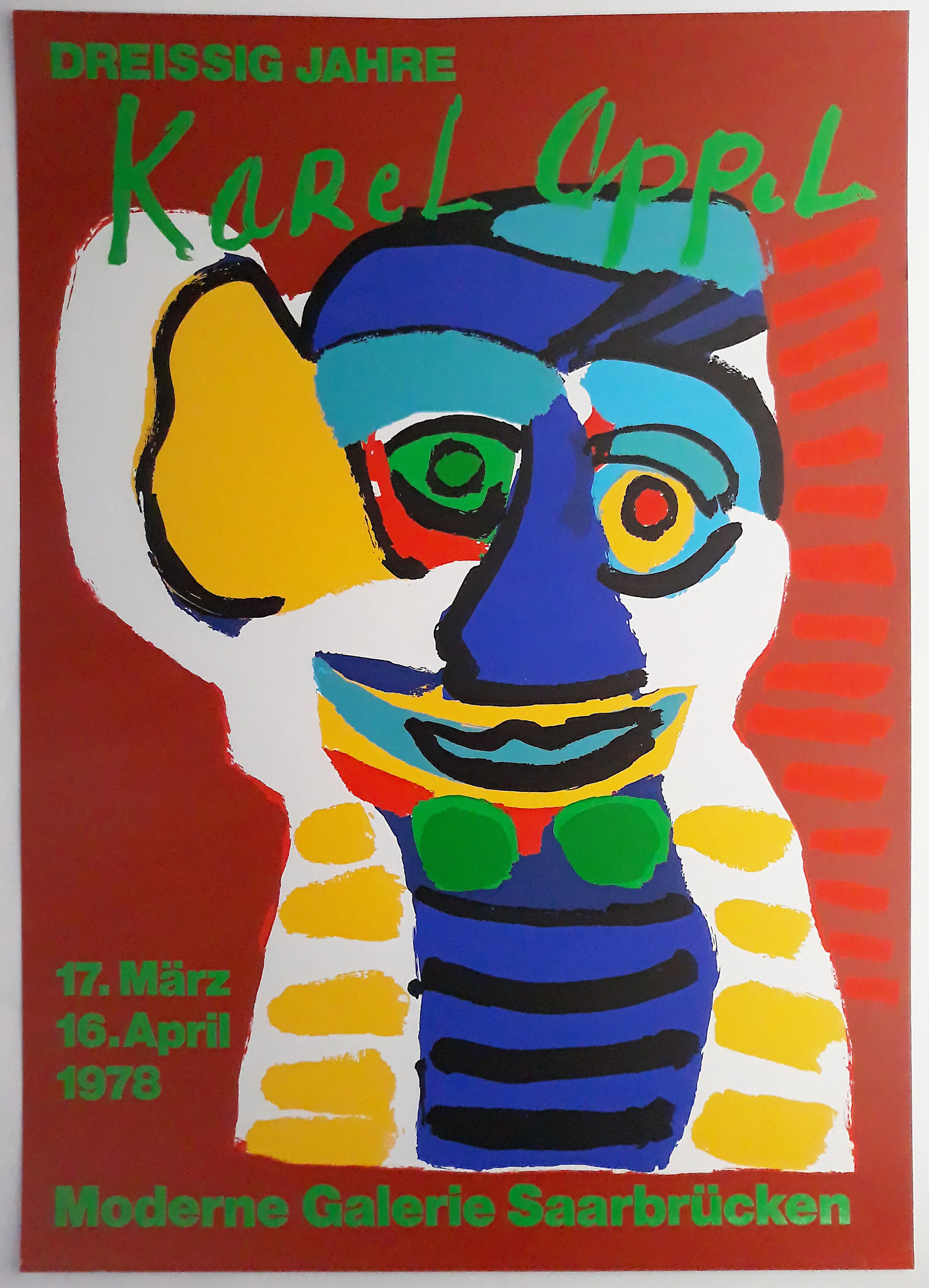 Affiche voor een tentoonstelling ter gelegenheid van dertig jaar Karel Appel in Moderne Galerie Saarbrücken. Zeefdruk op glad papier, dus geen offsetprint maar een echte zeefdruk die kwalitatief niet verschilt met een zeefdruk uit een gesigneerde en genummerde oplage. Afkomstig uit de nalatenschap van Henk van der Vet, achterop het blad zit een notarieel atelierstempel. In zeer goede conditie.