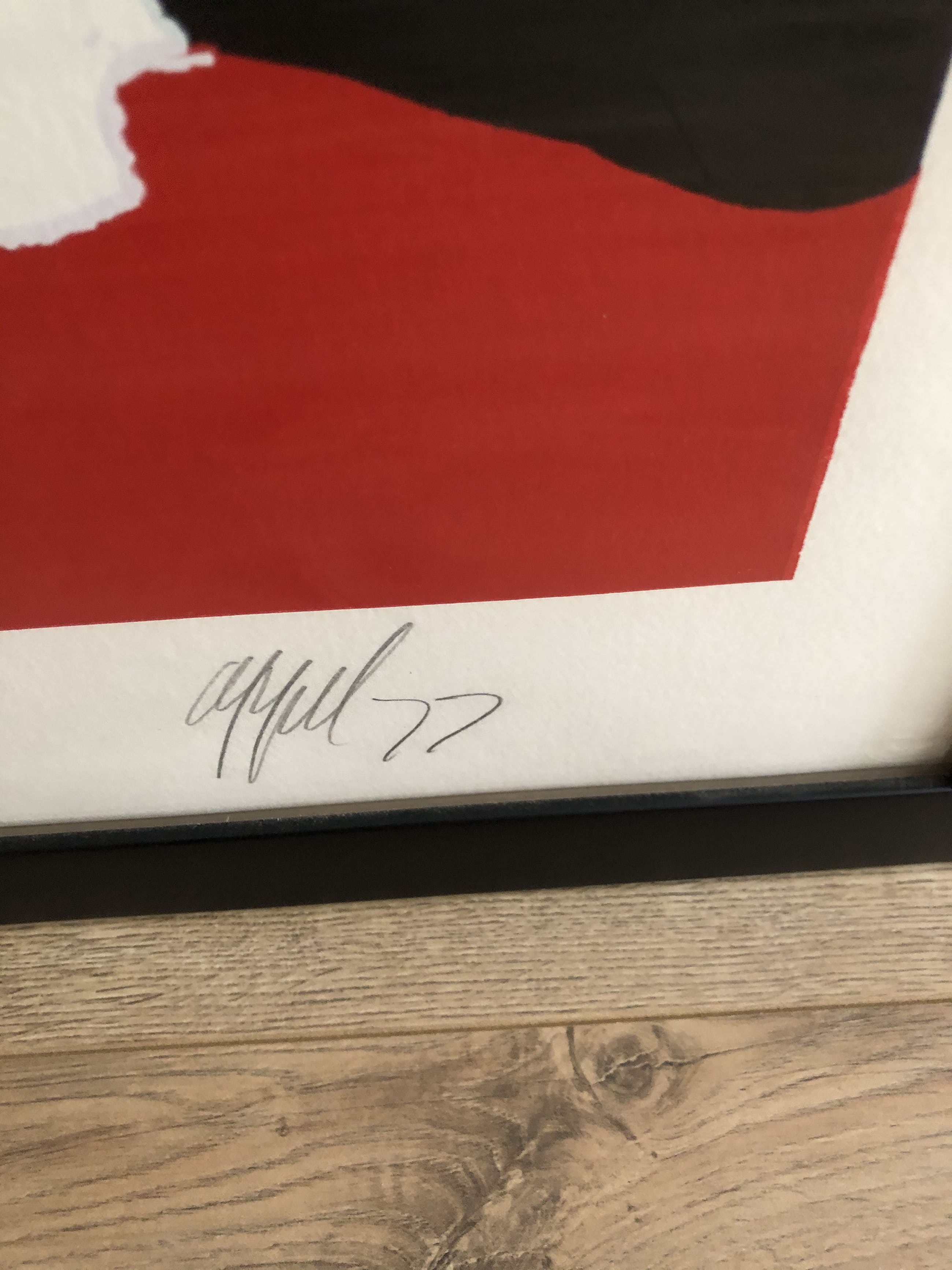 Prachtig groot werk van Karel Appel uit de box Seven summer days zeldzaam en vrolijk kleurig werk. Werk is ingelijst maar verdiend nieuwe lijst. Doos is alleen ter decoratie is niet bij prijs inbegrepen. Zeer scherpe prijs! Koopje!