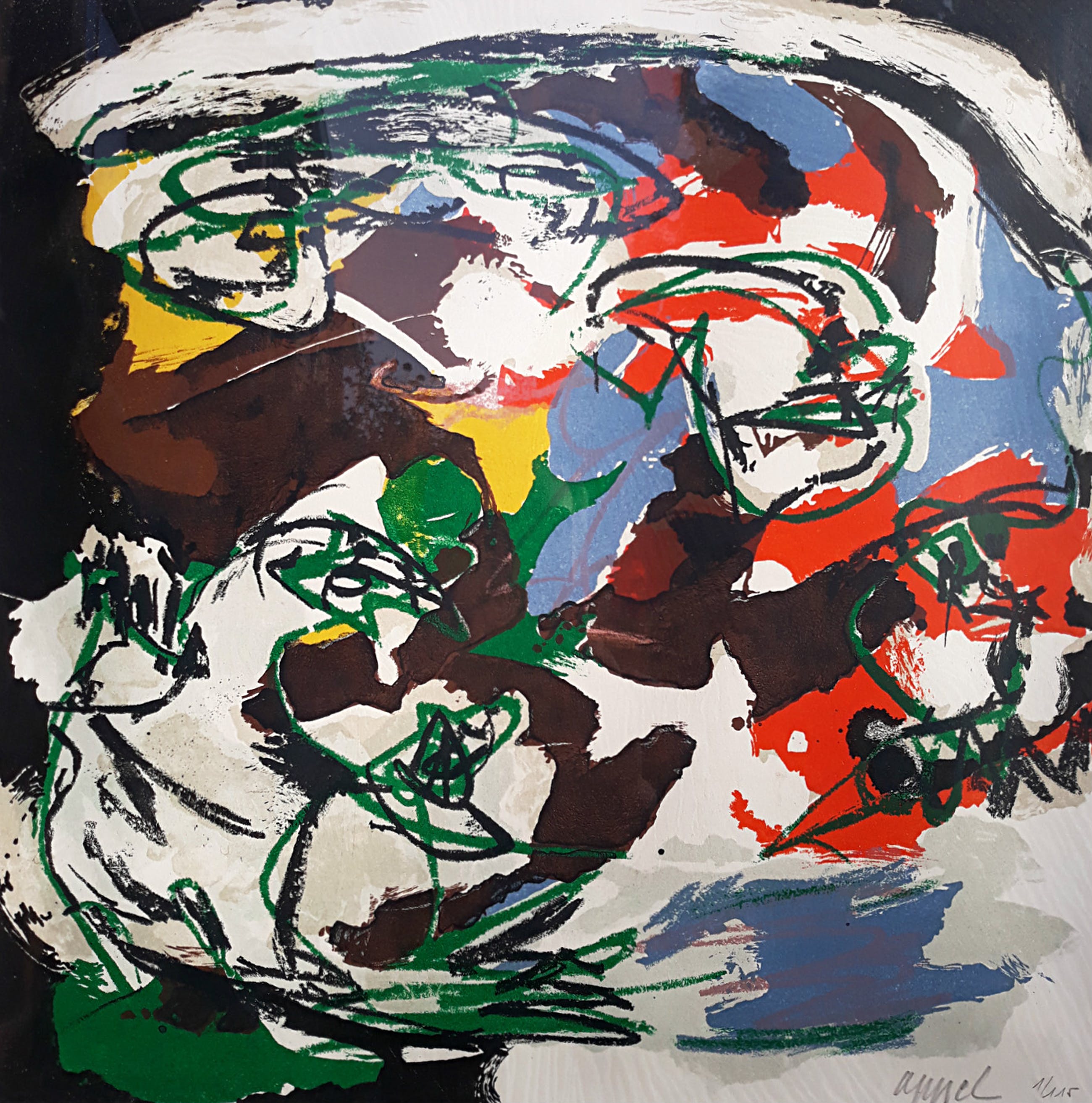 Prachtig, dynamisch werk van Karel Appel uit zijn “Paysages Humains” periode (1961-1963). Litho op geschept papier, met potlood gesigneerd en gedateerd (1/115) en met blindstempel “l’Oeuvre Gravée”. In zilverkleurige houten lijst, achter glas en met luxueus dubbel passe-partout. In zeer goede conditie; blad golft heel licht en er zitten wat vuiltjes tussen het glas en het passe-partout. De lichte strepen die zichtbaar zijn op de foto’s van de signatuur en het blindstempel zitten aan de binnenkant van het glas, dat schoongemaakt moet worden.