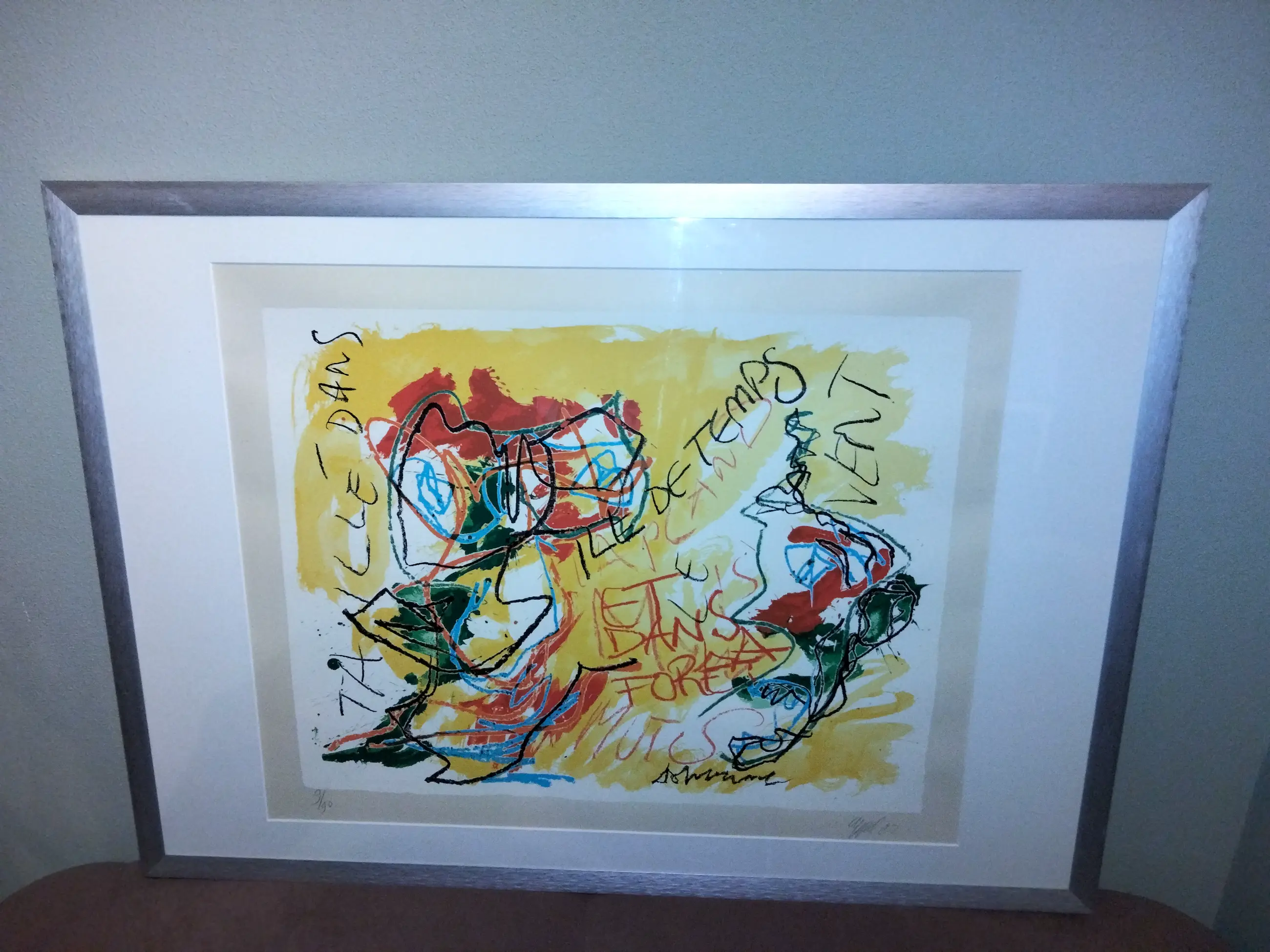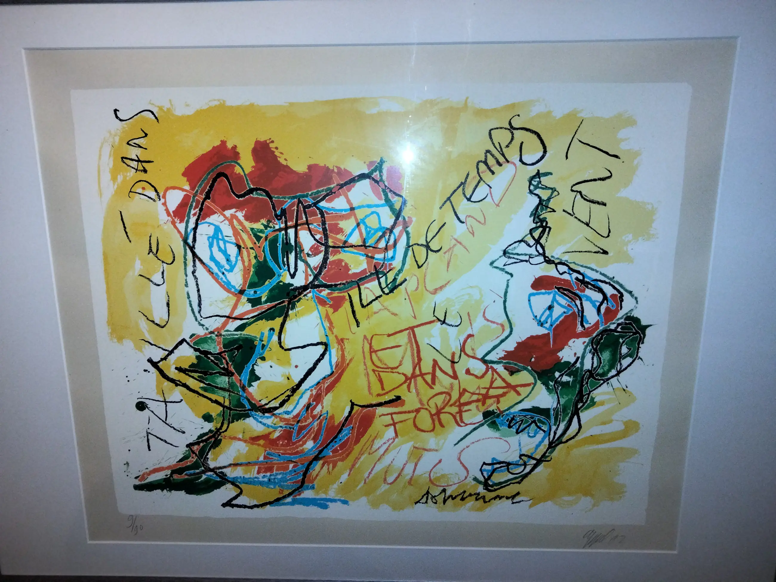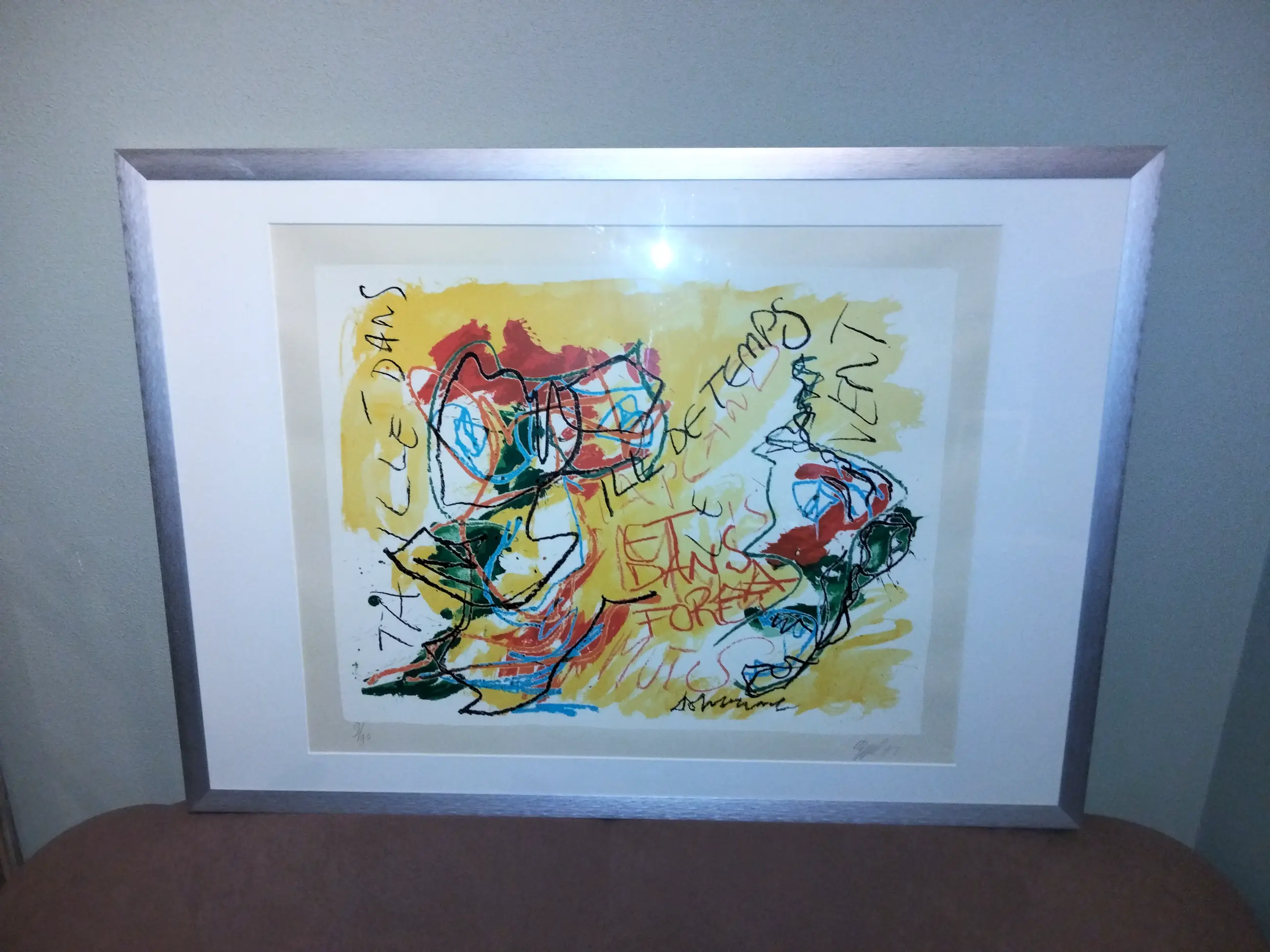 Kleurrijke zeer fraaie zeefdruk van Karel Appel uit 1982 Lage oplage van 90 stuks. Oplage nummer 9/90. Wordt weinig aangeboden. Mooi ingelijst in aluminium geborstelde lijst. Ophangklaar kan zo aan de muur. Uiteraard handgesigneerd en gedateerd en genummerd door Karel Appel. Gedrukt door henk van der vet. Droogstempel van der vet in papier gedrukt rechts onder