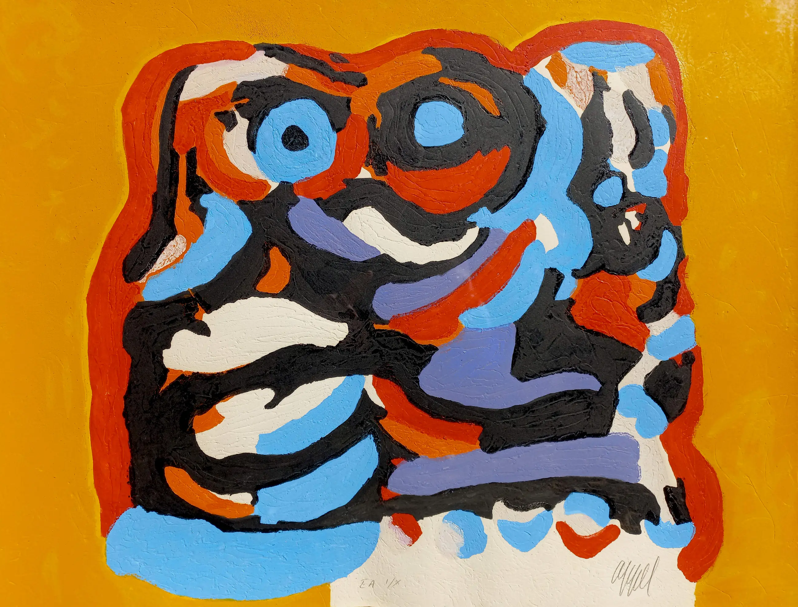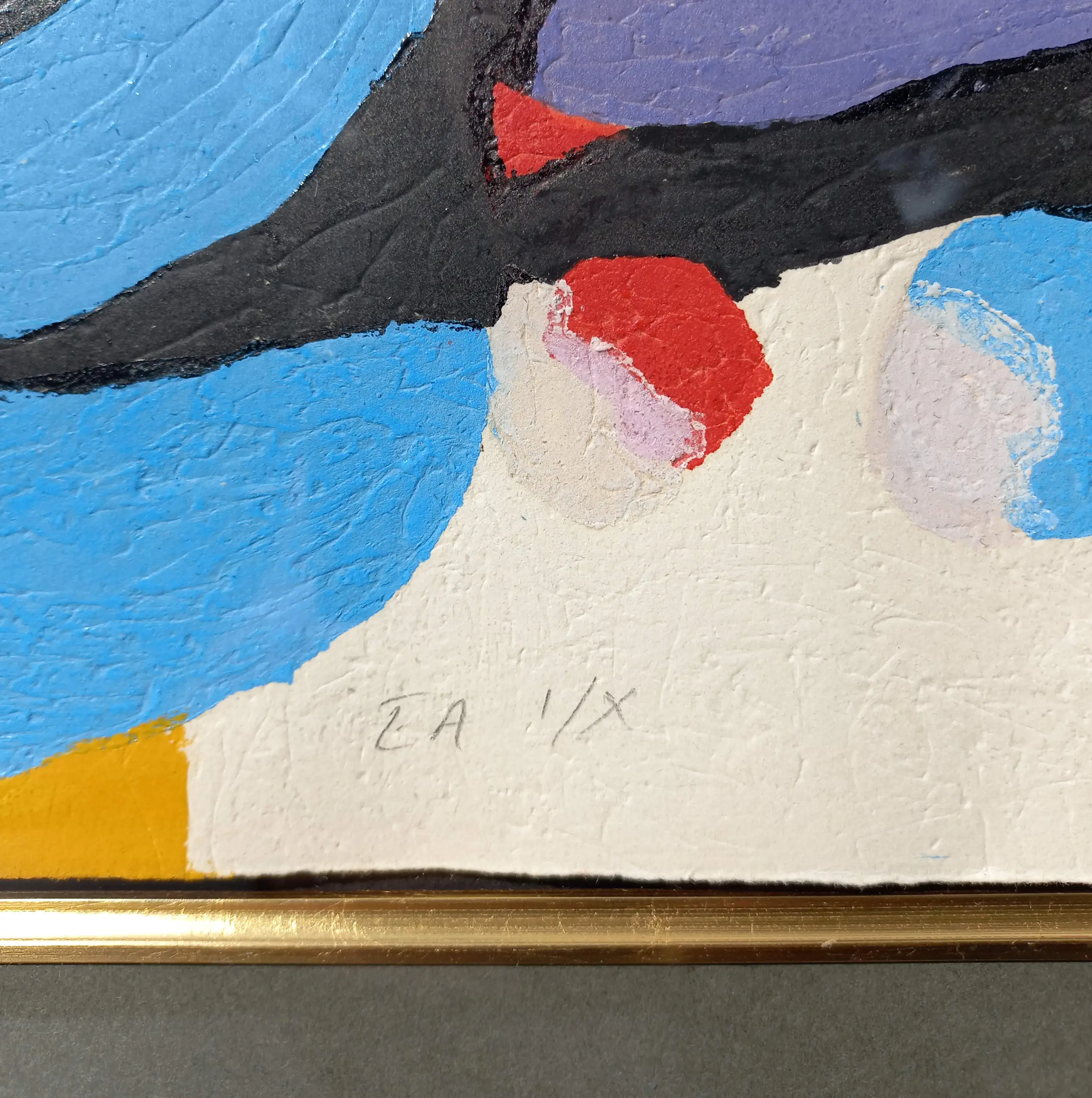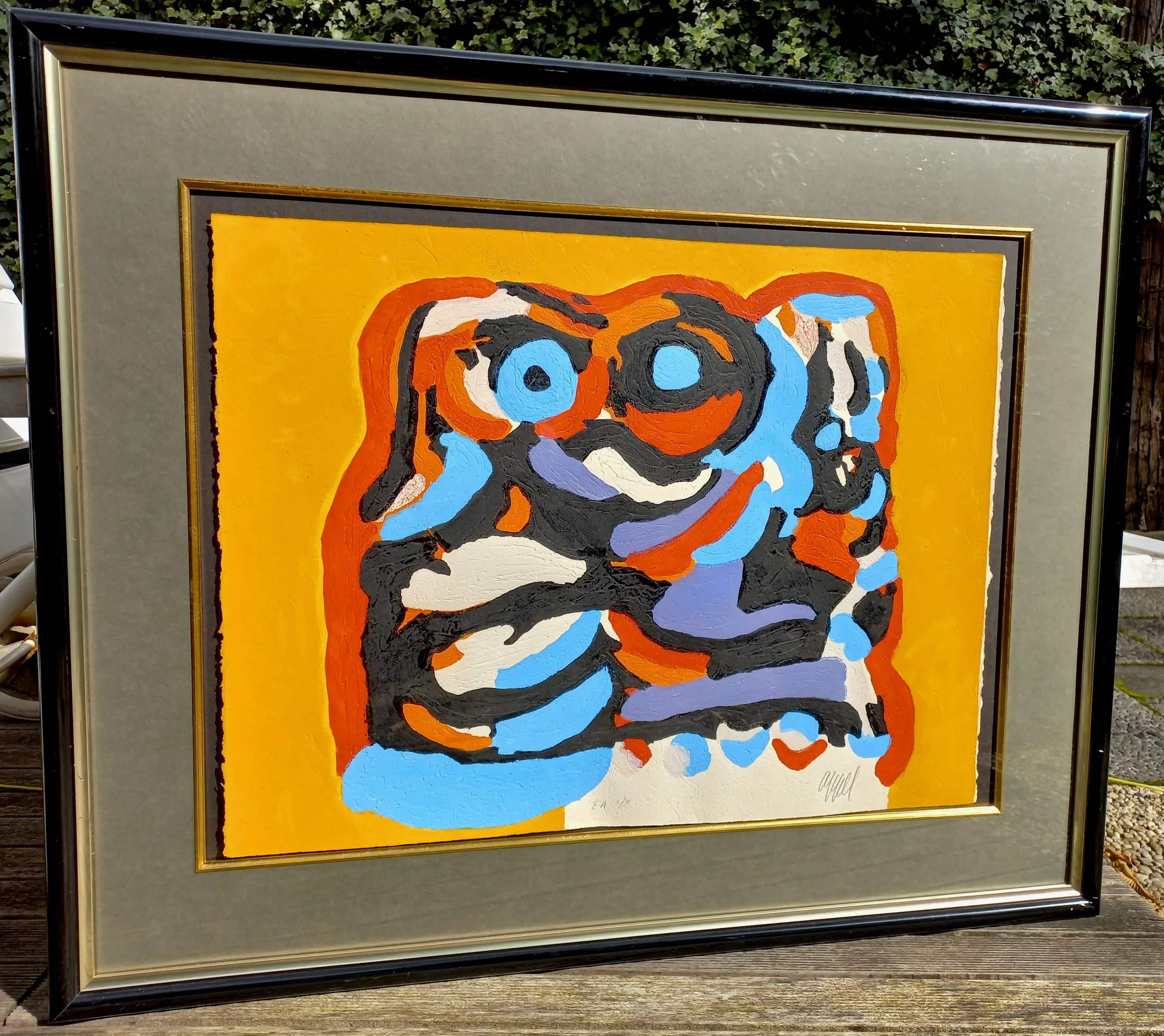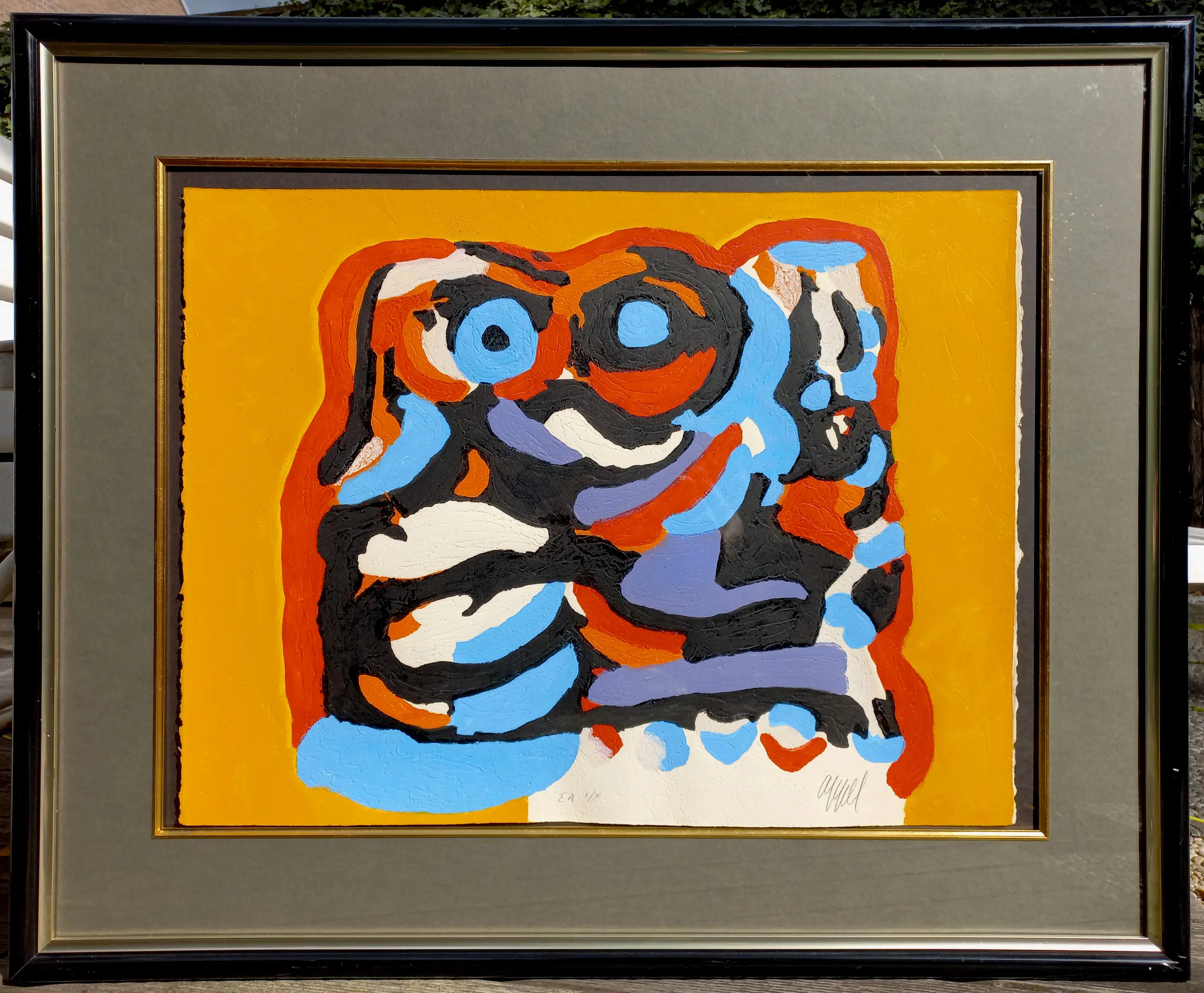 Prachtig werk van Karel Appel uit 1975. Carborundum ets op geschept papier, met potlood gesigneerd en genummerd (E.A. I/X = 1/10). Het volledige blad professioneel ingelijst, achter glas en met smetteloos, luxueus passe-partout. Alles in zeer goede conditie.