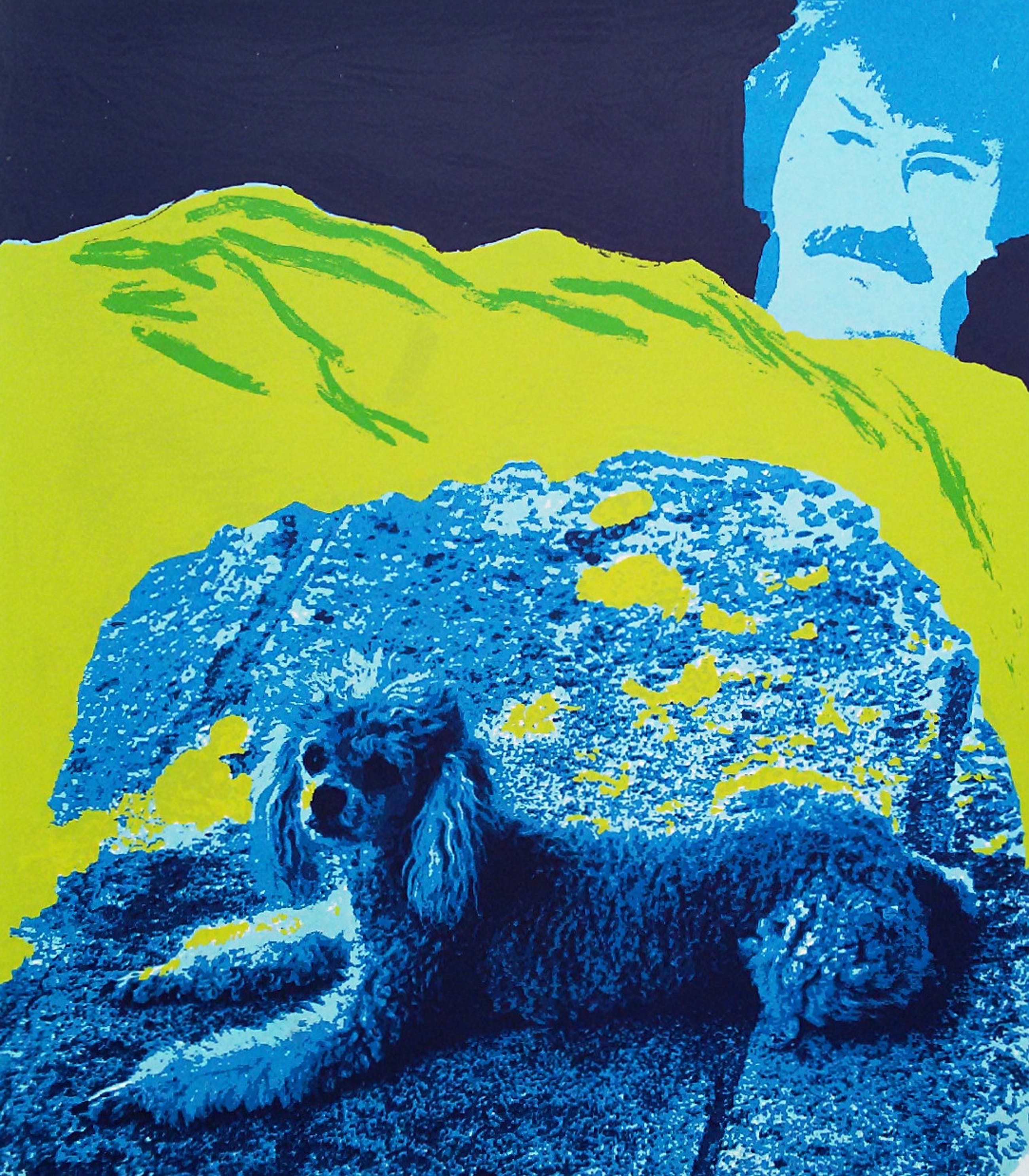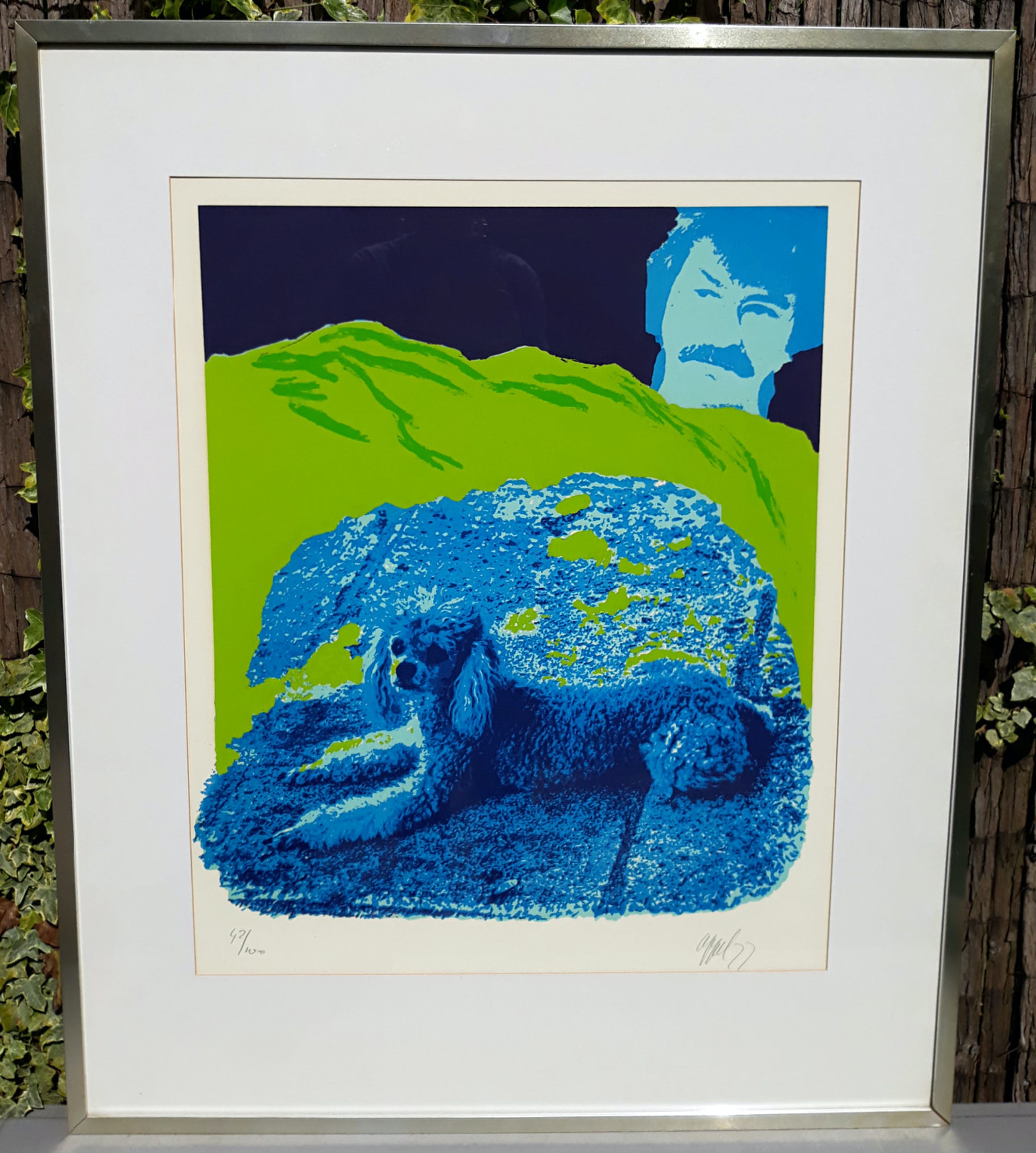 Bekend werk van Karel Appel en Henk van der Vet uit de serie Seven Summer Days, Appel met zijn poedel Coocky. Zeefdruk op 350 grams Economos-Etching papier, met potlood gesigneerd, gedateerd (’77) en genummerd (42/100). Het volledige blad in aluminium lijst, achter glas en met passe-partout. Alles in goede conditie; blad is licht verkleurd en inlijsting is al wat ouder.