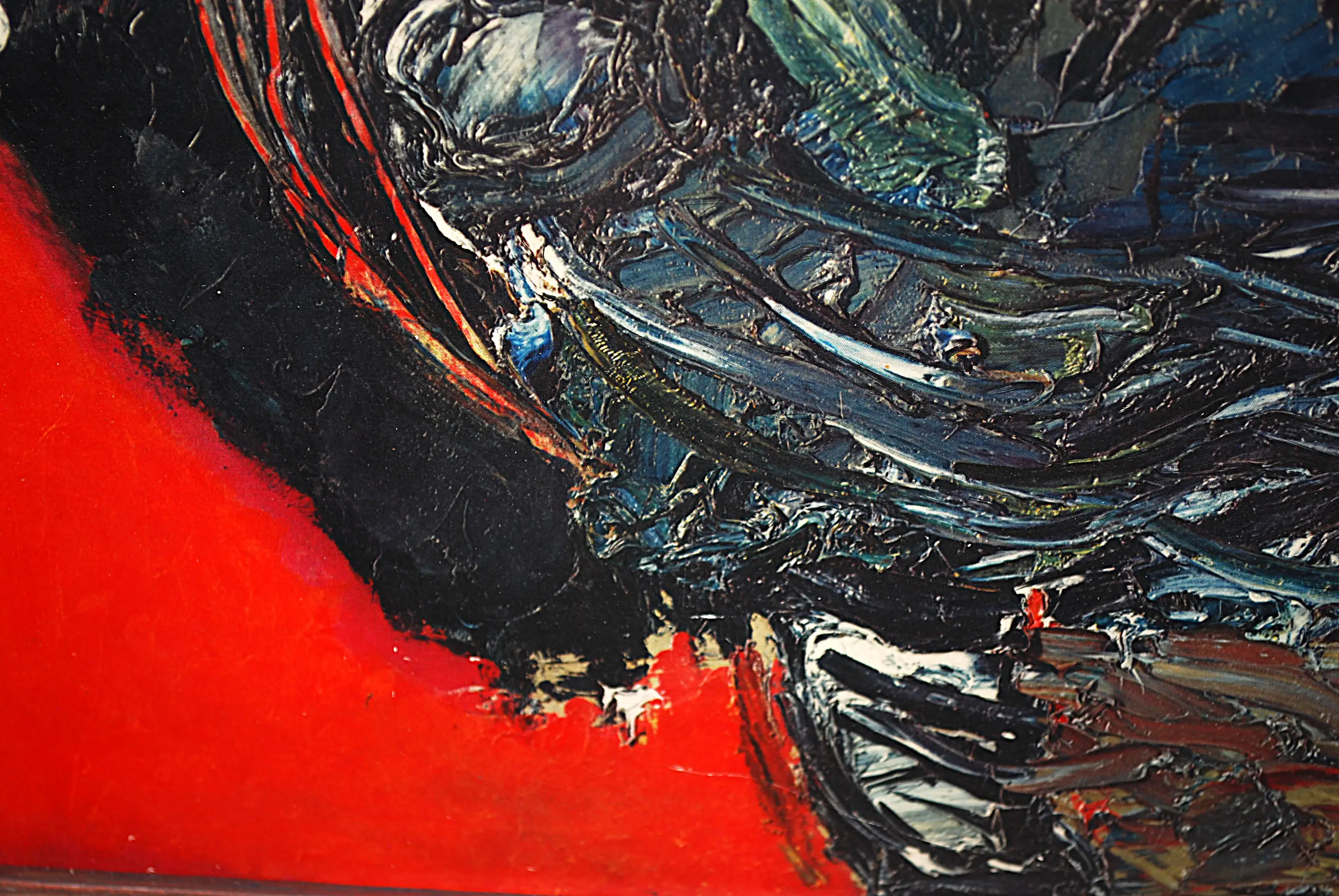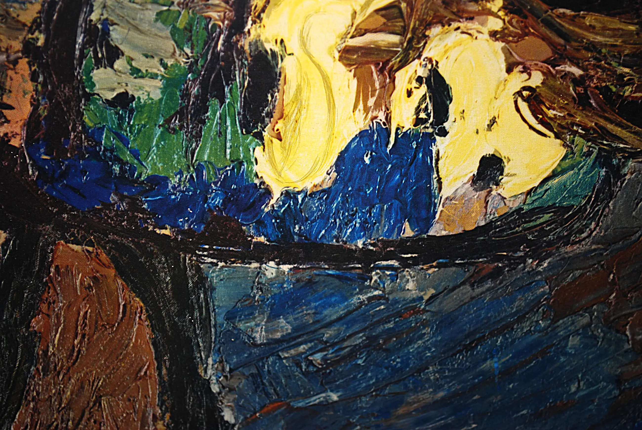 De fraaie druk is ergens uit de jaren 50, op papier, bevestigd op een dikke houten plaat. Gesigneerd in de druk r.o. In een (goed matching) houten lijst, waarvan de zijkanten zwart zijn. Het geheel weegt een kleine 4 kg.