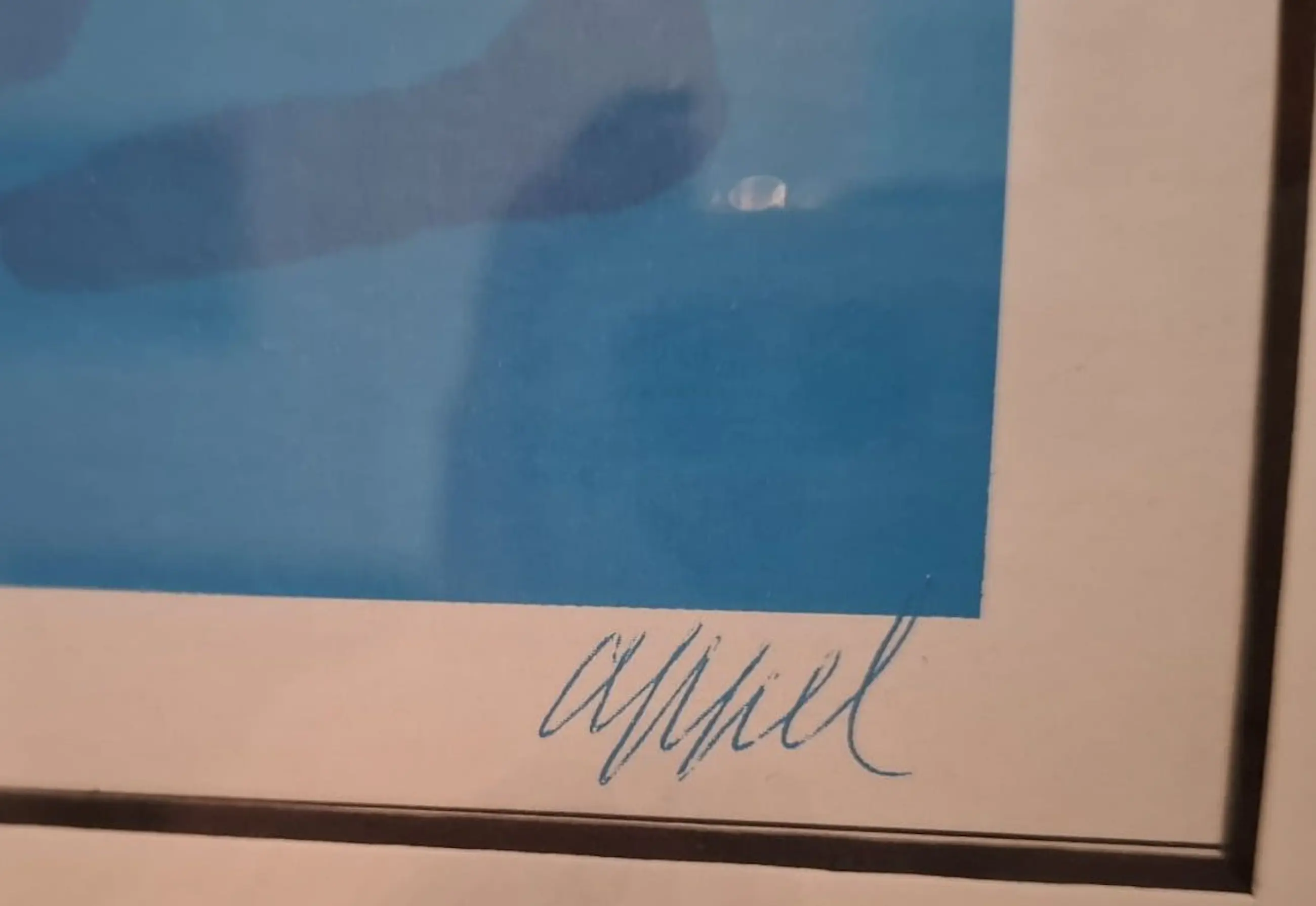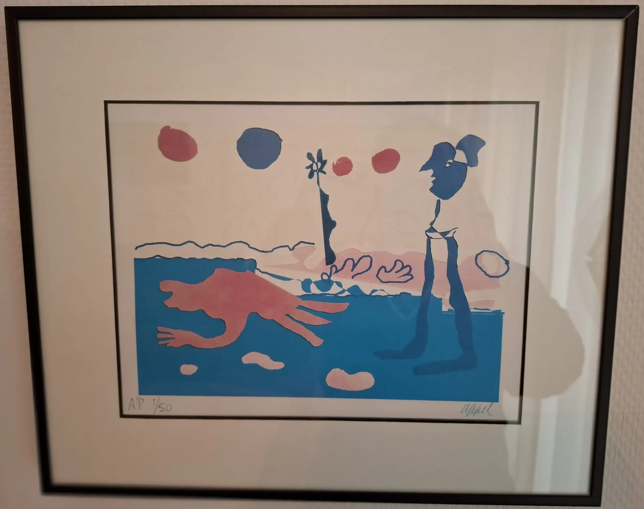 Zeefdruk ingelijst in zwart frame met passe-partout. Het werk heeft altijd aan de wand gehangen en is daardoor verkleurd