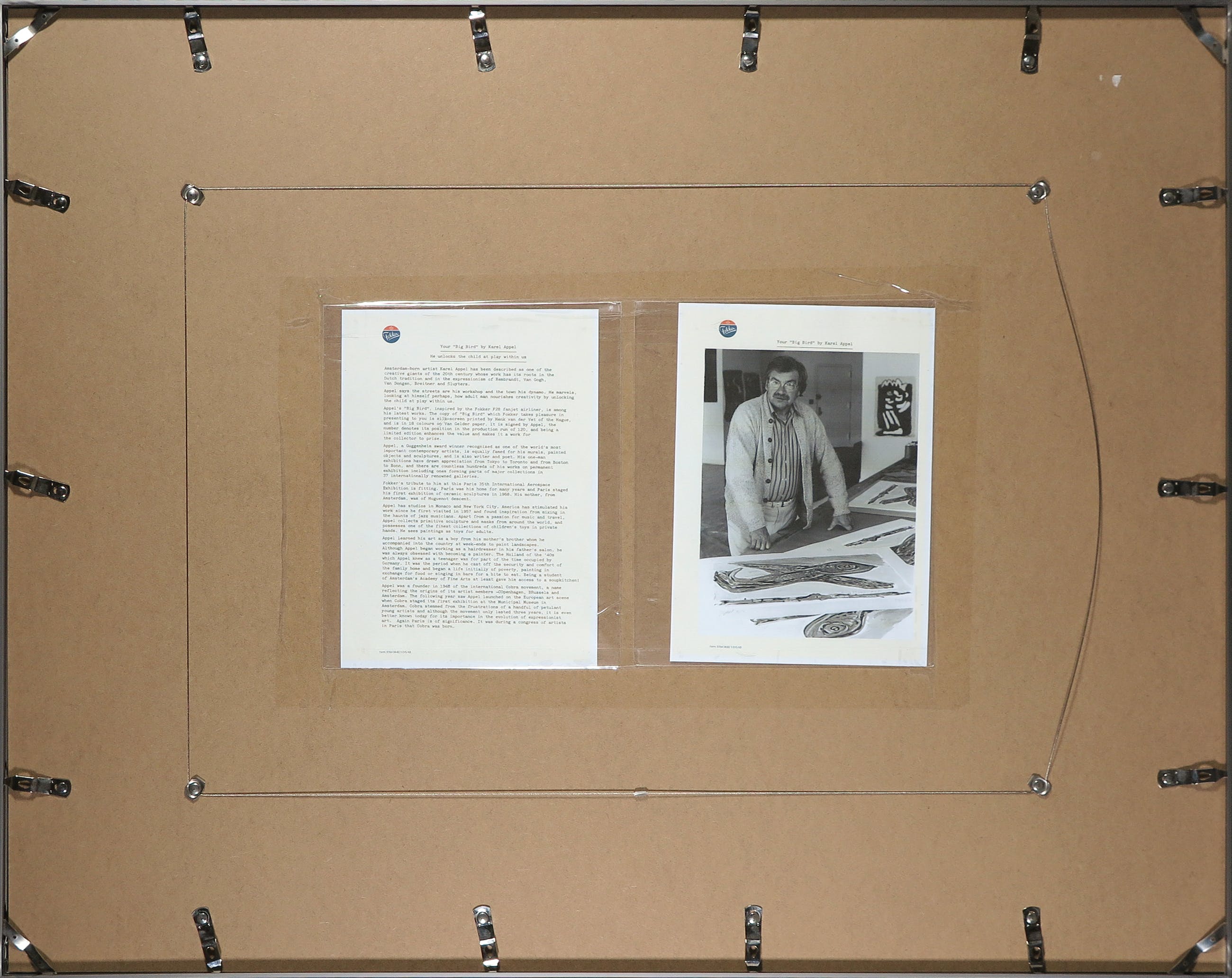 Verso op de lijst is meer informatie te lezen over het project Big Bird, inclusief een geprinte foto met Appel en de werken.