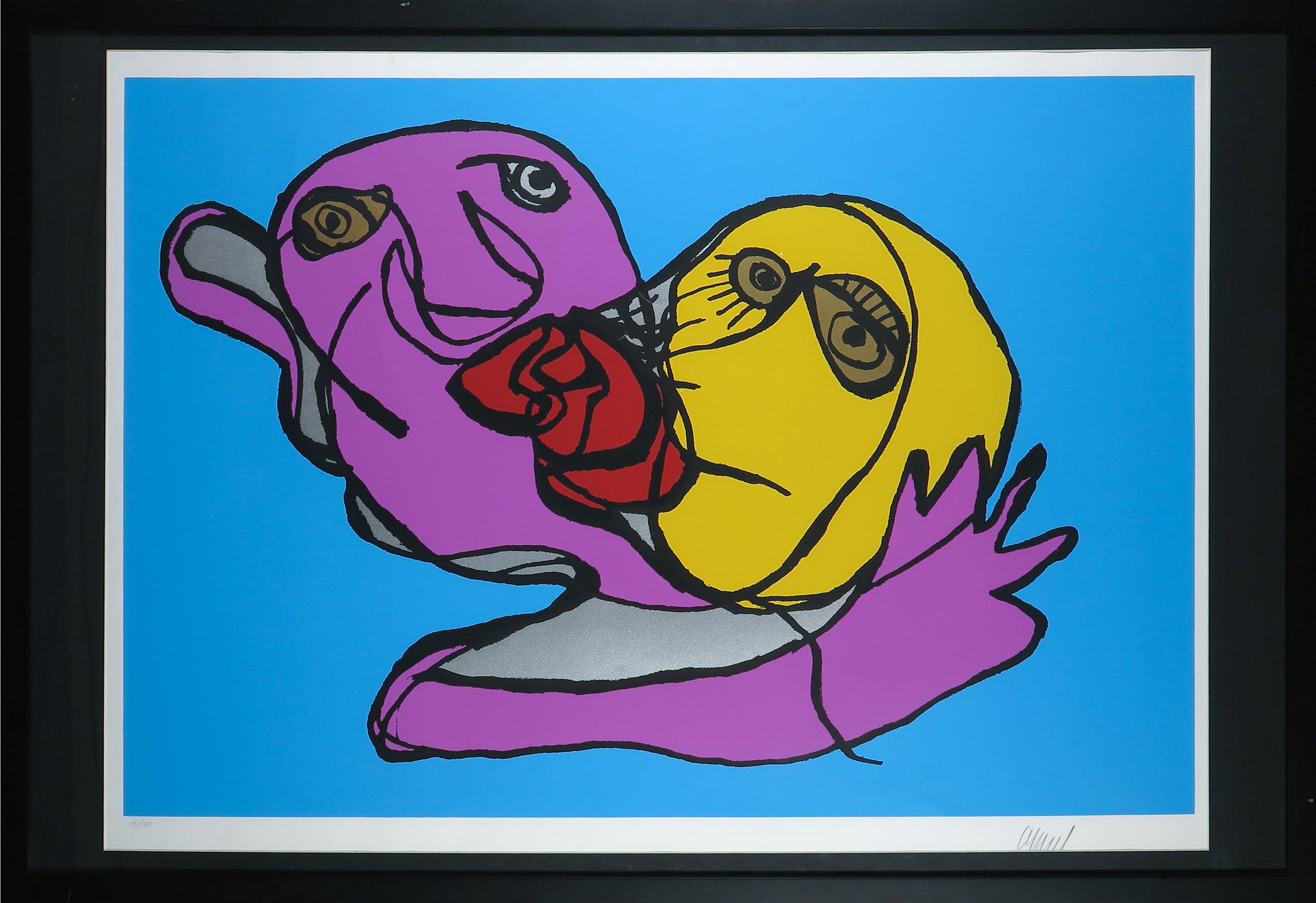 Zeer goede conditie. Klein knikje in het blad, linksonder, onder het paars. Alleen (moeilijk) zichtbaar met strijklicht. In het midden, boven de 'kus' een imperfectie in de druk; kleine breukjes in de zwarte inkt. | |