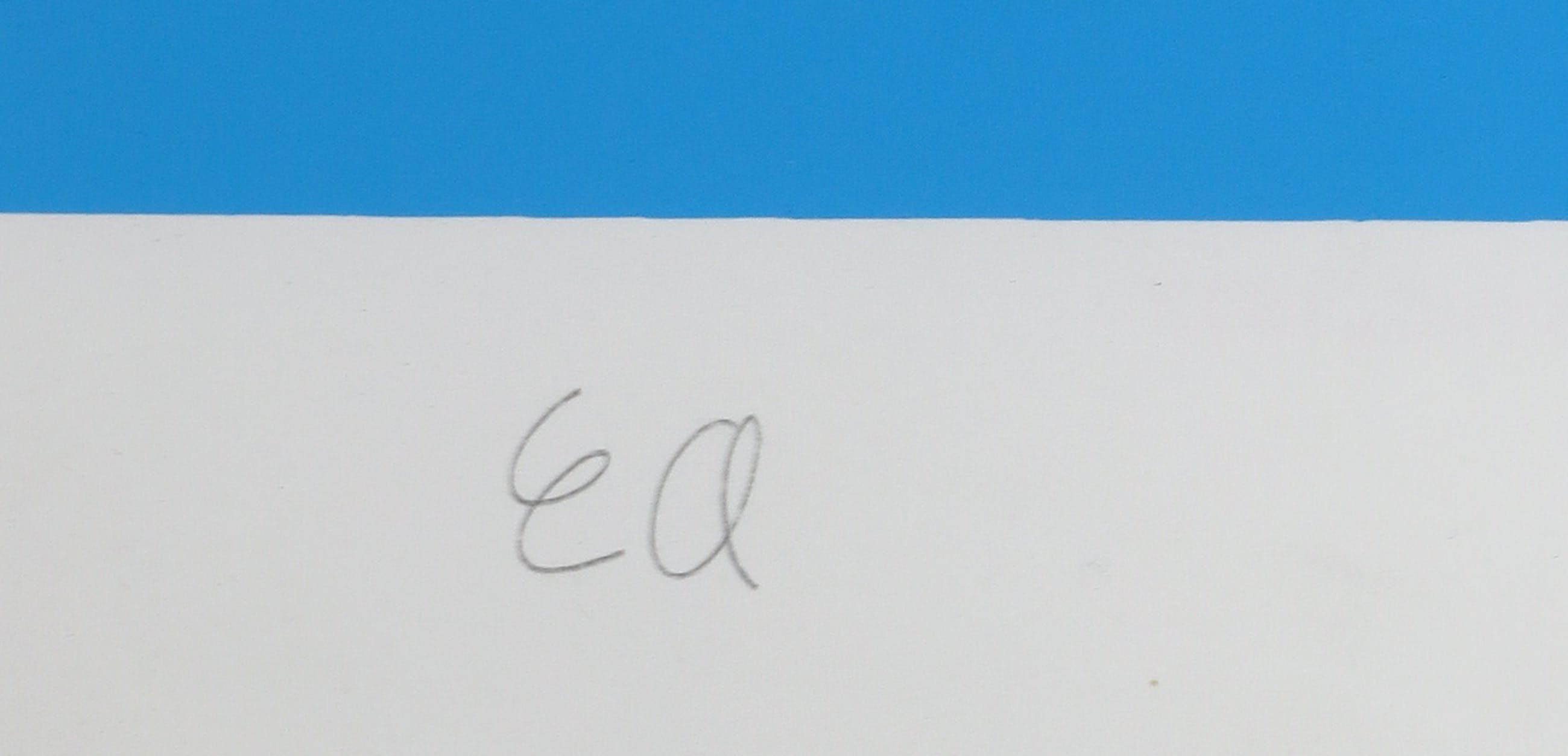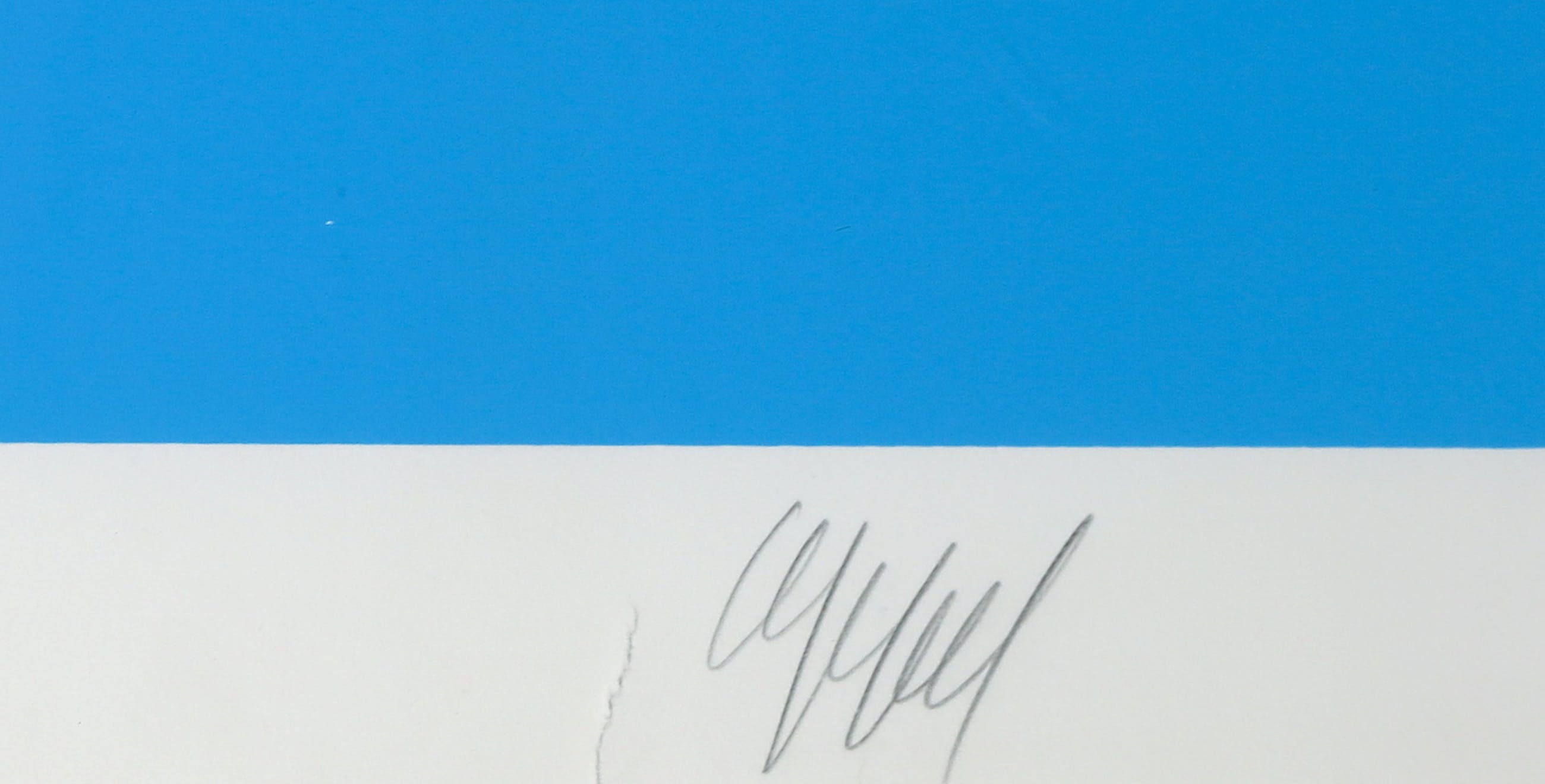 Goede tot zeer goede conditie. Klein knikje in het blad, linksboven in het blauw. Scheurtje in het blad bij het signatuur, valt niet erg op. Zie foto met het signatuur. | |