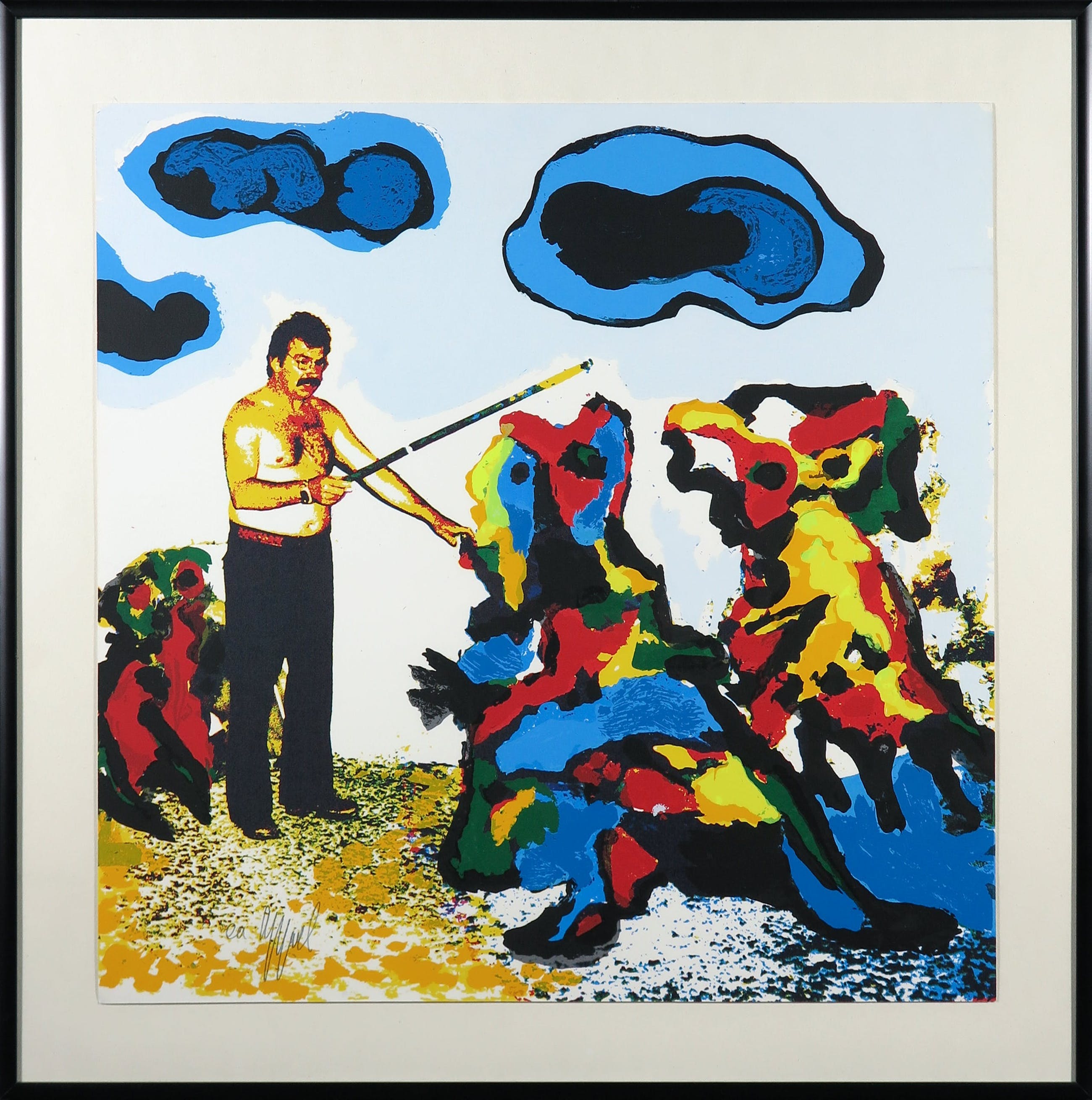Ingelijste zeefdruk De tovenaar uit 1977, genummerd E.A. Bij het item ook de Schilderkist.