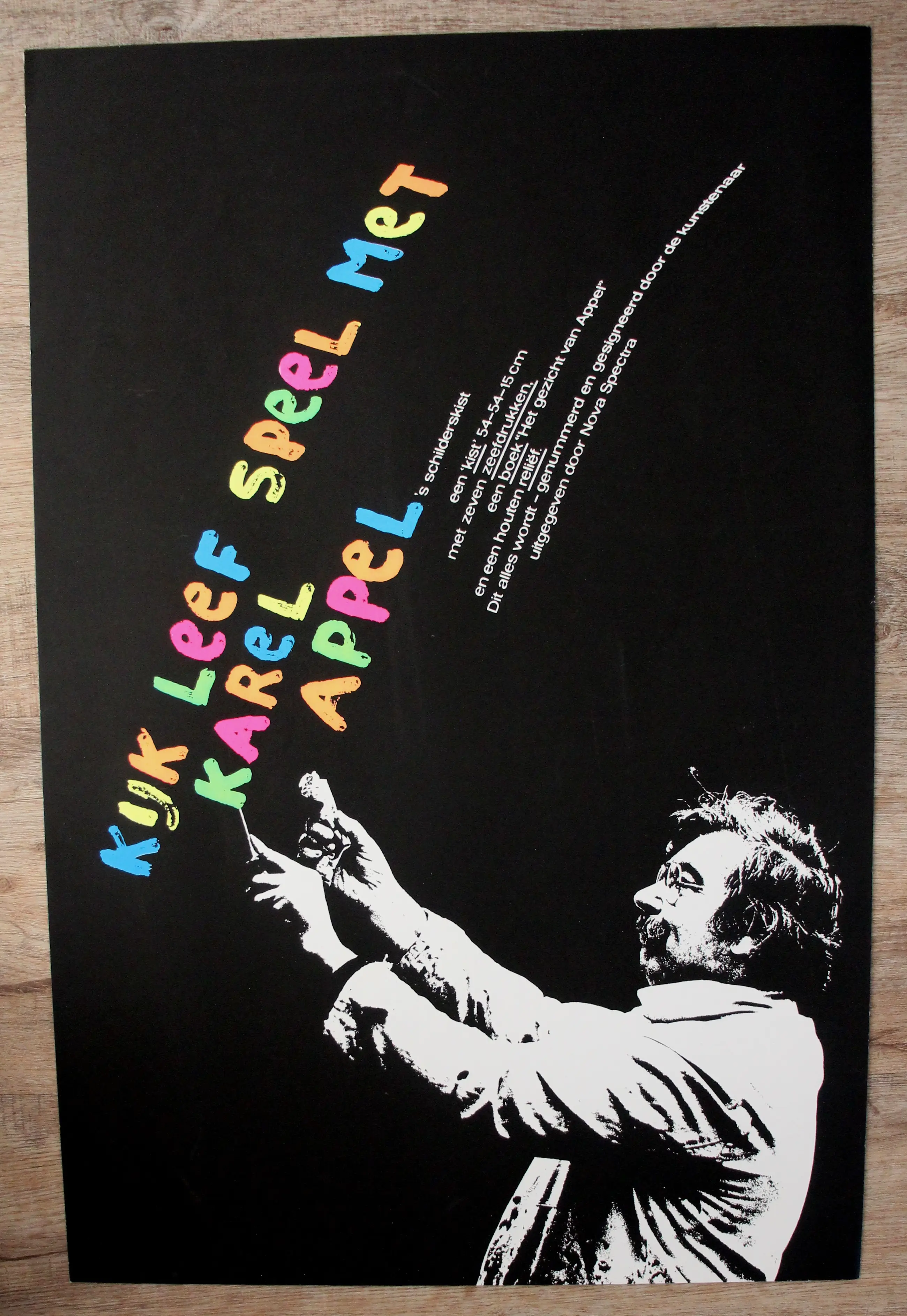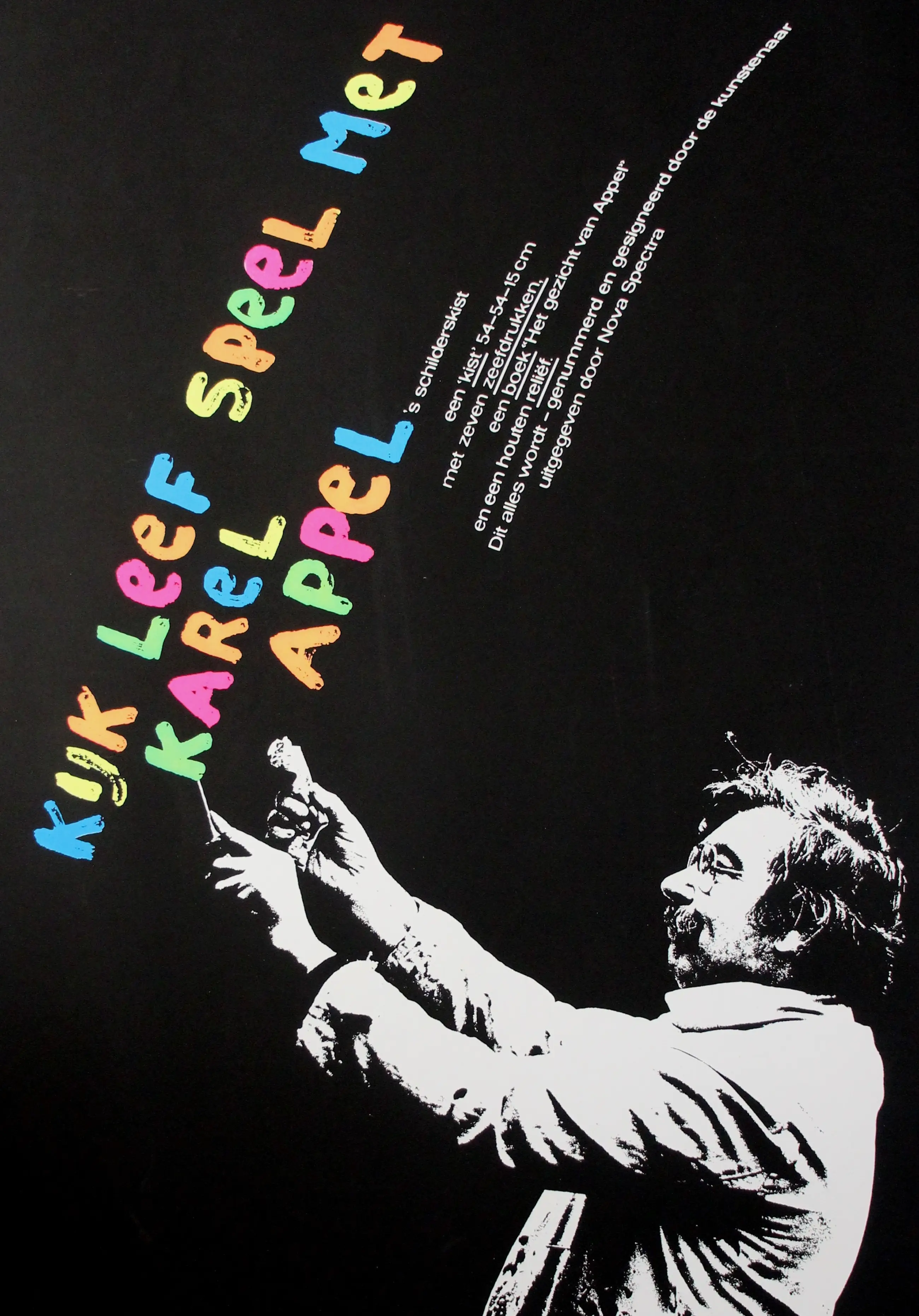Promotie affiche voor Karel Appel’s Schilderskist, een cassette die hij samen met Henk van der Vet maakte in 1977. Zeefdruk op glad papier. Afmetingen blad: 74cm x 49cm. Afkomstig uit de nalatenschap van Henk van der Vet,