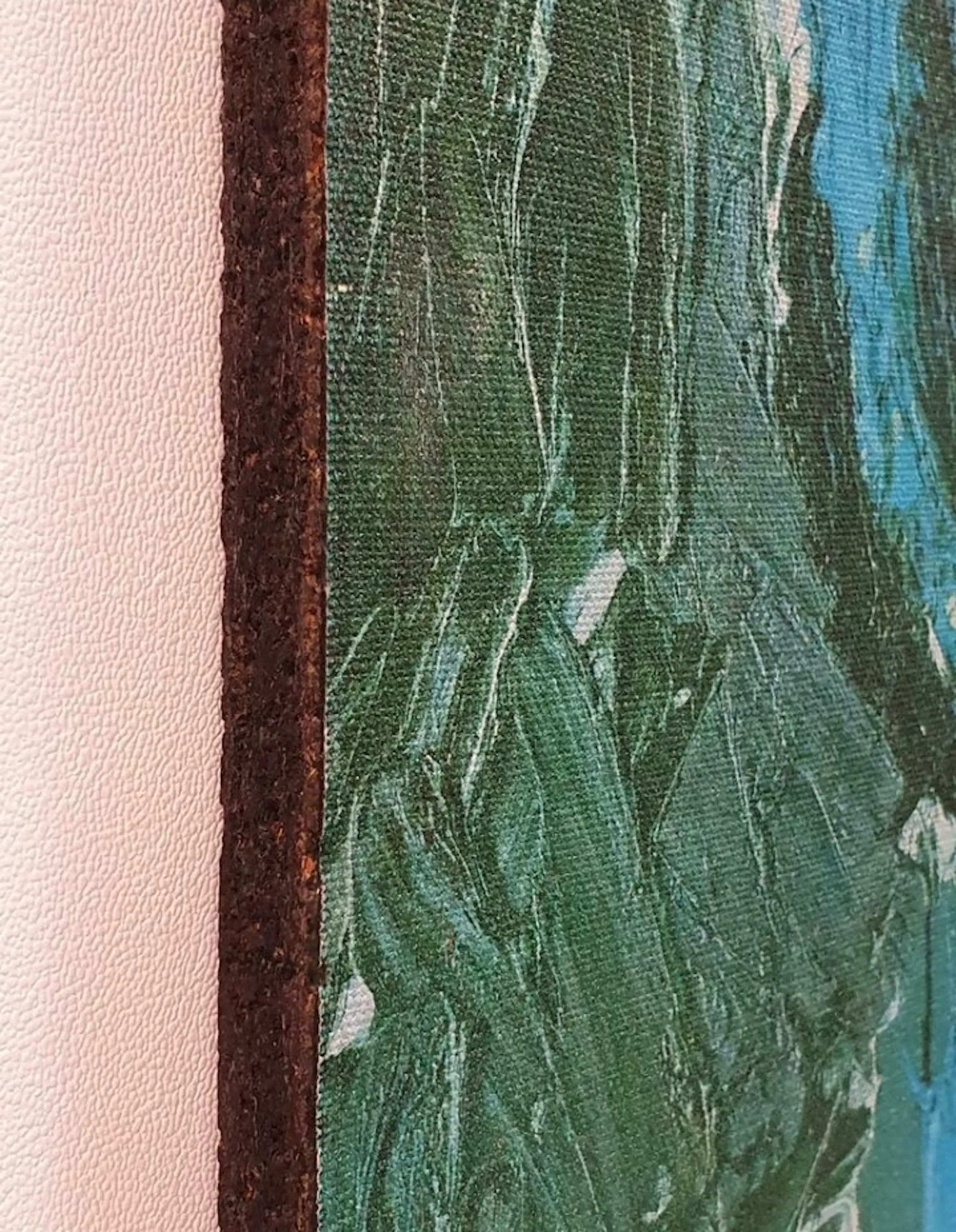 Zeefdruk op linnen, bevestigd op een houten frame.