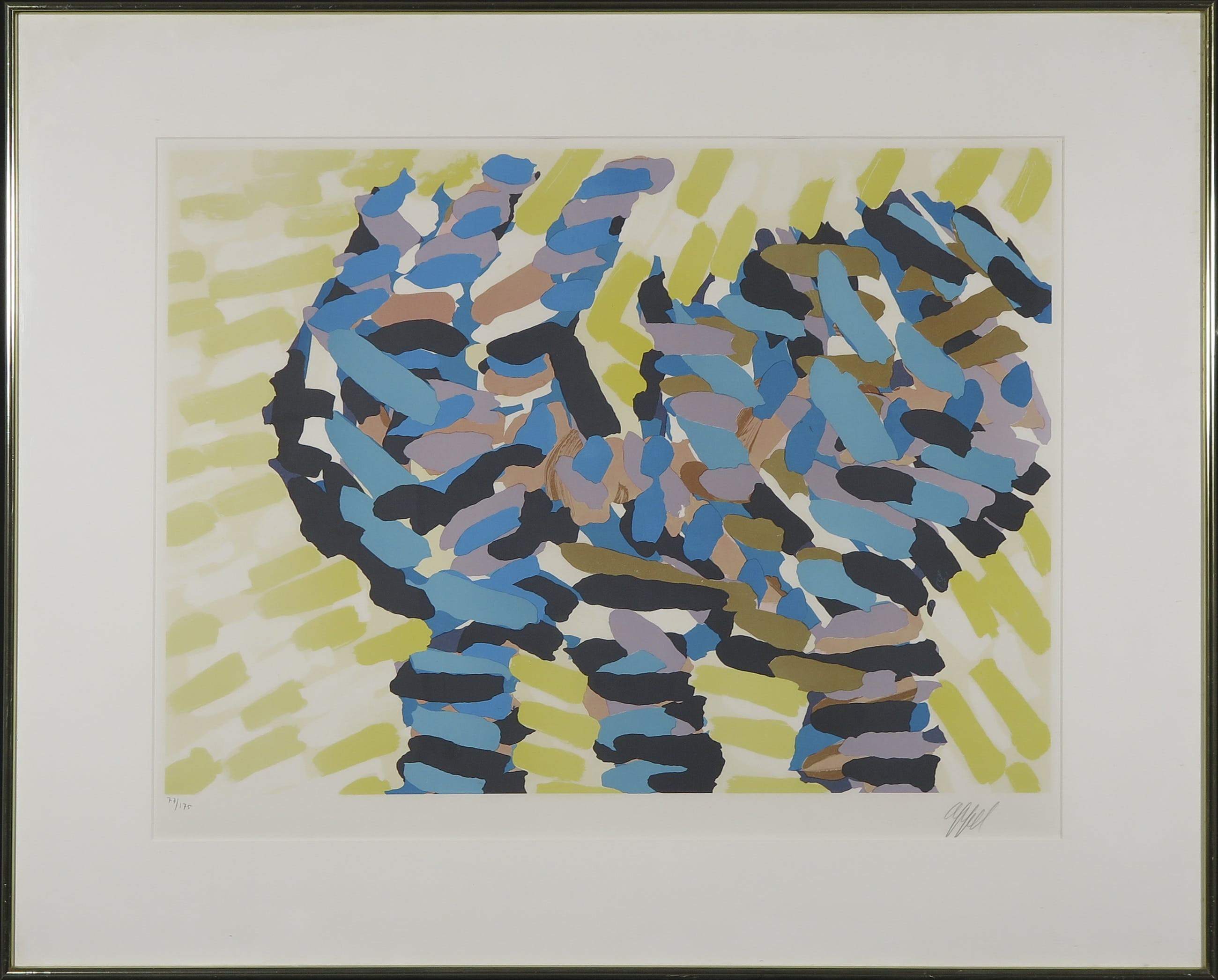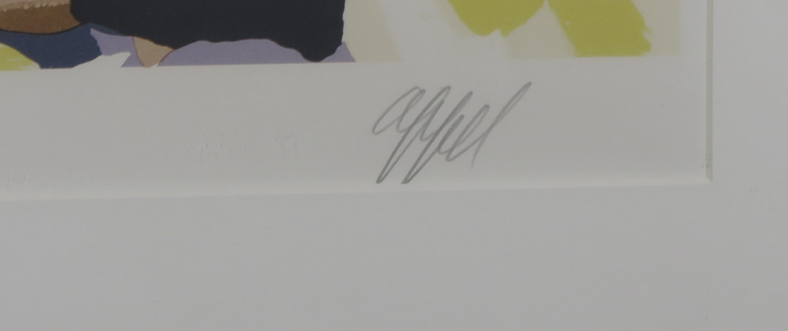 | De kleuren van de zeefdruk zijn verschoten/vervaagd. In het blad zeer kleine oxidatievlekjes. Tussen glasplaat en passe-partout wat vuil. | |