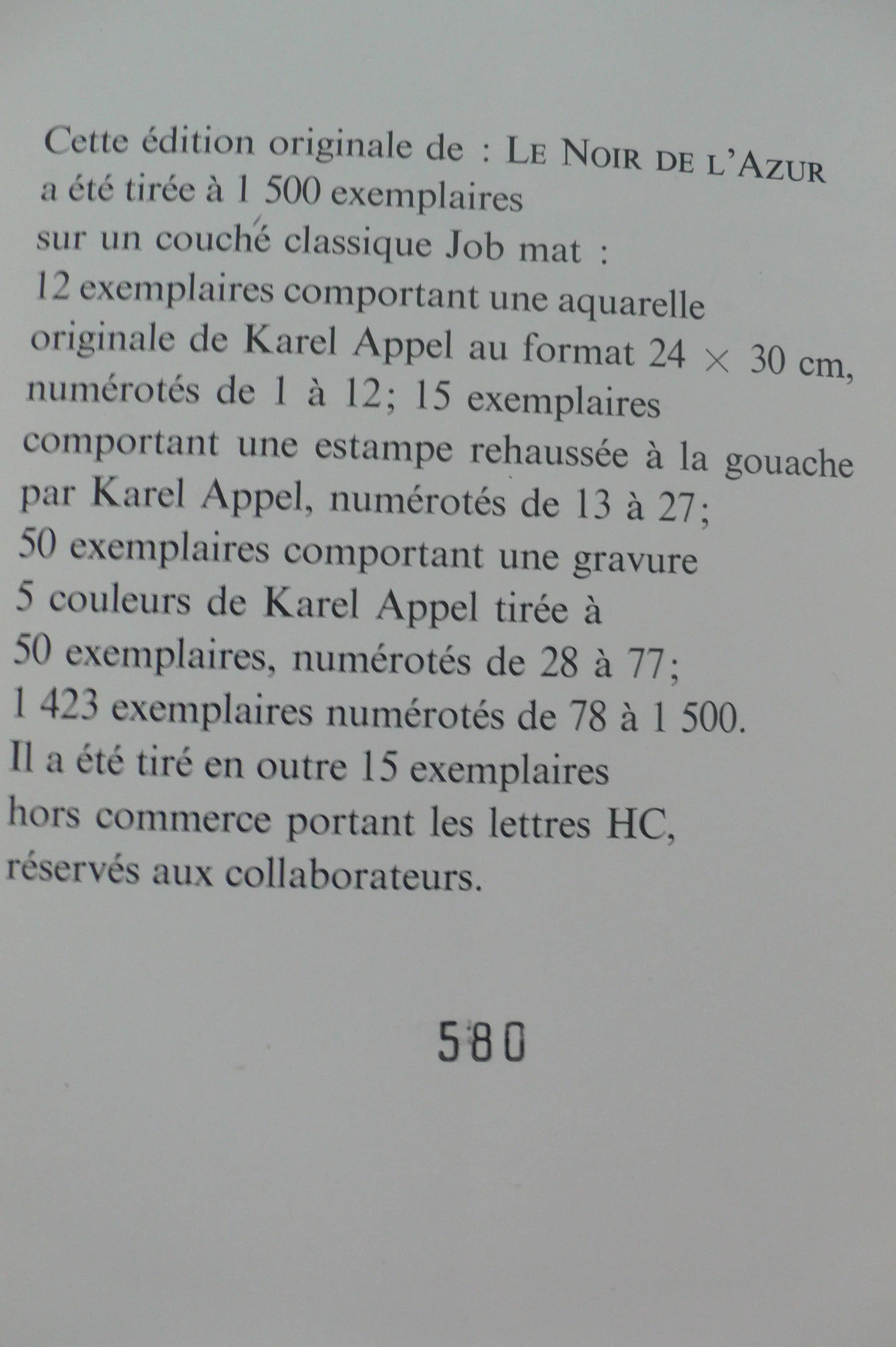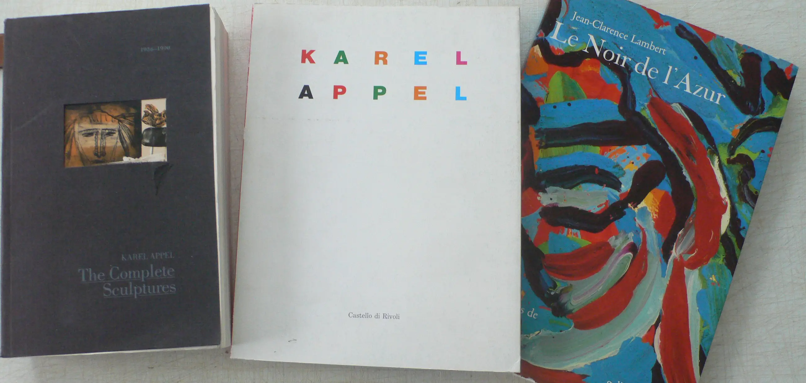 - Karel Appel - Castello di Rivoli - Italiaanse uitgave met Engelse vertaling achterin - 136 p. - Keurig ex. met lichte gebruikssporen. - Jean-Clarence Lamber - Le Noir de l'Azur - Met tekeningen van Karel Appel - Oplage 1500 genummerde ex. Goede exemplaar. Franstalig.