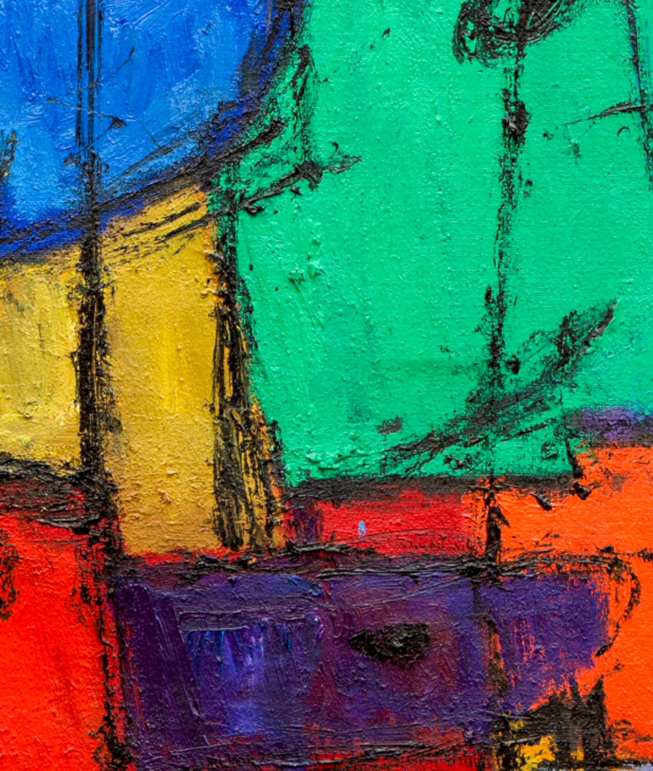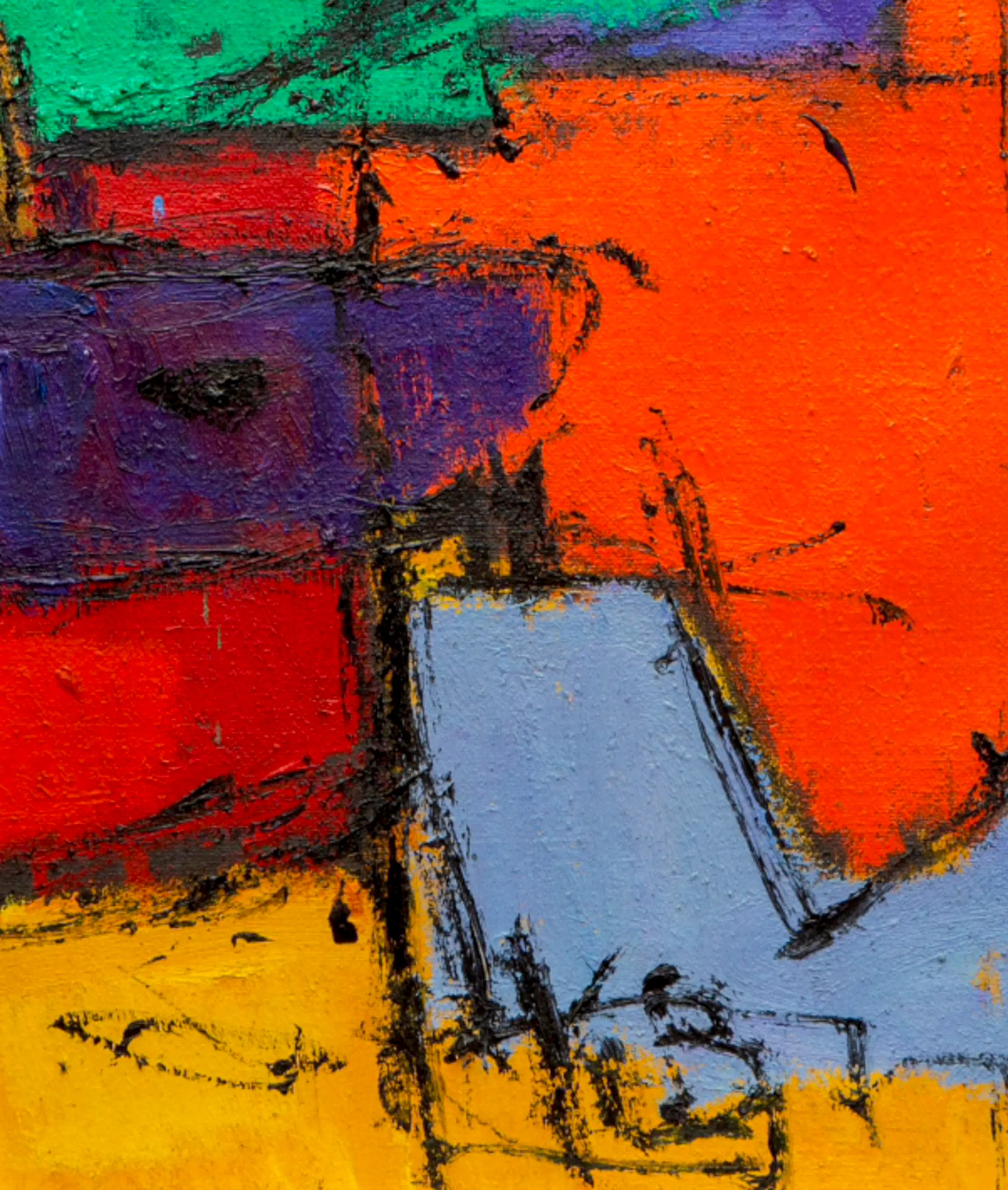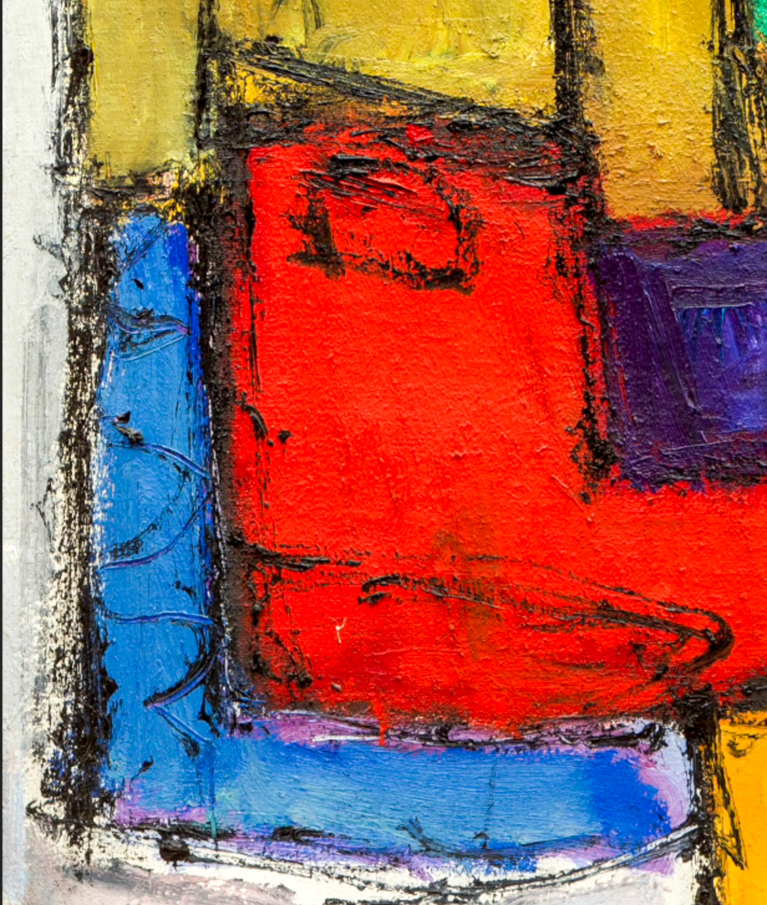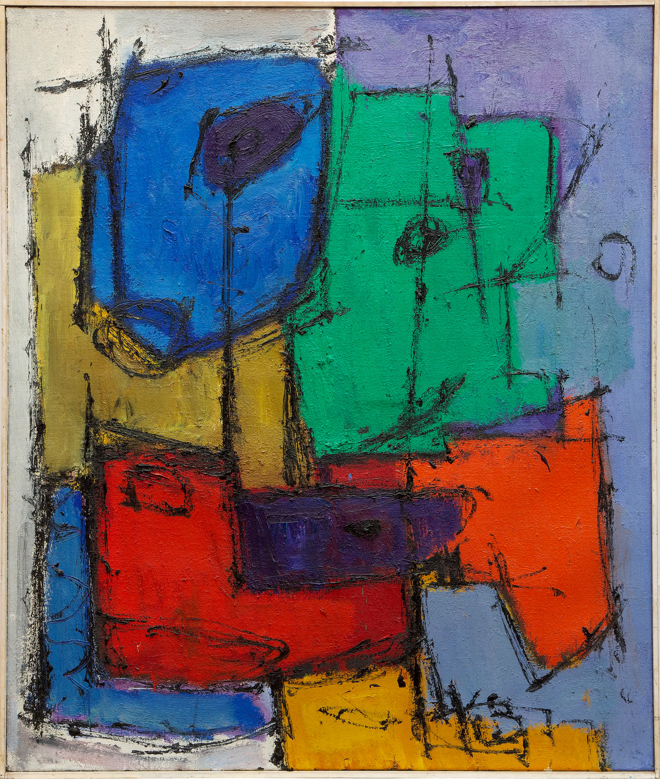Dit schilderij toont een abstracte compositie opgebouwd uit een reeks geometrisch aandoende, organisch begrensde kleurvlakken. De voorstelling wordt gedomineerd door contrasterende kleuren, waaronder blauw, groen, rood, geel, paars en oranje, die in blokachtige vormen over het beeldvlak zijn verdeeld.
