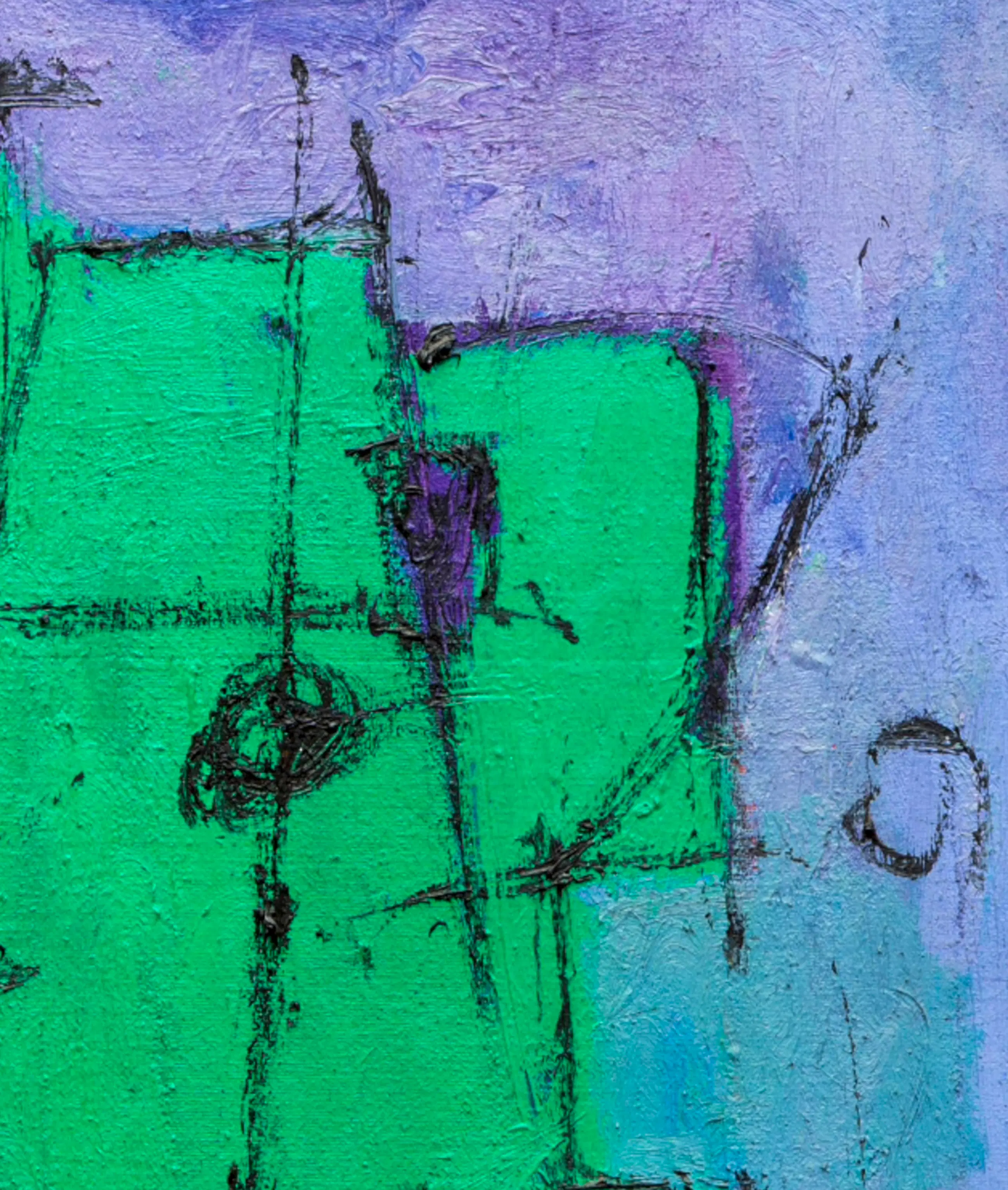 Het werk vertoont een dynamisch evenwicht tussen kleur en lijn, waarbij de vlakken elkaar overlappen en begrenzen. De ondergrond van jute blijft op sommige plaatsen zichtbaar, wat bijdraagt aan de ruwe en directe uitstraling van het geheel.