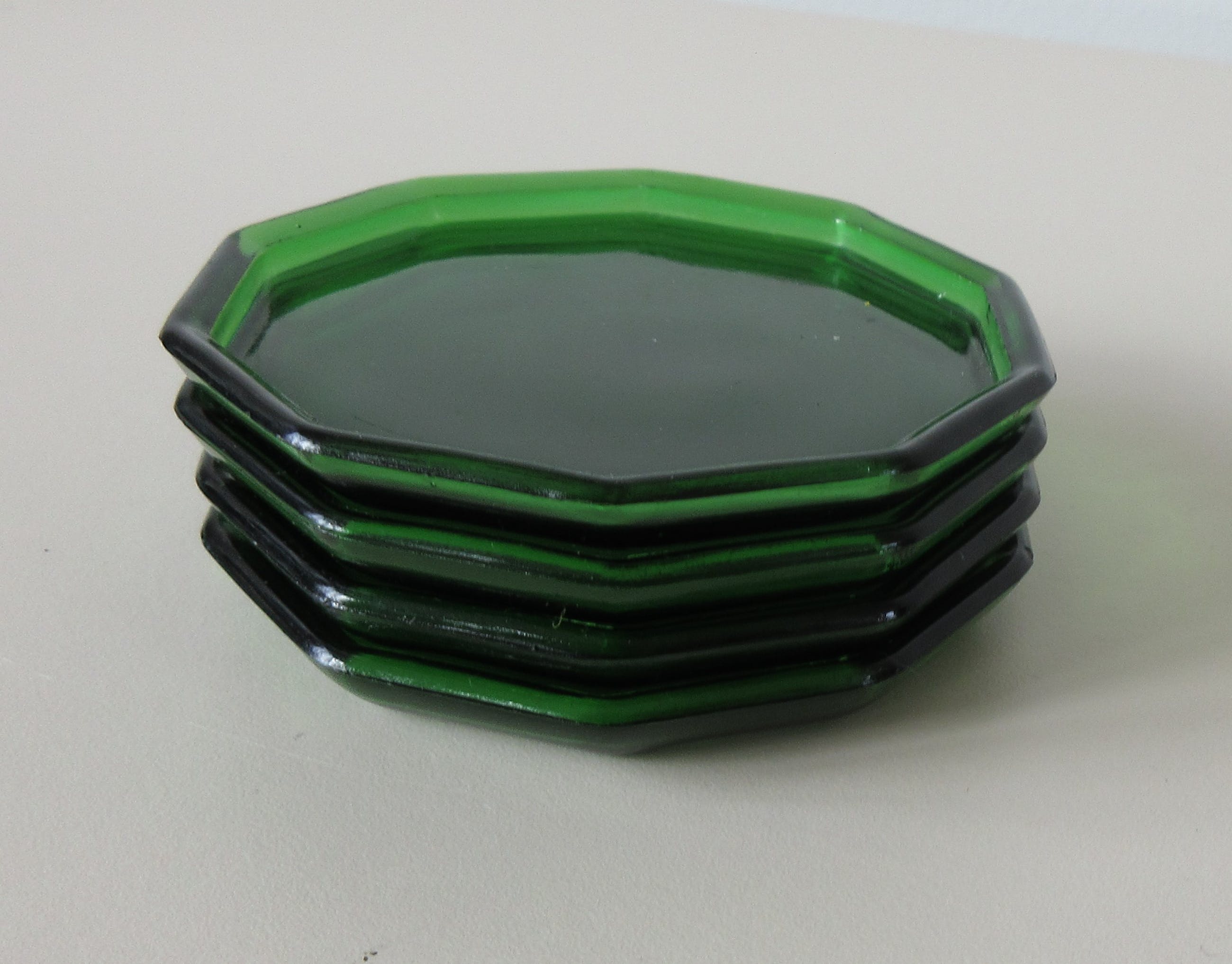 Tienkantige groenglazen onderzetters (4x), ontwerp K.P.C.de Bazel 1920, uitvoering Glasfabriek Leerdam