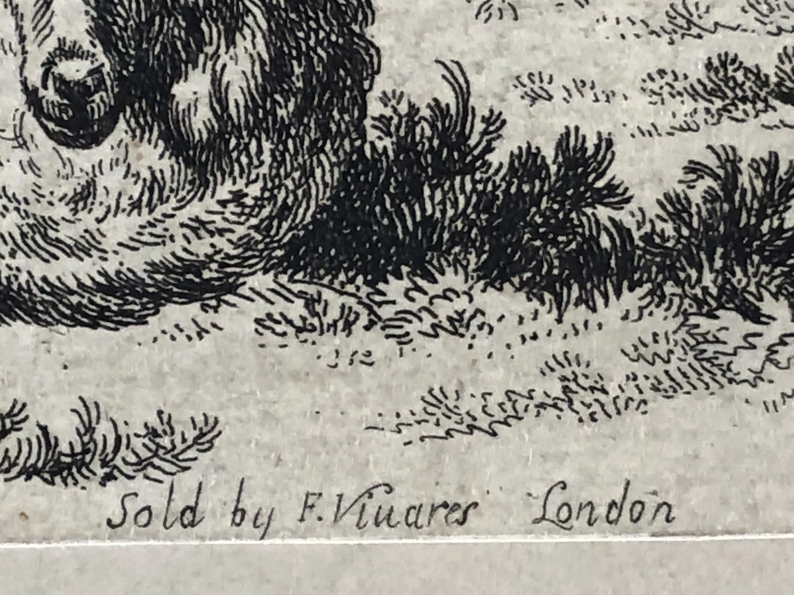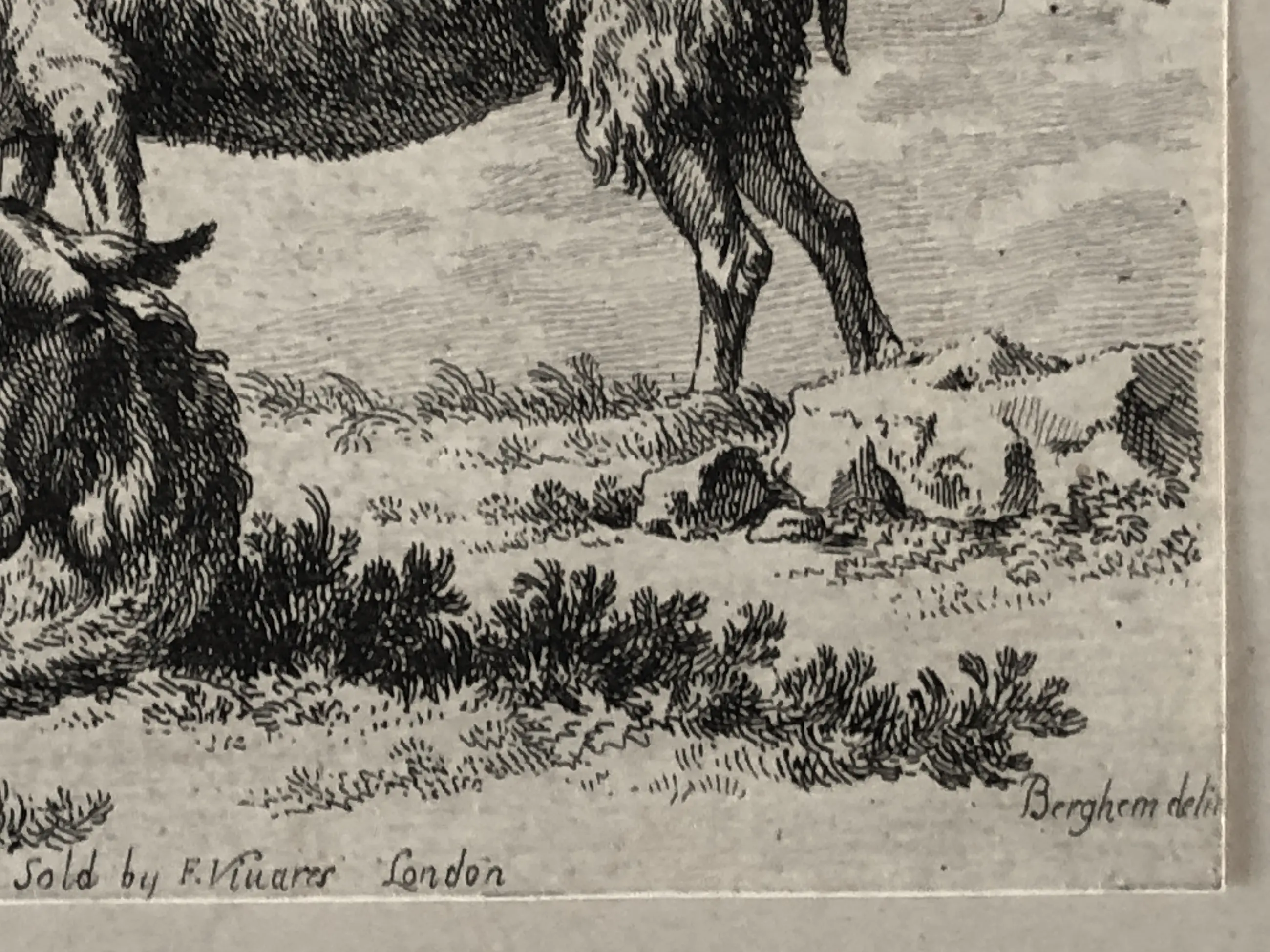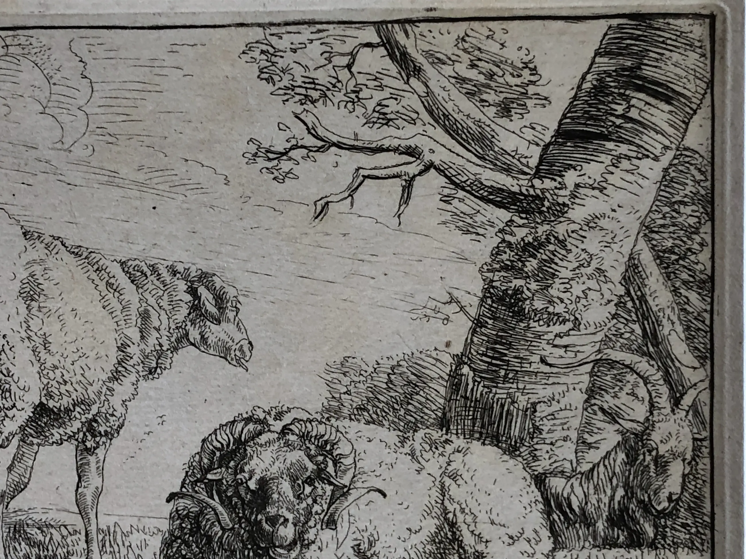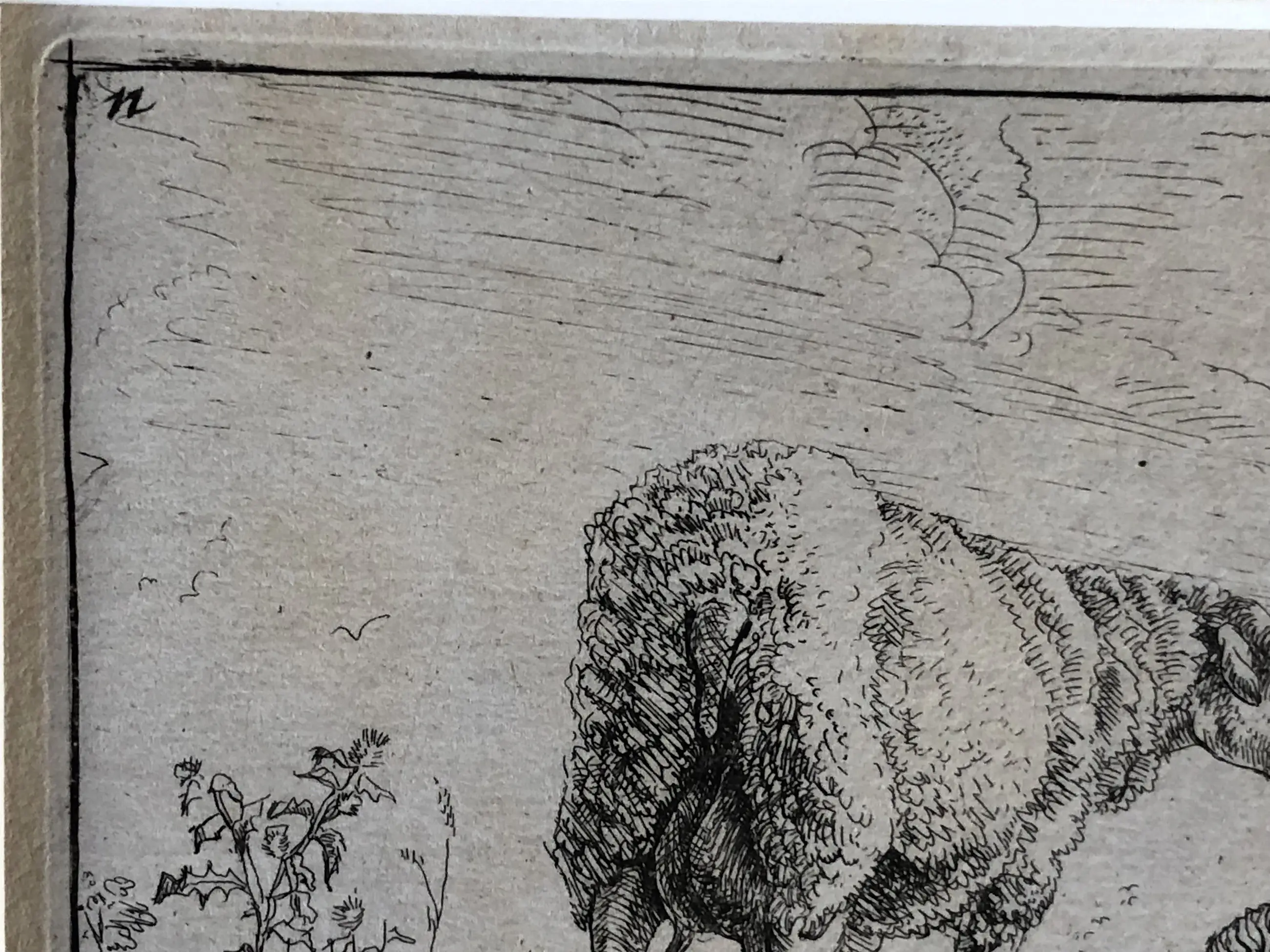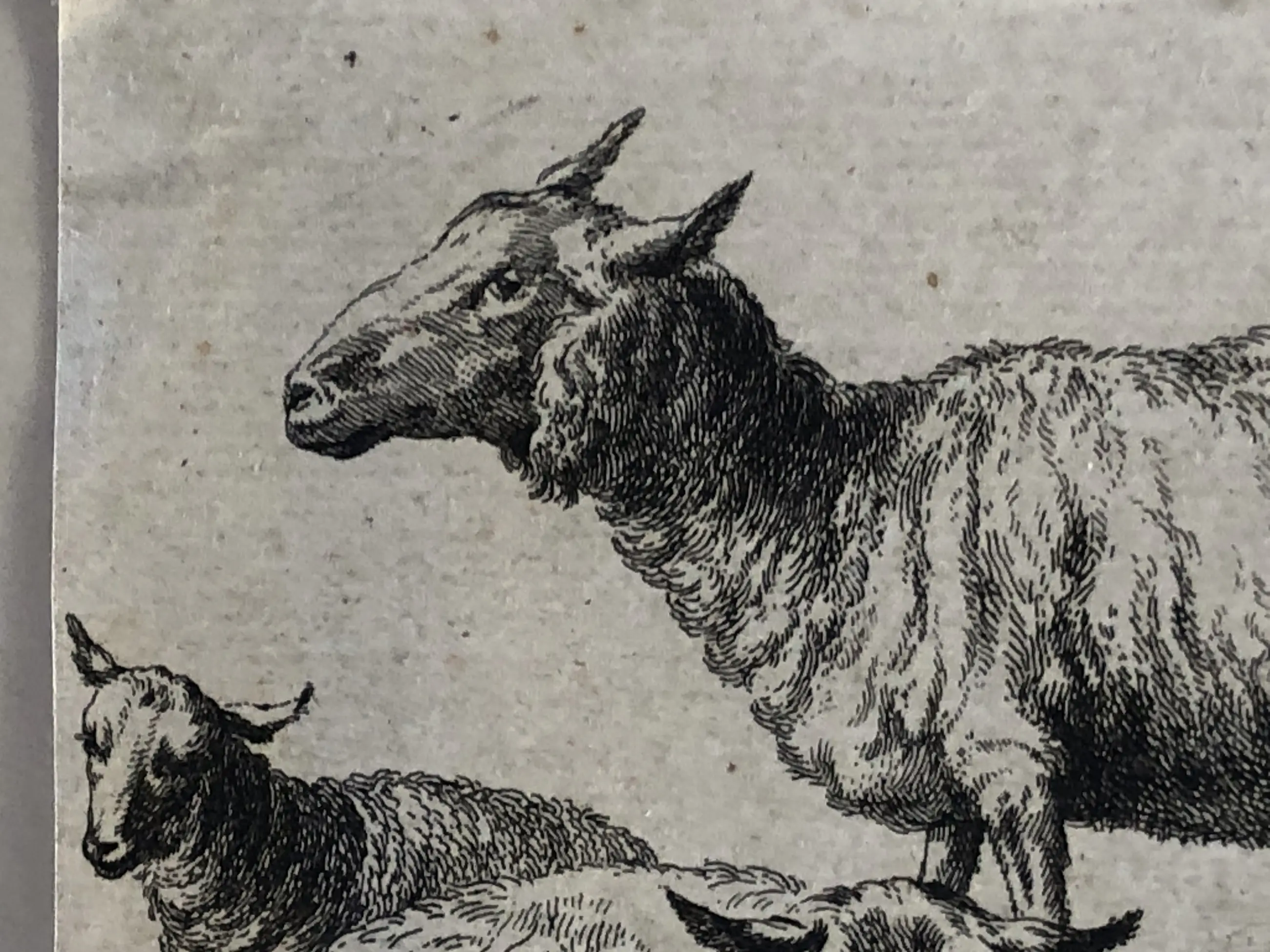 2.Nicolaas Berchem (1620-1683), Twee schapen en een geit, ets ±1650. Signatuur “B” linksonder, nummer 11 uit de reeks linksboven. Afbeelding tot de contourlijn 9,6 x 14 cm, papier 13,5 x 18,5 cm. Aan achterzijde papier licht gevlekt, aan voorzijde niet of nauwelijks zichtbaar (zie foto’s). Mogelijk latere druk (watermerk vertikale strepen). Met zeer smalle (2mm) zuurvrije tape aan de bovenzijde onder passe-partout.