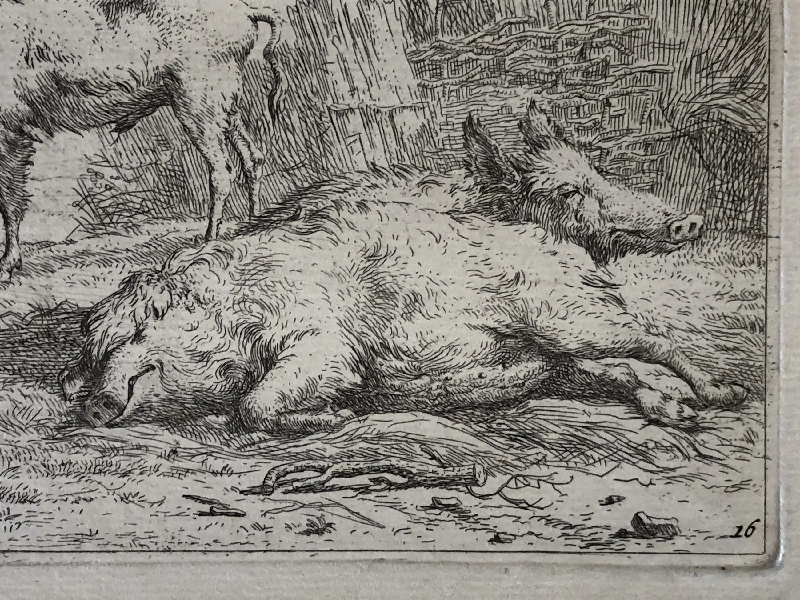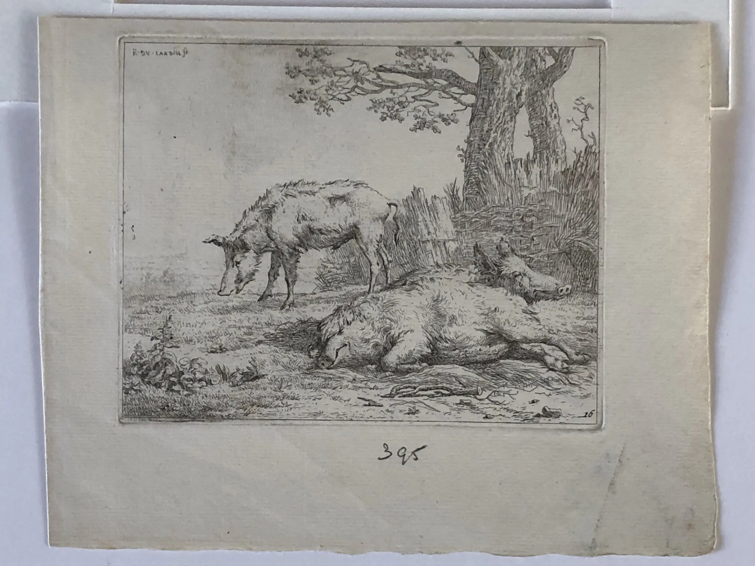 1. Karel Dujardin, Twee zwijnen, ets midden 17e eeuw. Signatuur in de plaat linksboven “K. du Jardin fe”. Afbeelding tot contourlijn 11,7 x 14,7 cm, papier 16,5 x 20,5 cm. Mogelijk latere druk (watermerk vertikale strepen). Lichte vouw alleen aan de achterzijde zichtbaar. Verder geheel gaaf met ruime marges. Met zeer smalle (2mm) zuurvrije tape aan de bovenzijde onder passe-partout.