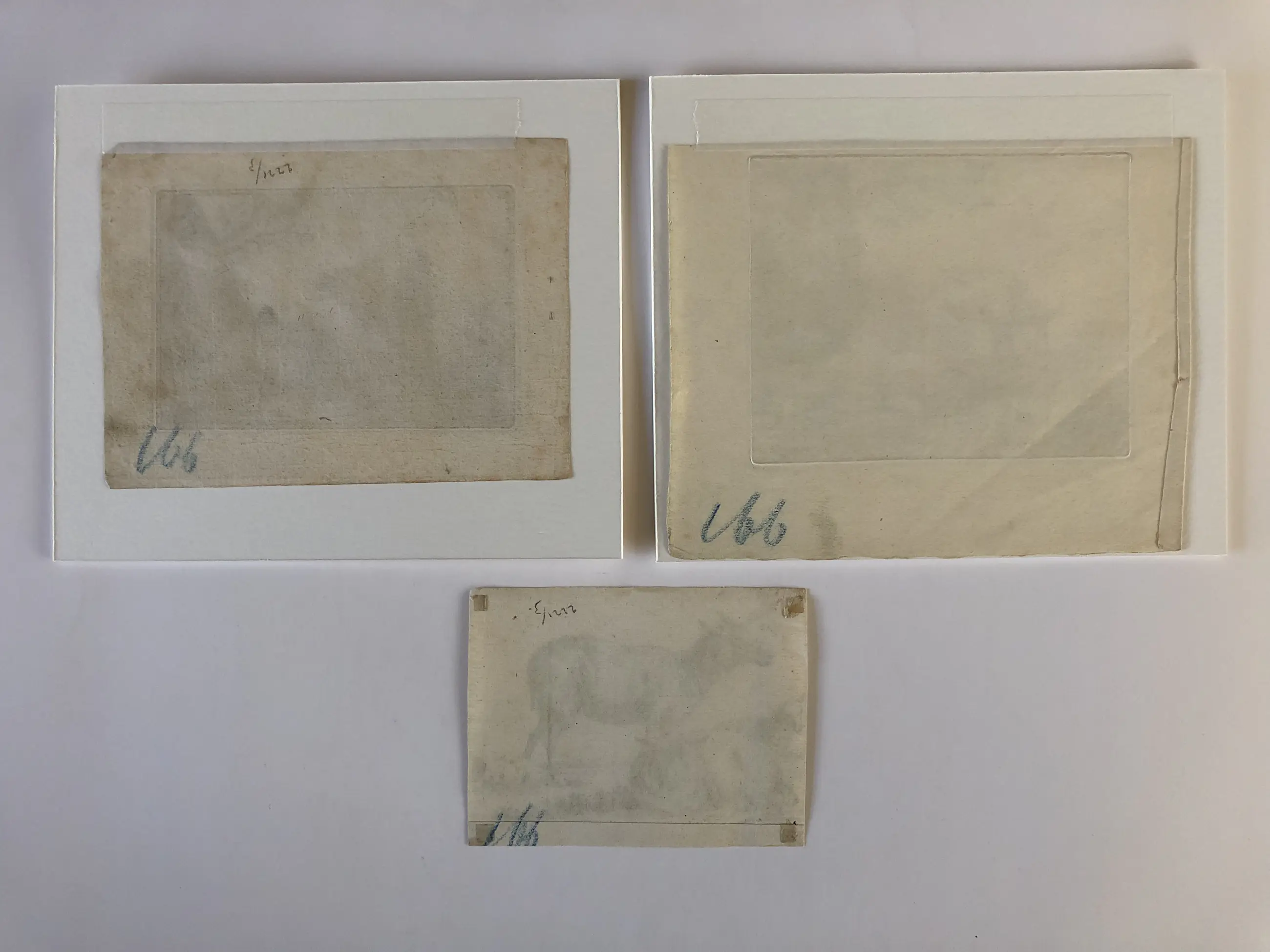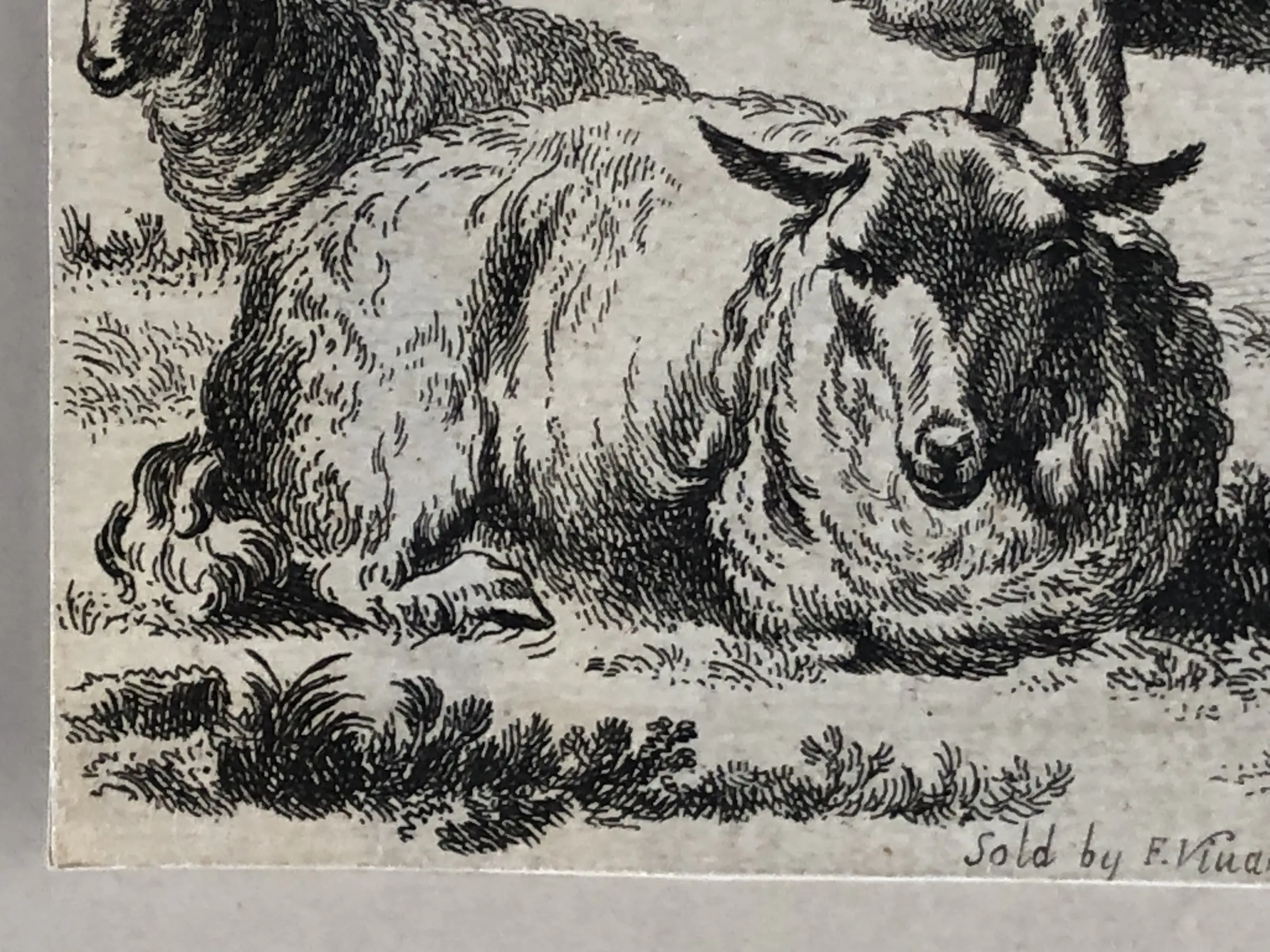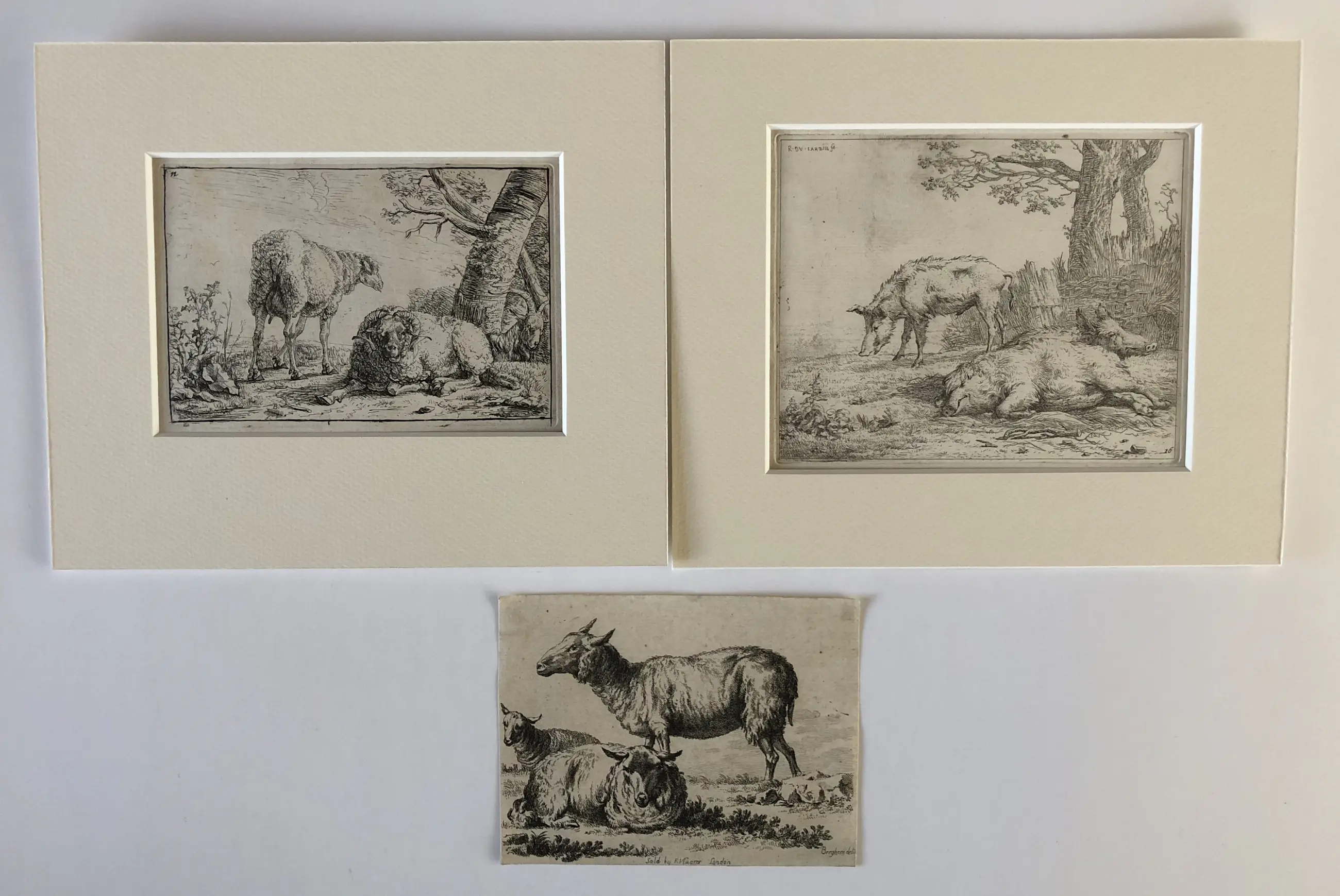 3. Nicolaas Berchem (1620-1683), Drie schapen, ets bijgesneden over de contourlijn heen. Onvolledige signatuur “Berghem delin” rechtsonder, vermelding uitgever midden onder. Huidige formaat 10,5 x 13,5 cm. Aan achterzijde drie kleine taperesten en nummers in potlood. Mogelijk latere druk (watermerk vertikale strepen).