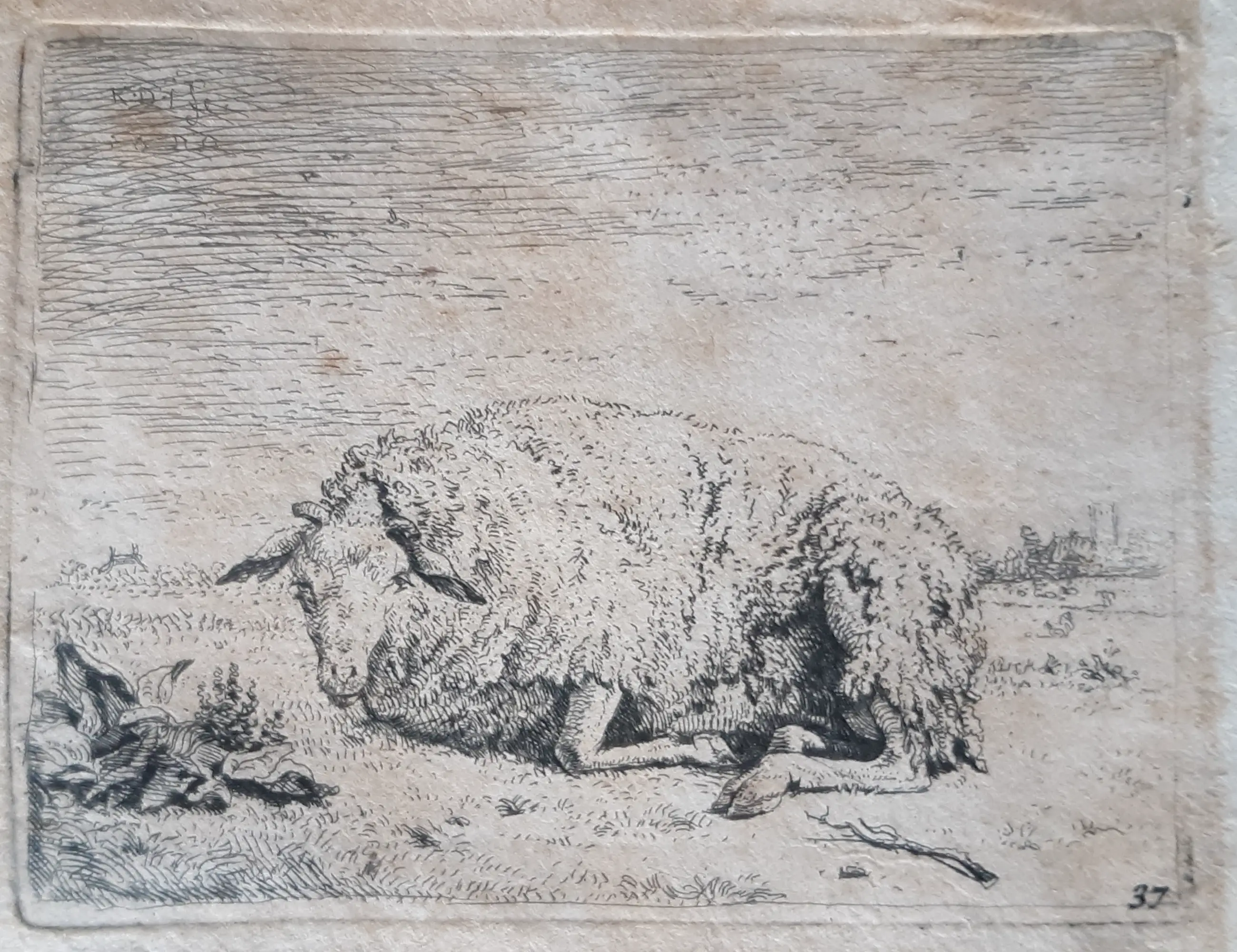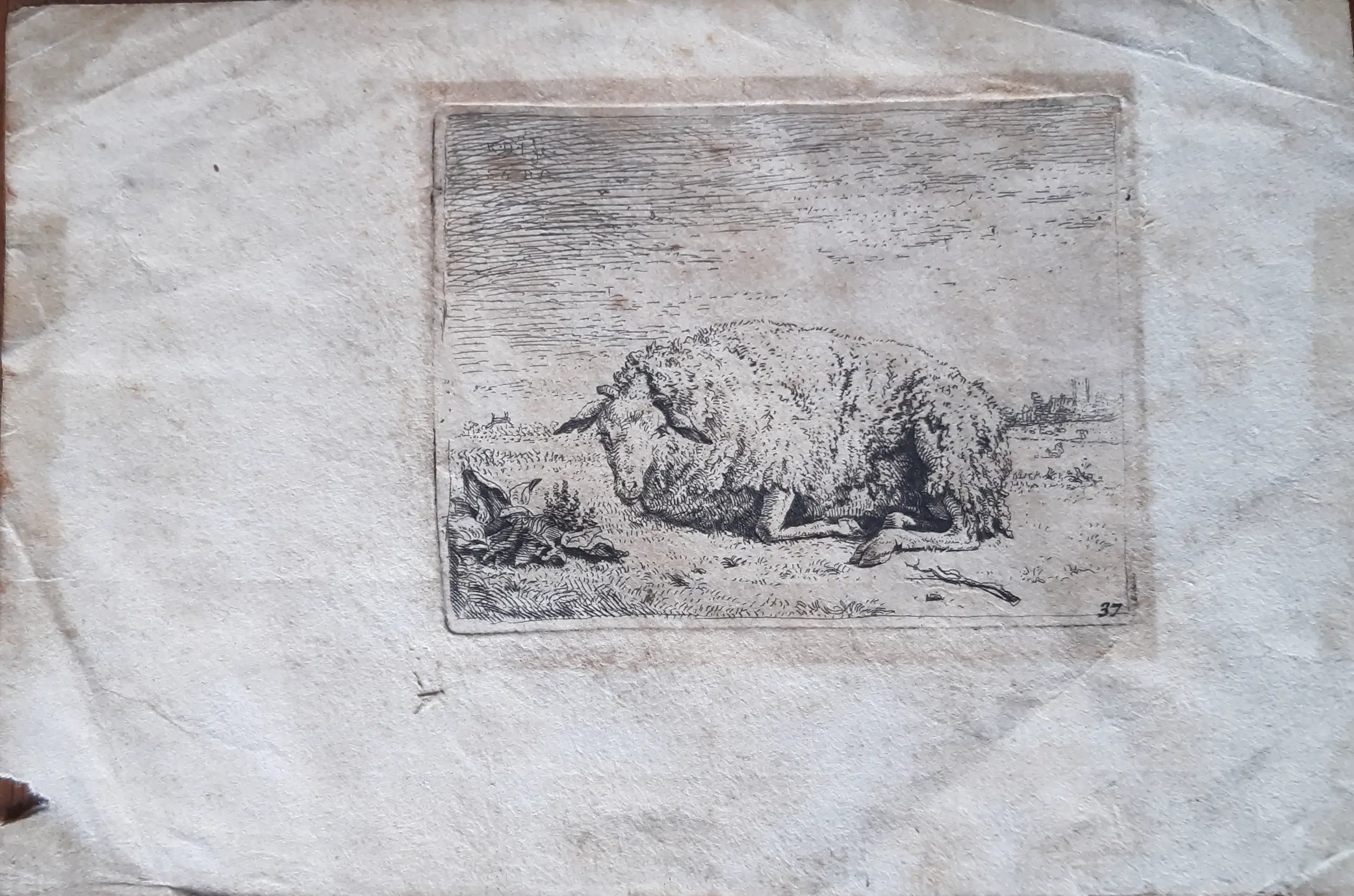 Het papier is bruin verkleurd, de ets is redelijk. Initialen staan links boven in de druk.