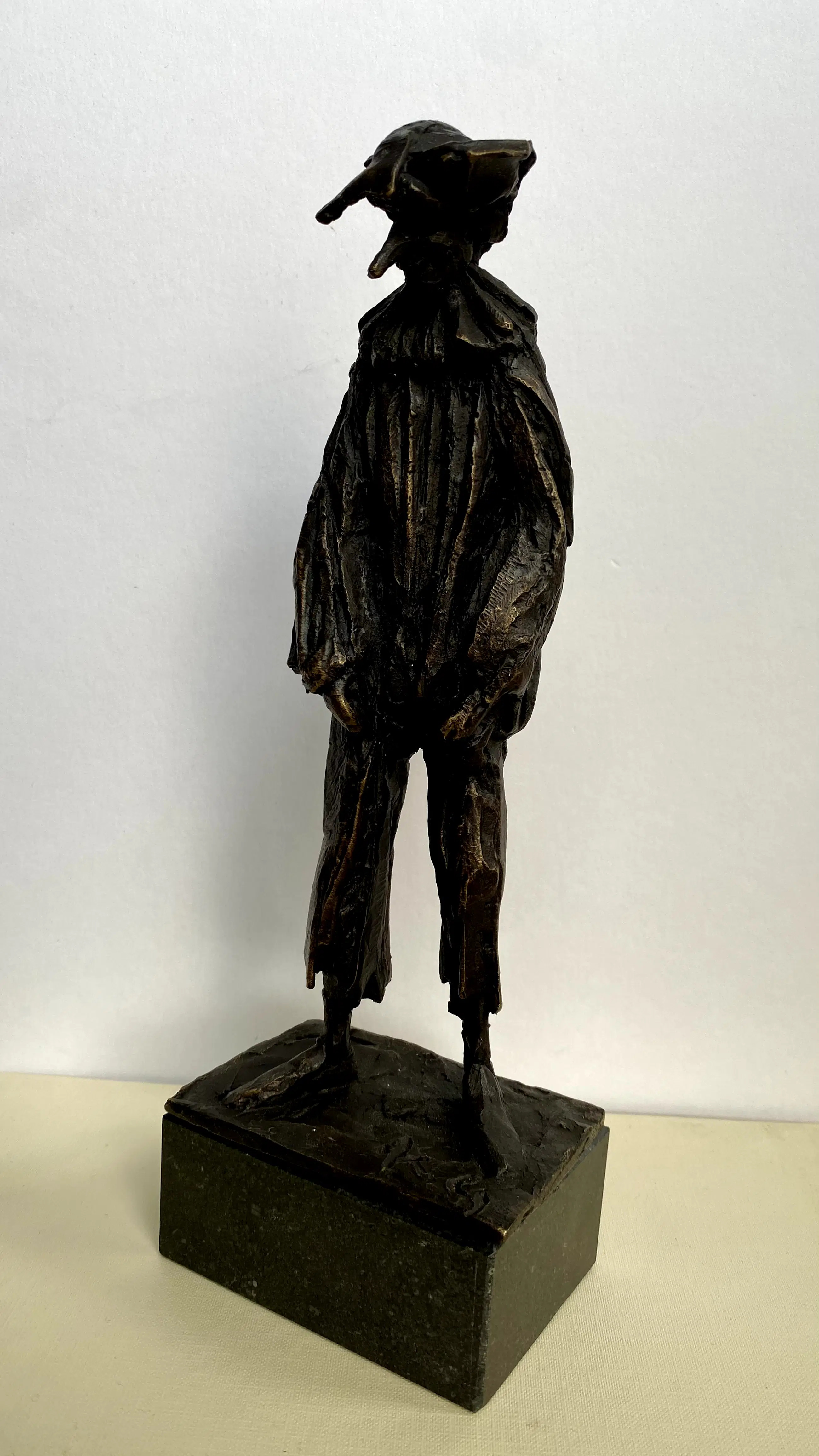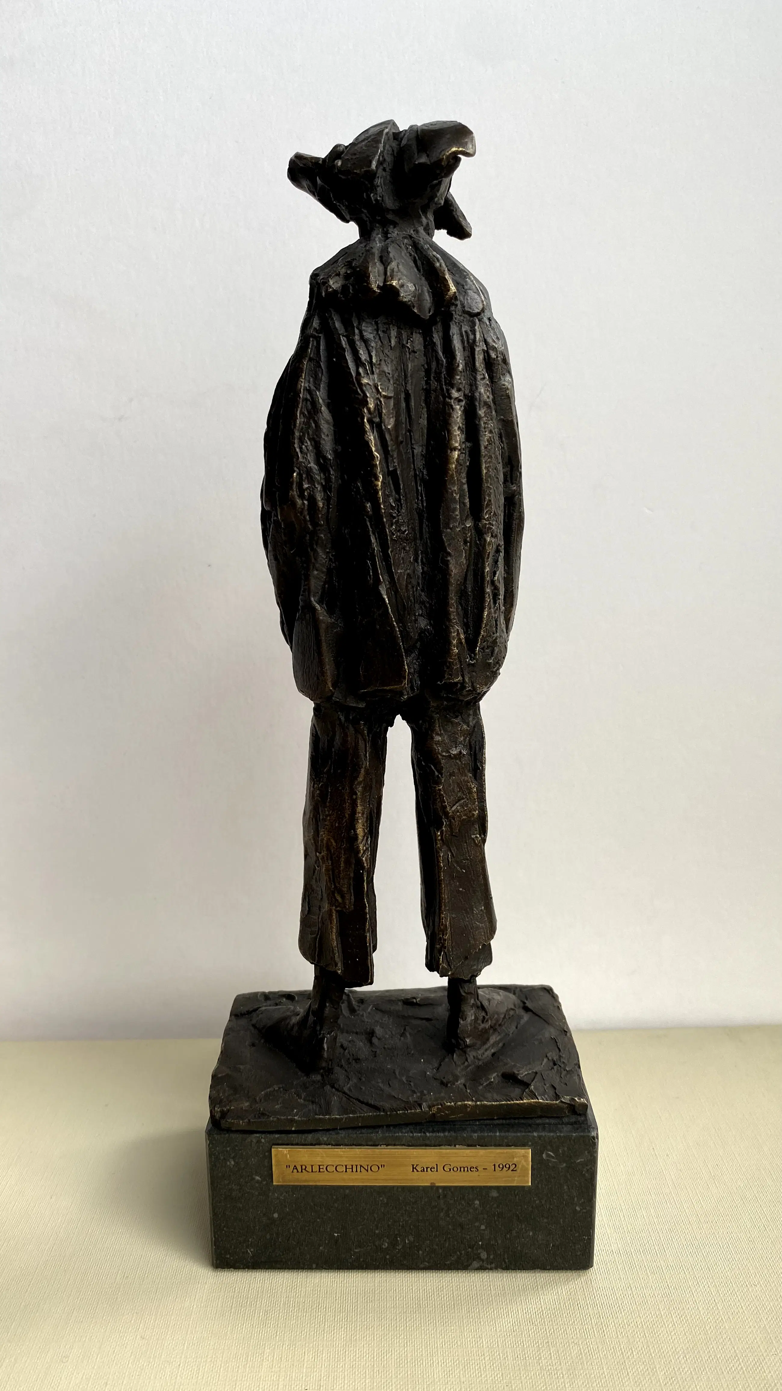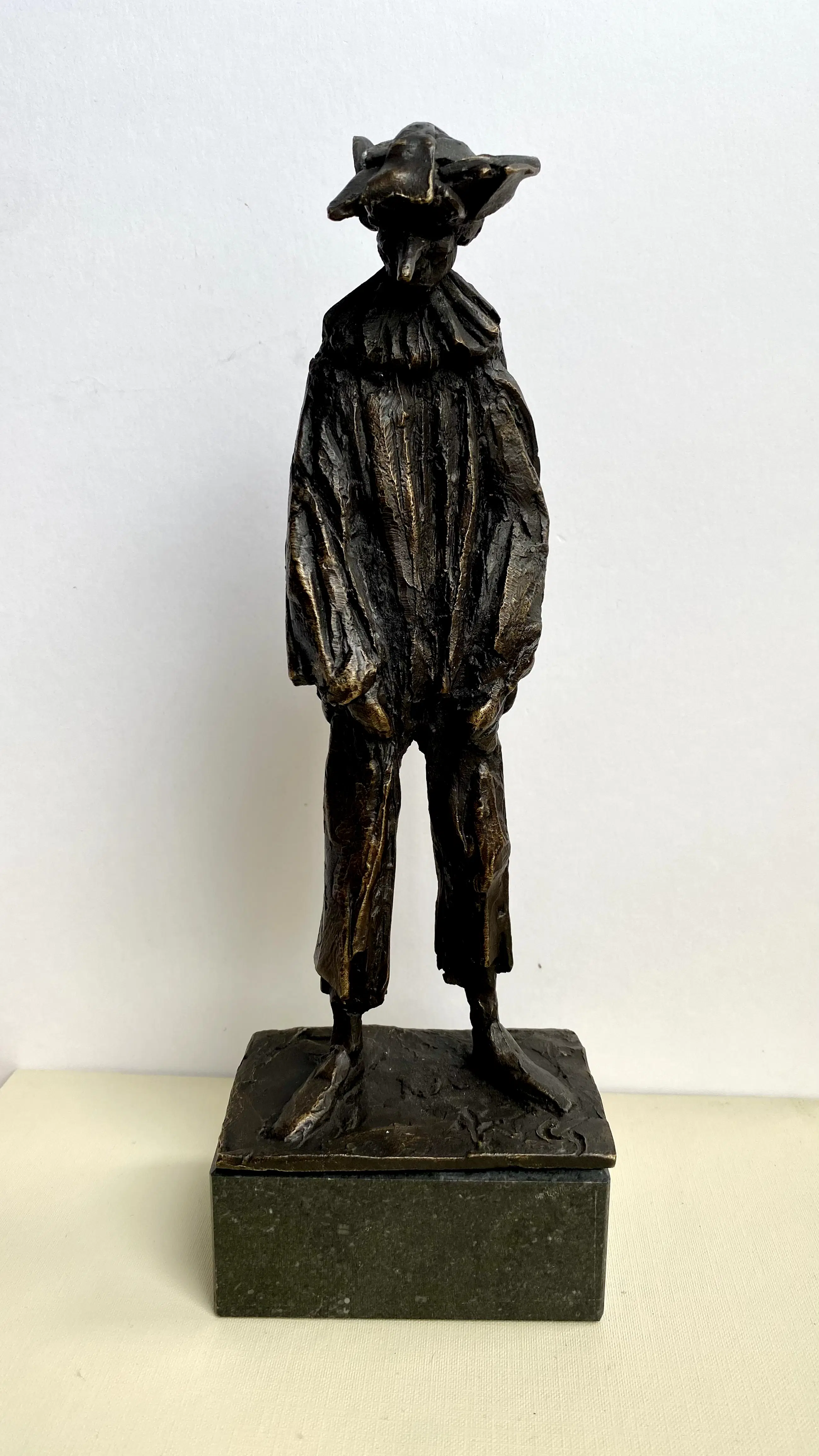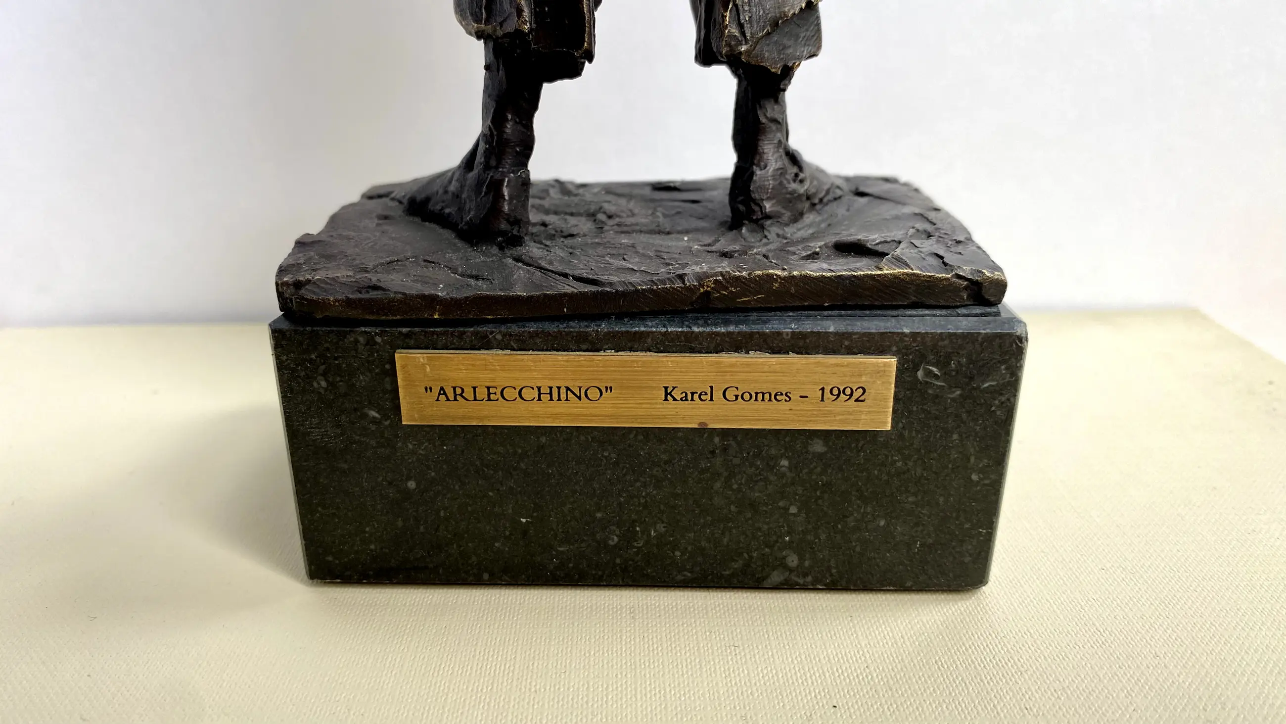 Bronzen 'arlecchino' (harlekijn of nar) uit de commedia dell'arte, een Italiaanse vorm van improvisatietheater. Gesigneerd met 'KG' in de voet.