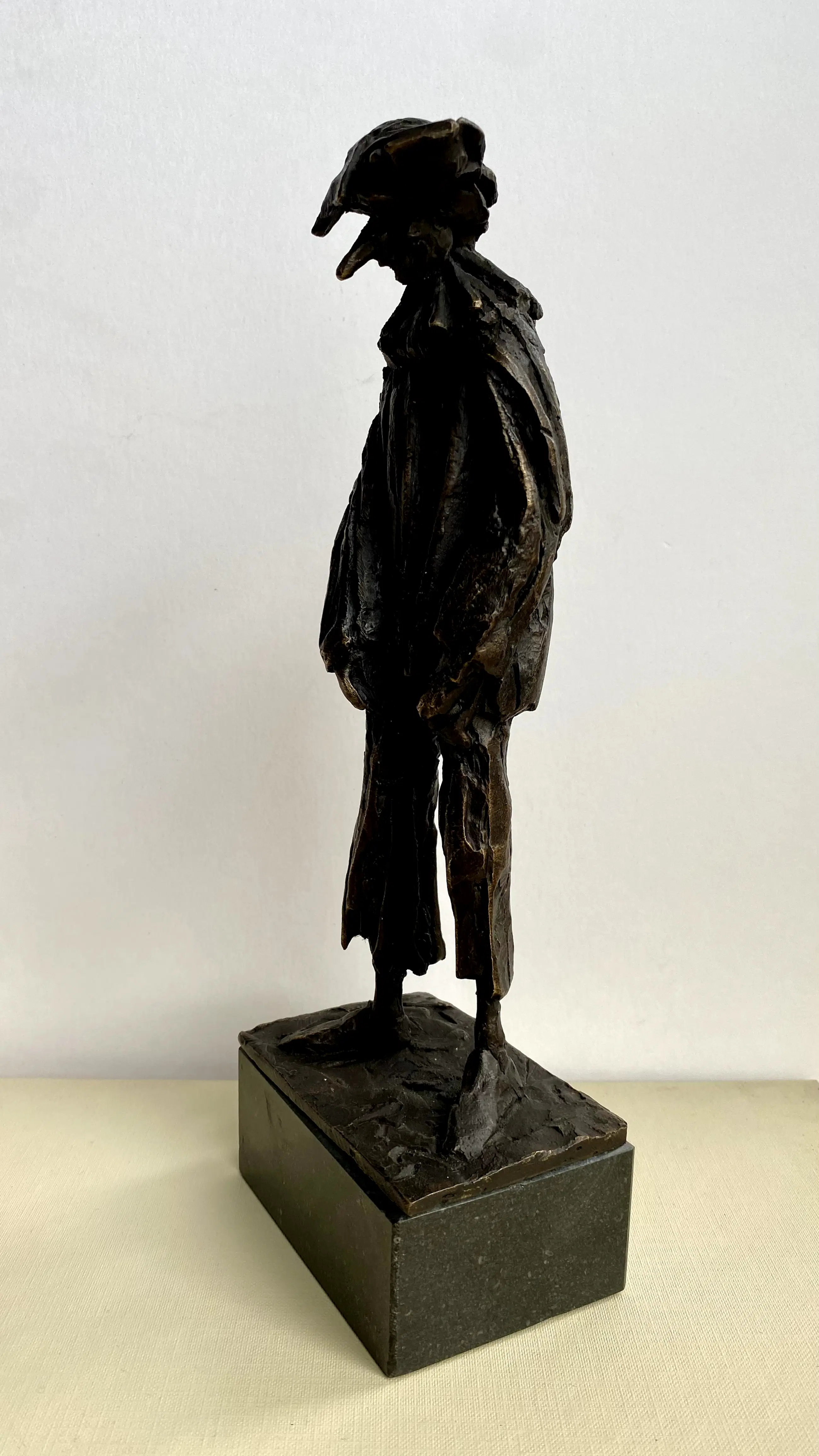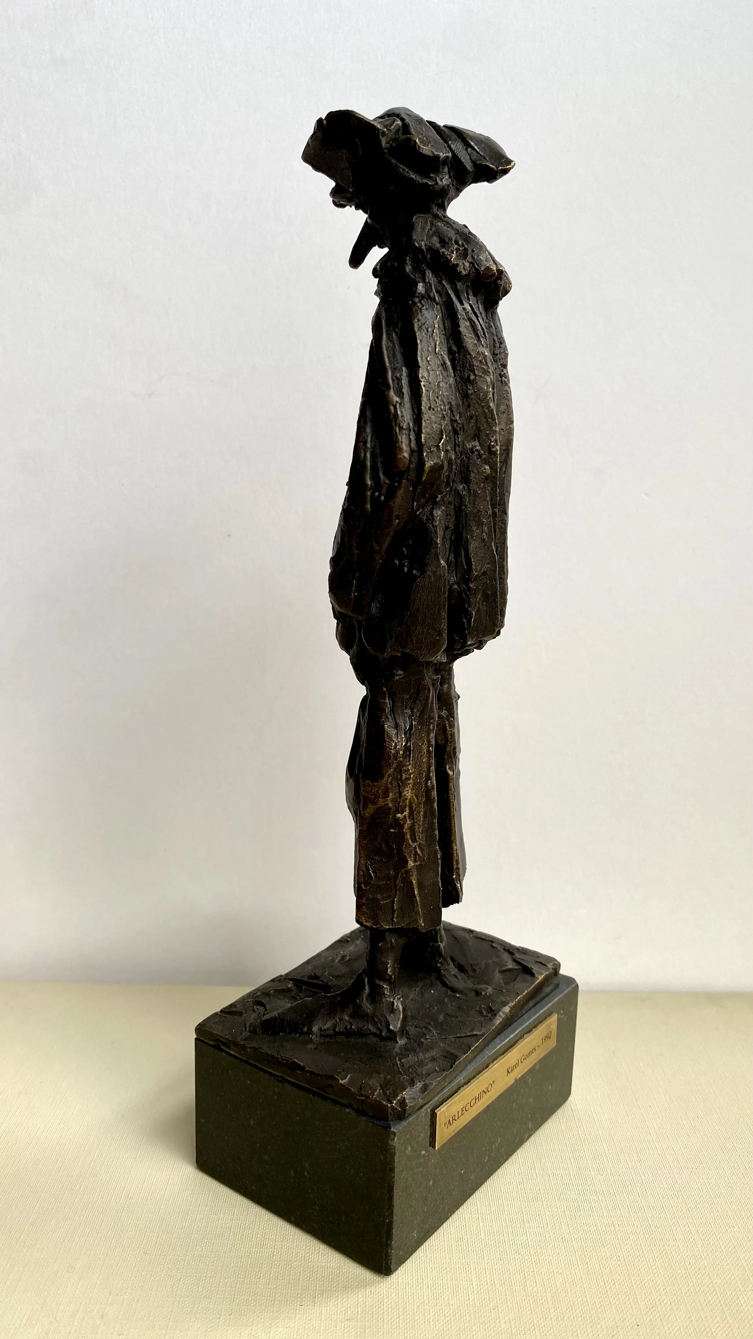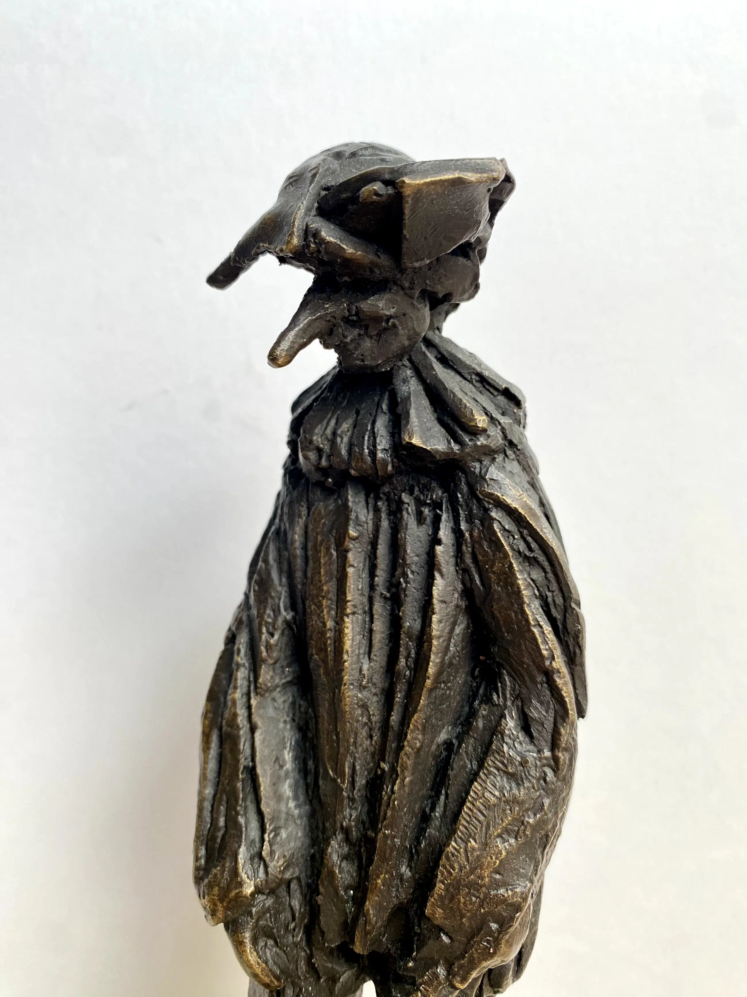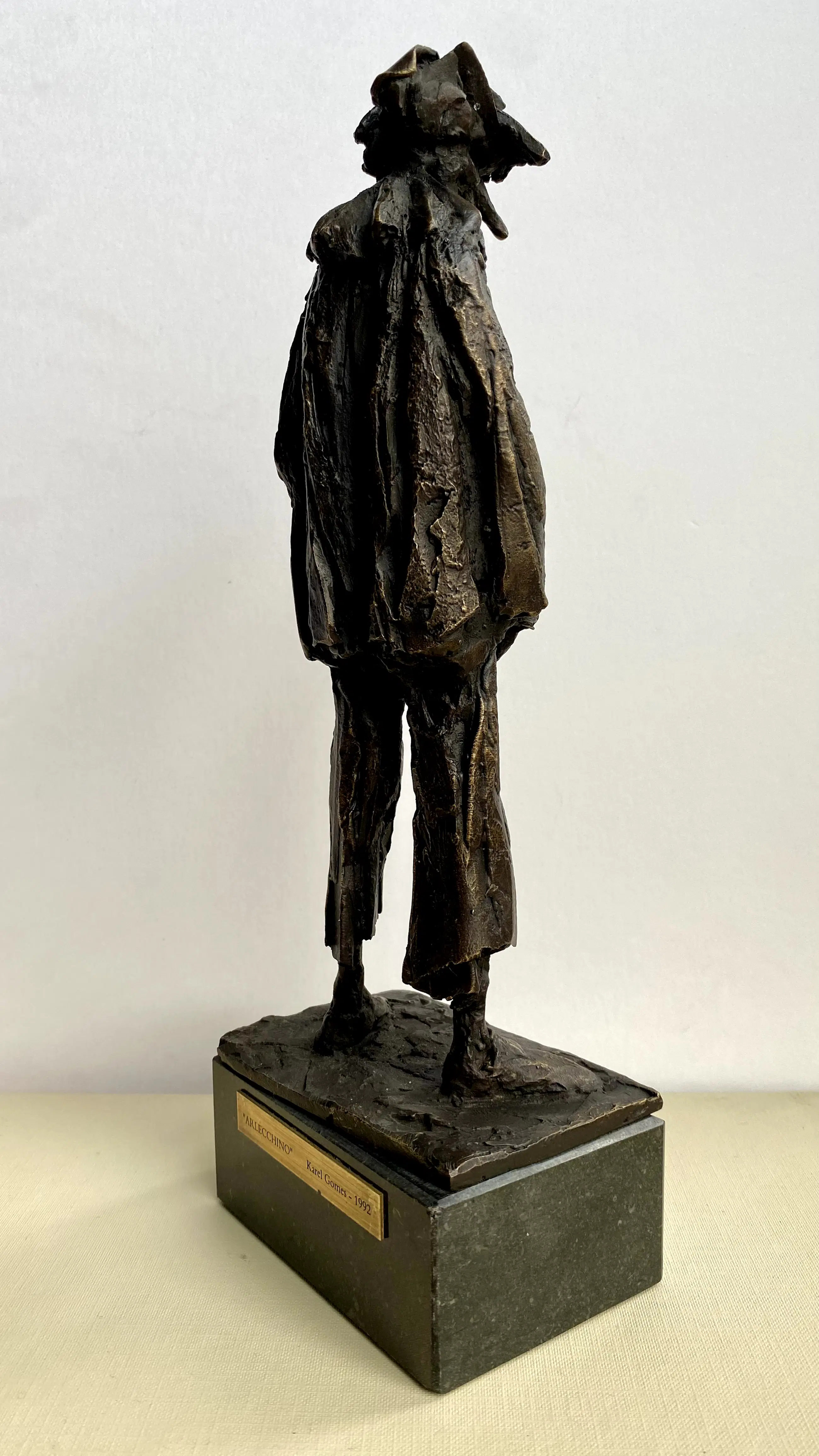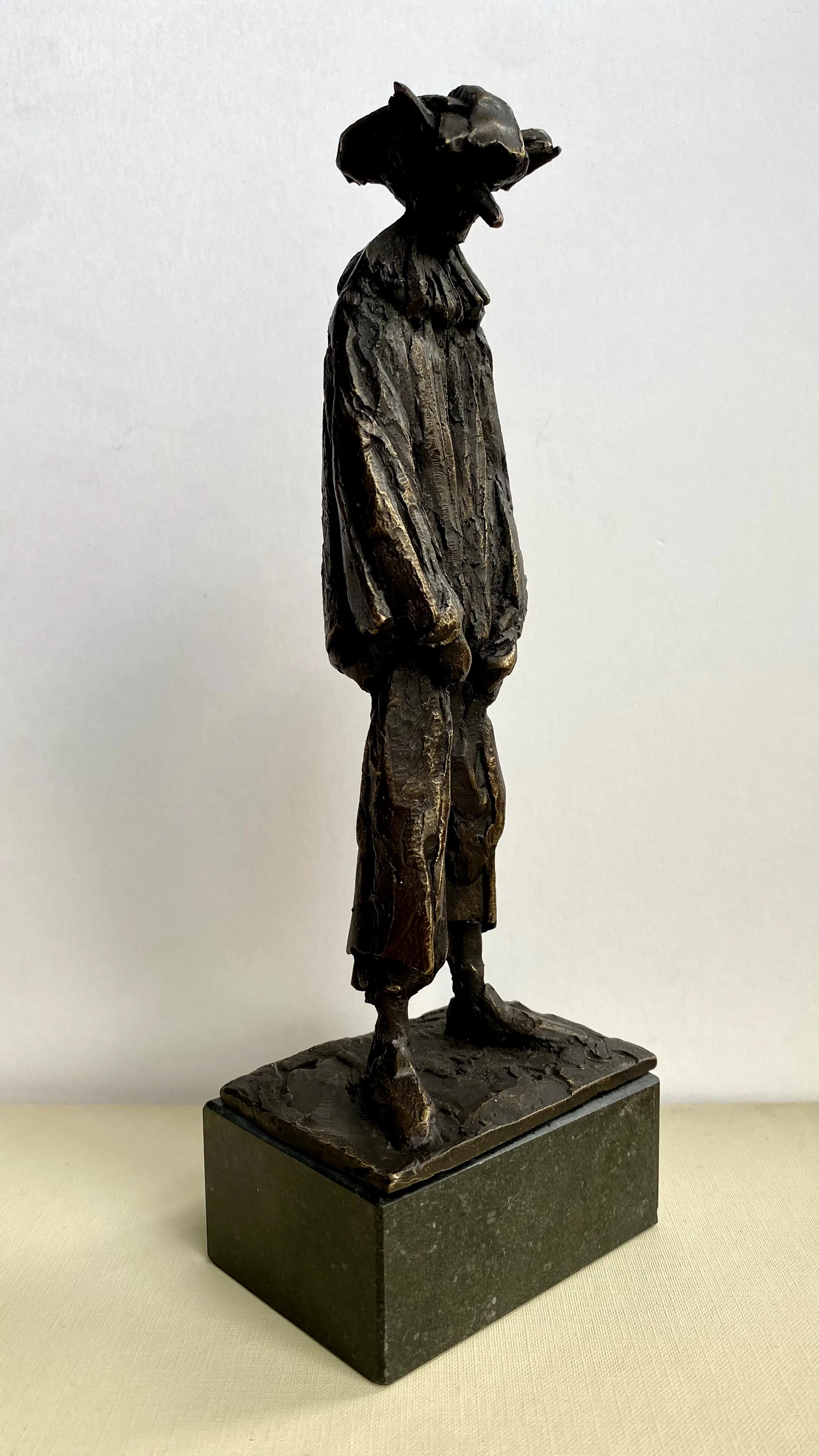 Bronzen 'arlecchino' (harlekijn of nar) uit de commedia dell'arte, een Italiaanse vorm van improvisatietheater. Gesigneerd met 'KG' in de voet.