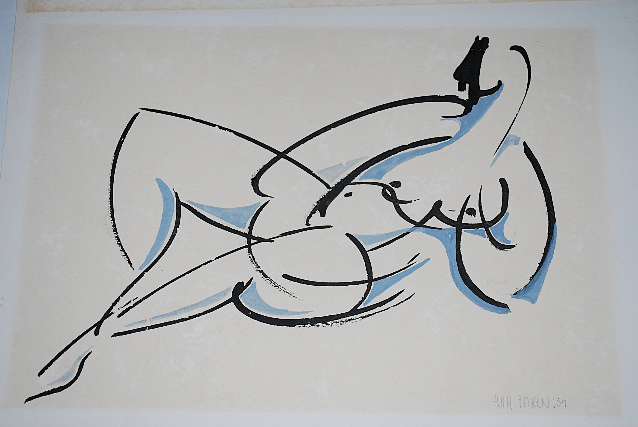 - Han Faken (1939): inkttekening met blauw, 1964, klein gerepareerd scheurtje, 25x35 cm
