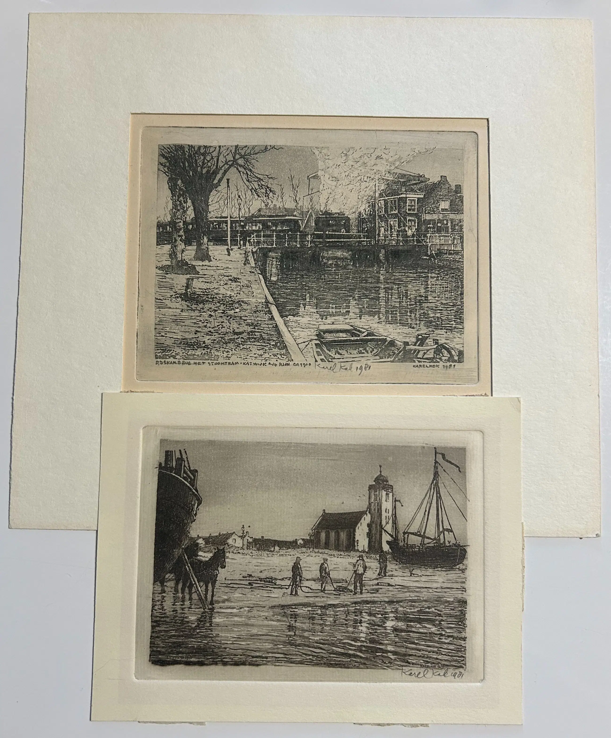 Set van 2 kunstwerkjes van Karel Kok. Lot van twee mooie kunstwerkjes, beide in goede staat. De afmetingen van het grotere werk zijn zoals aangegeven, de kleinere heeft een hoogte van 9,5 cm en breedte van 12,5 cm (met passe-partout: 12 × 16 cm). Beide werken zijn netjes en verzorgd; zie foto’s voor verdere details en een volledige indruk van de kunstwerkjes.
