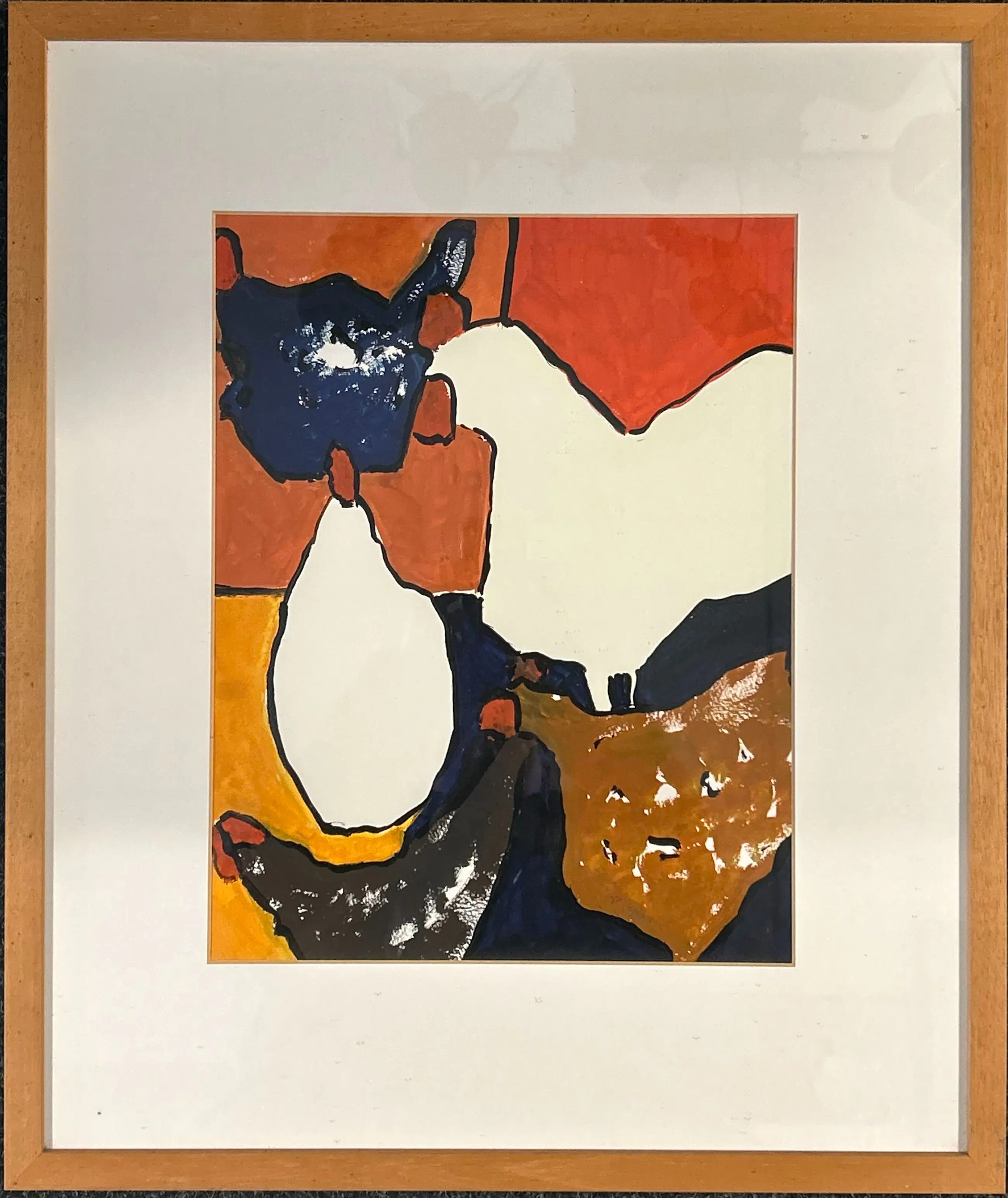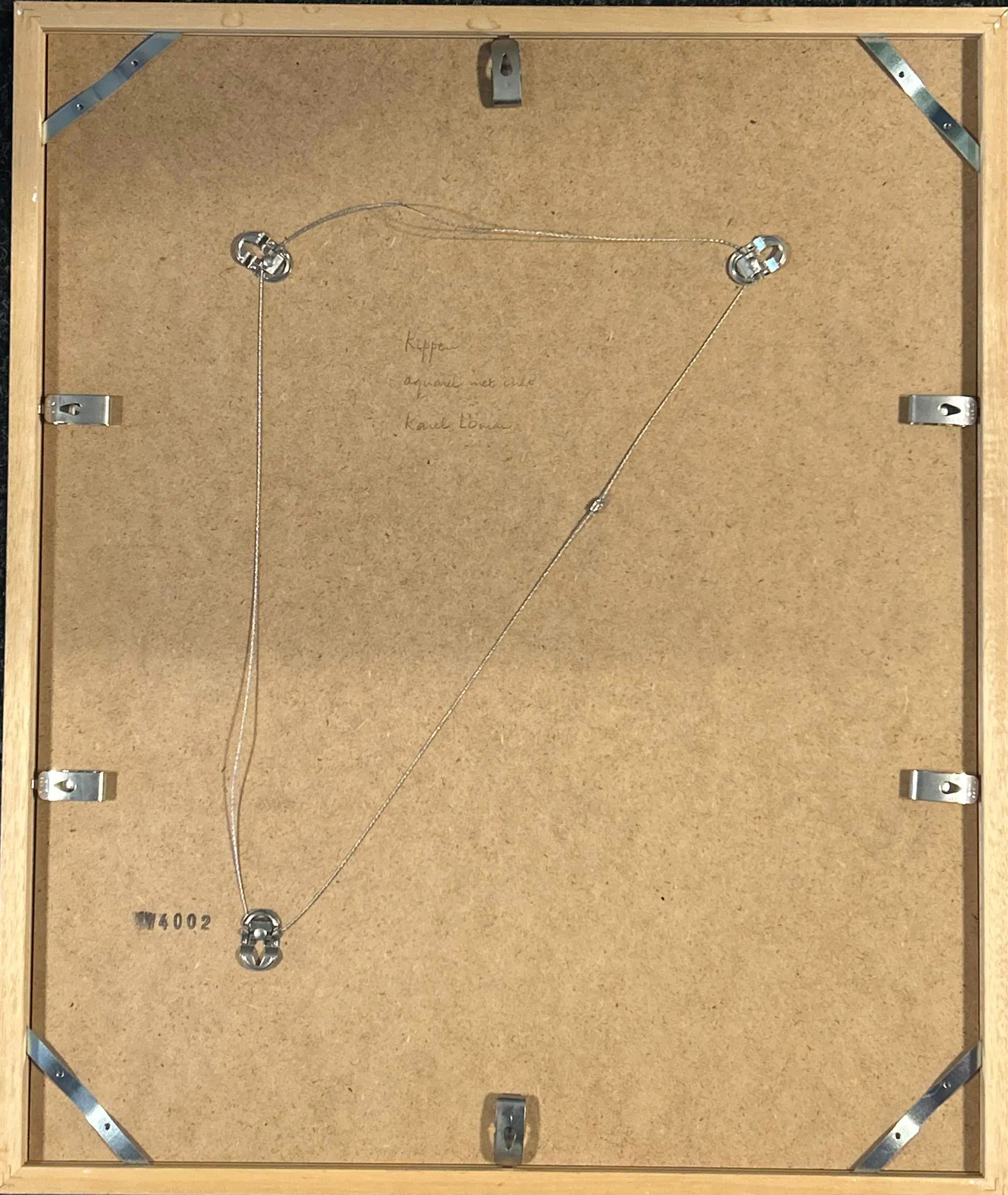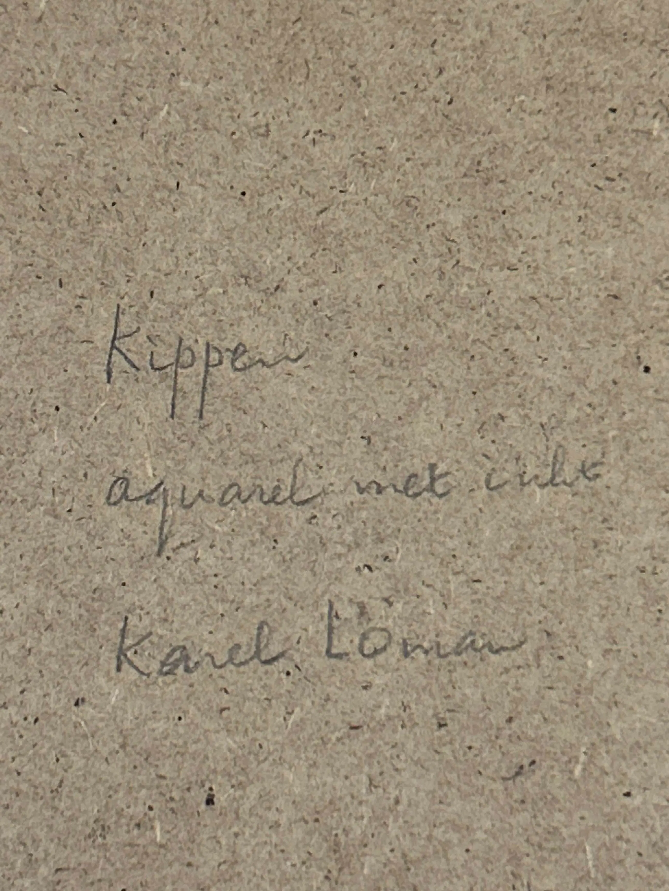 Aquarel met inkt van Karel Loman – Kippen (2002) Mooi werk van Karel Loman met een voorstelling van kippen, uitgevoerd in aquarel met inkt en gedateerd 2002. Het werk verkeert in goede staat, is ingelijst en bevindt zich achter glas. Zie foto’s voor een verdere indruk van het geheel en de staat van het werk.