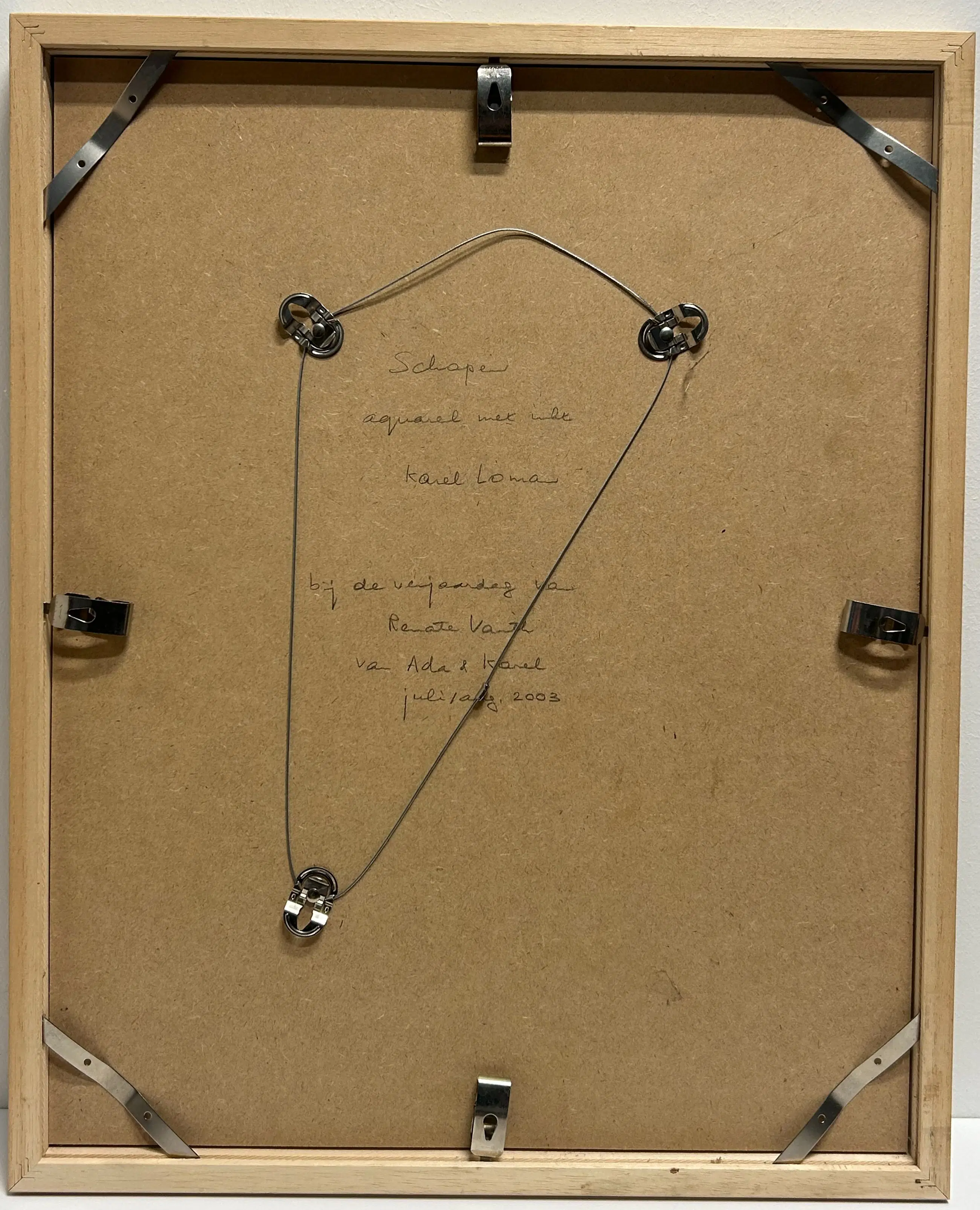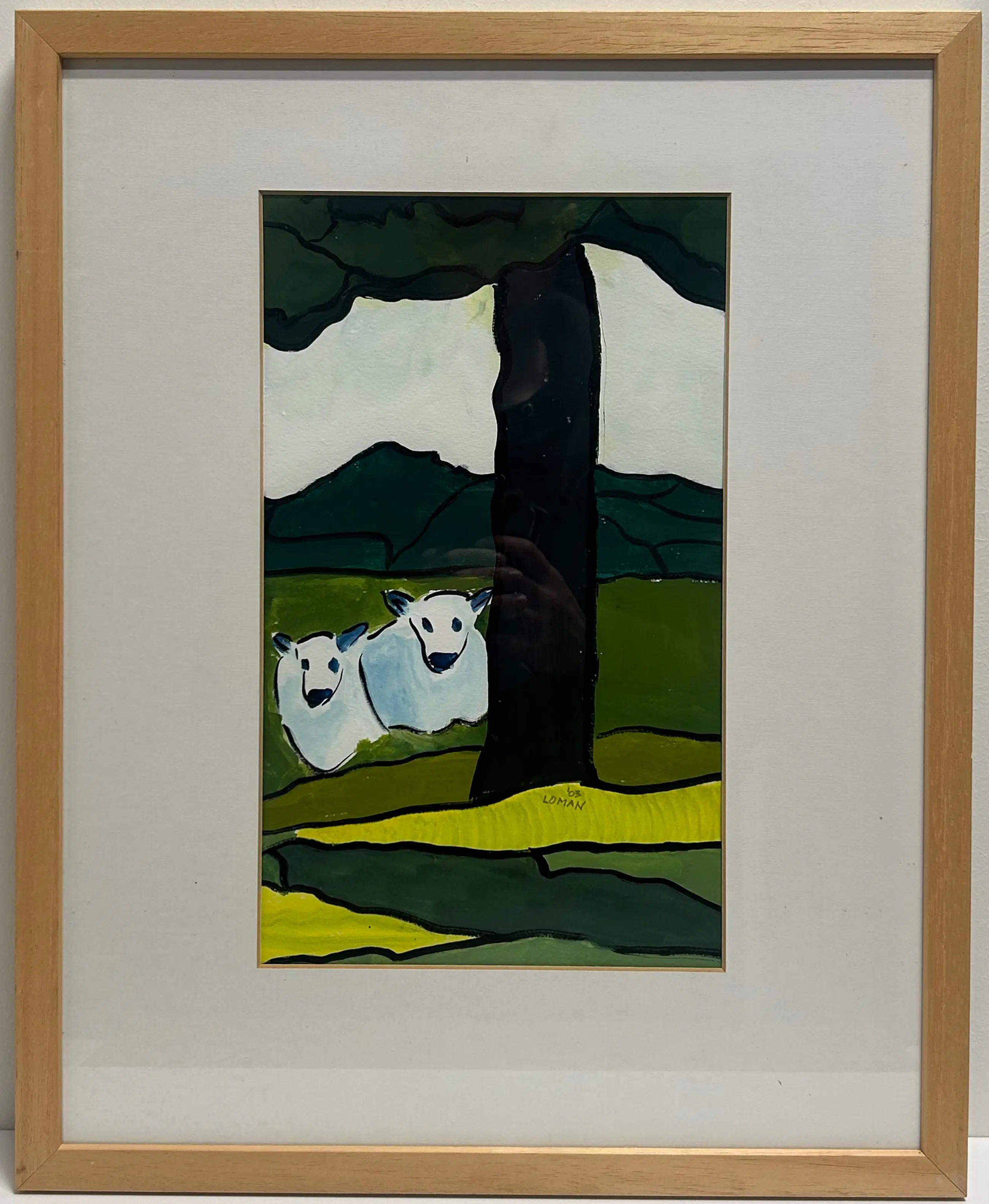 Een schilderij van Karel Loman, voorstellende twee schapen achter een boom. Het werk is typerend voor de stijl van de kunstenaar. Het schilderij is ingelijst met passe-partout en voorzien van glas. De lijst heeft een houten rand en vormt een passend geheel met het werk.