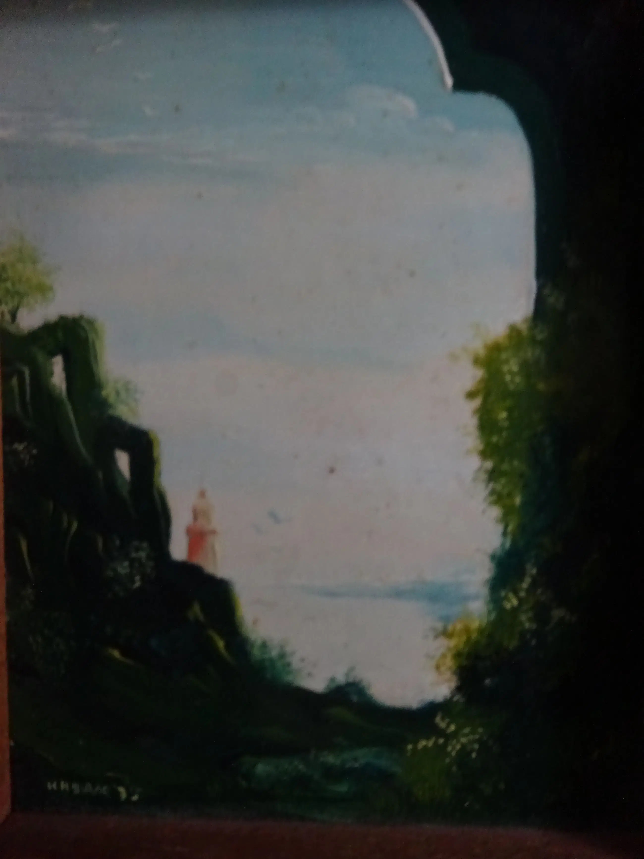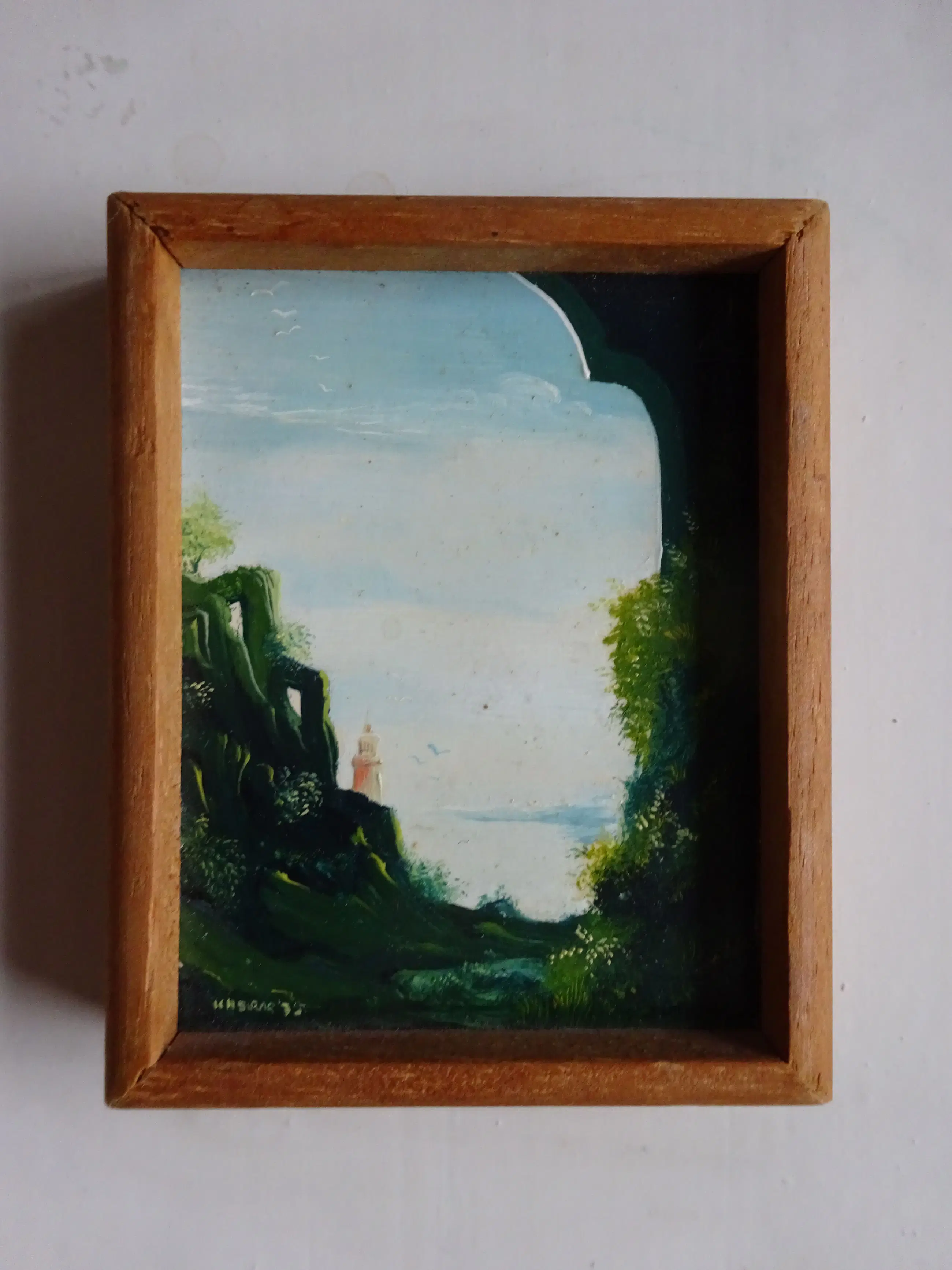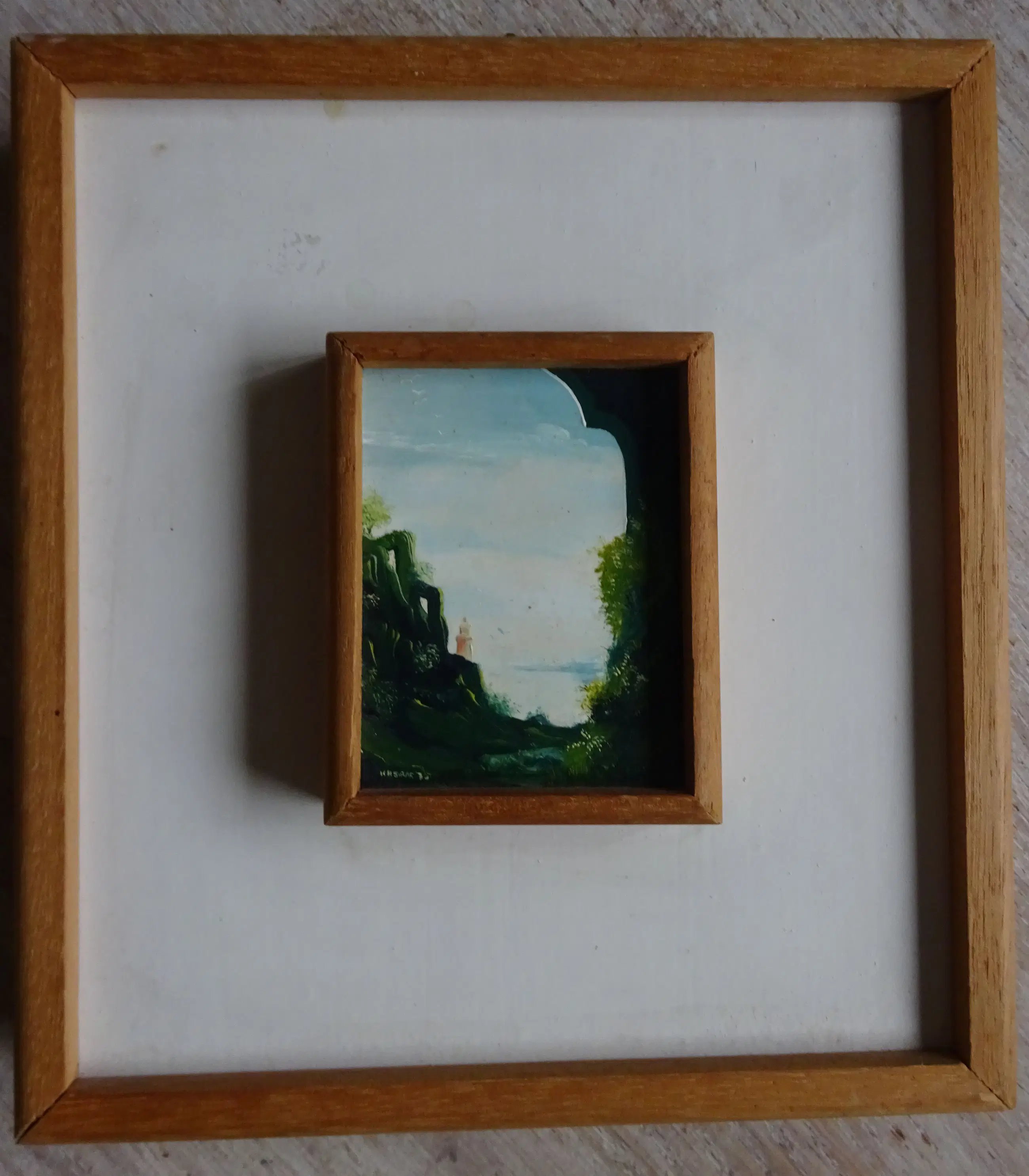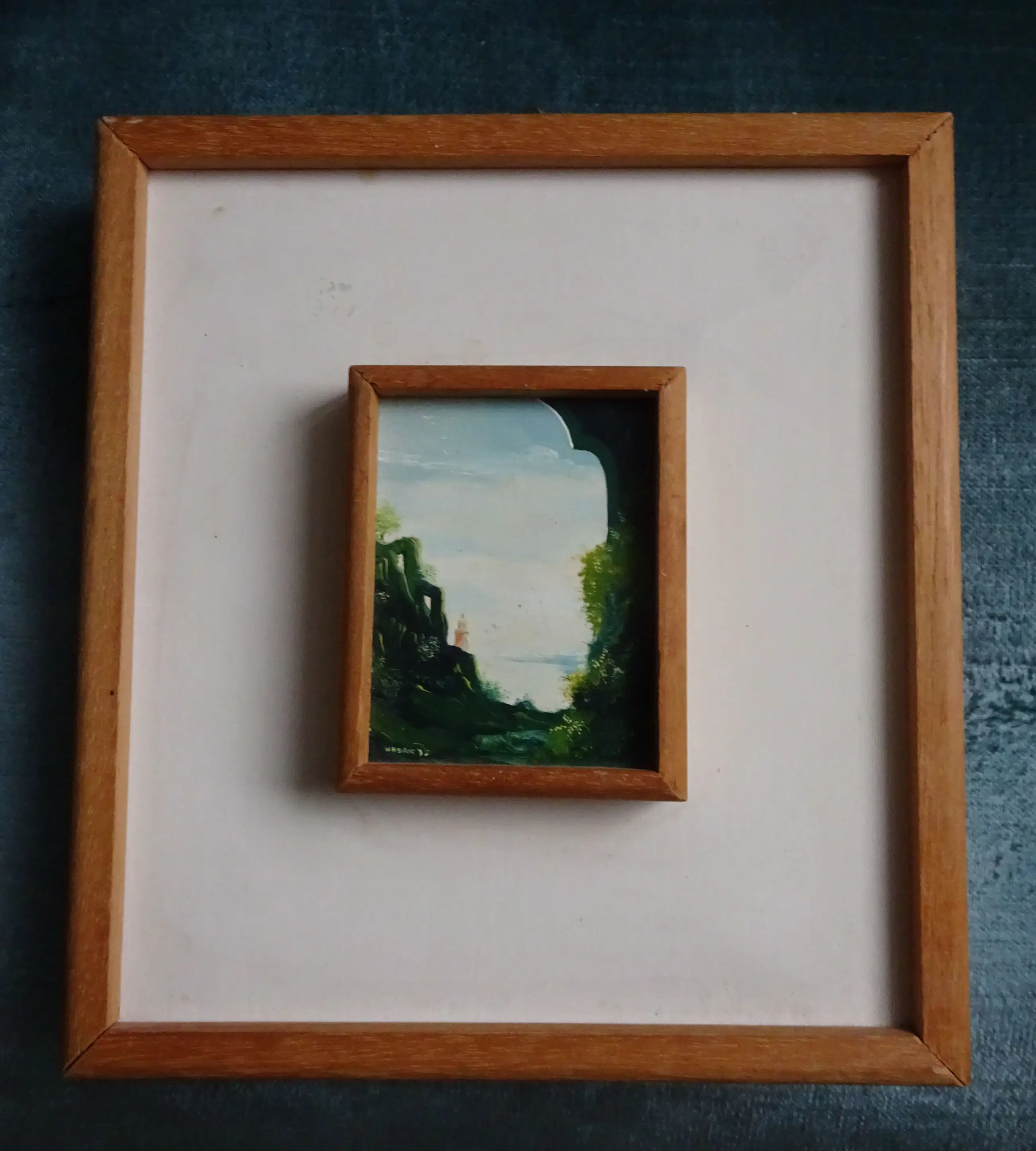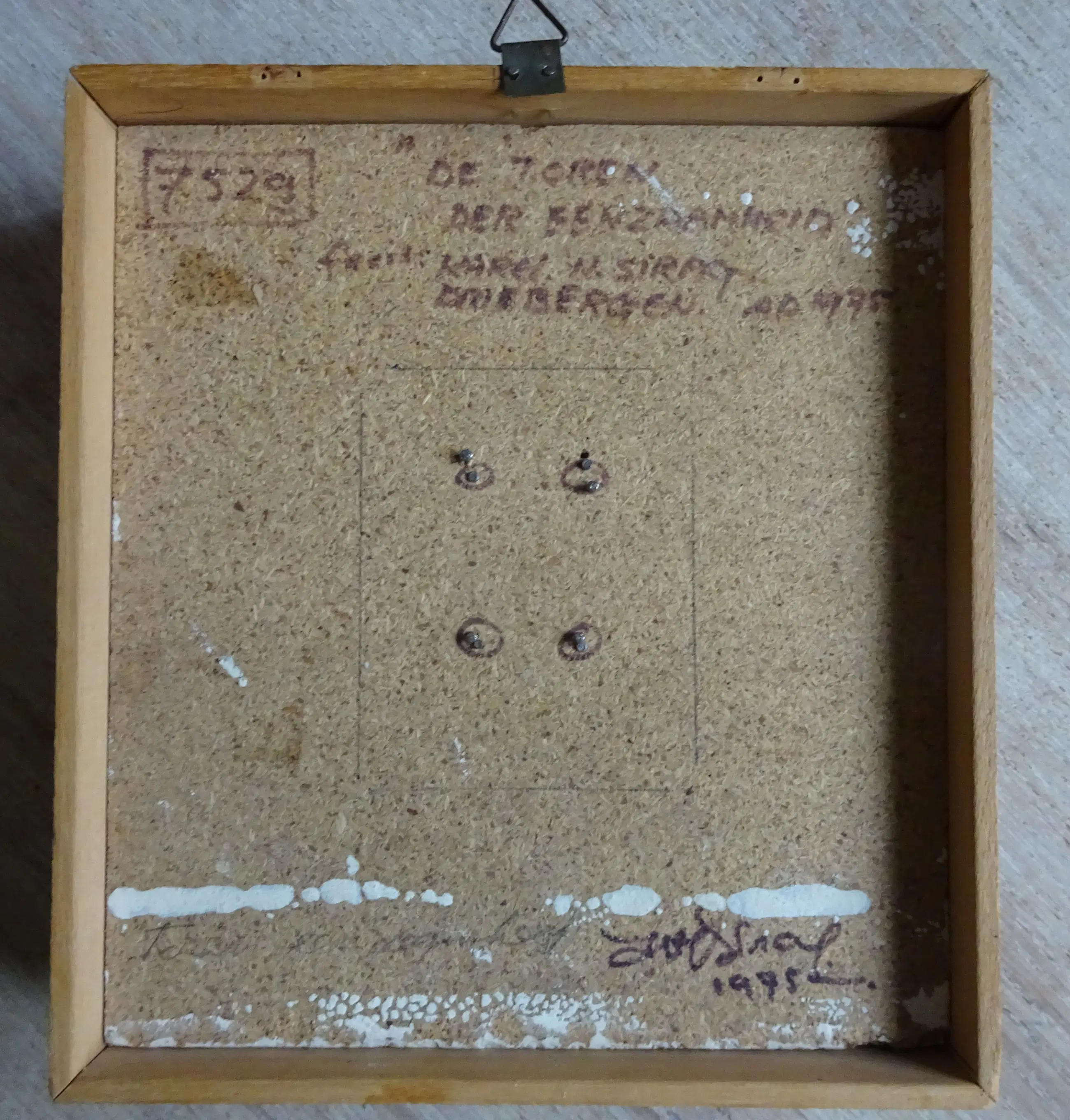 Titel: De toren der eenzaamheid Beeldend kunstenaar: Karel H. Sirag, Driebergen 1948 Jaar: Driebergen 1975 Materiaal: olieverf Nummer: 7529 Afmeting zonder lijst: 5.5 x 7 cm Afmeting met lijst: ca 17.5 x 15.5 cm De miniatuur is aan de achterzijde vol gesigneerd en genummerd door Karel Sirag. De lijst is ook door hem zelf gemaakt. Het schilderijtje is ingelijst en vervolgens bevestigd op een grotere lijst. Conditie: miniatuur in prima staat, lijst gebruikssporen (zie foto's)