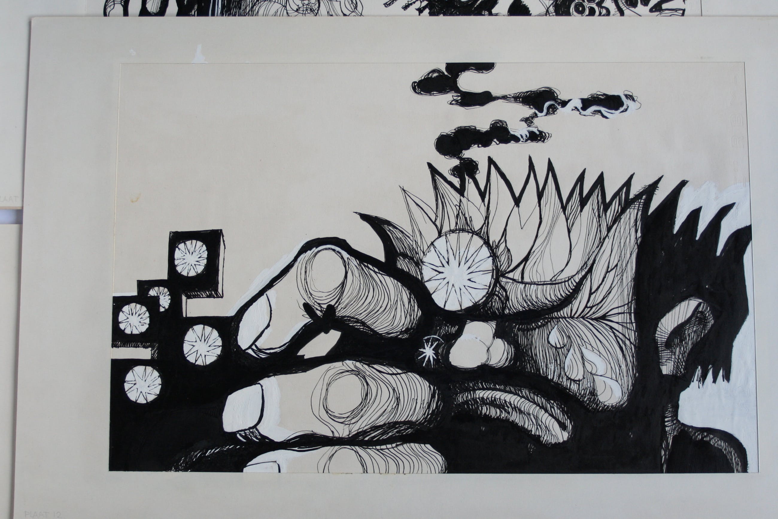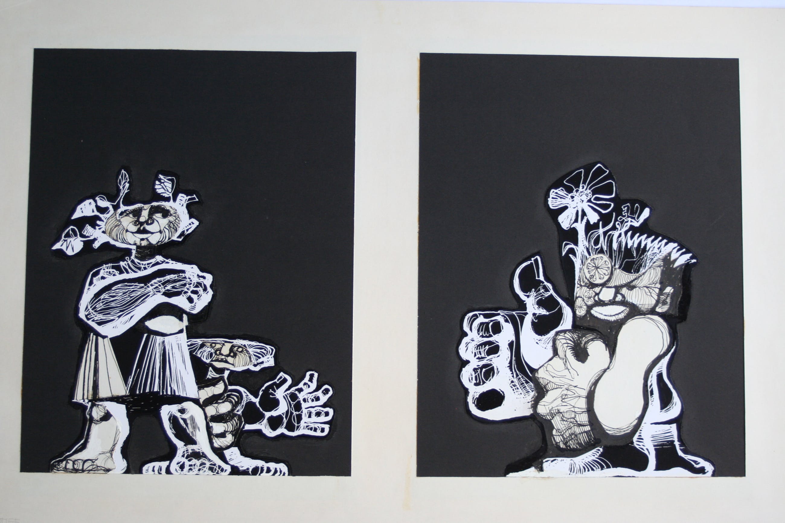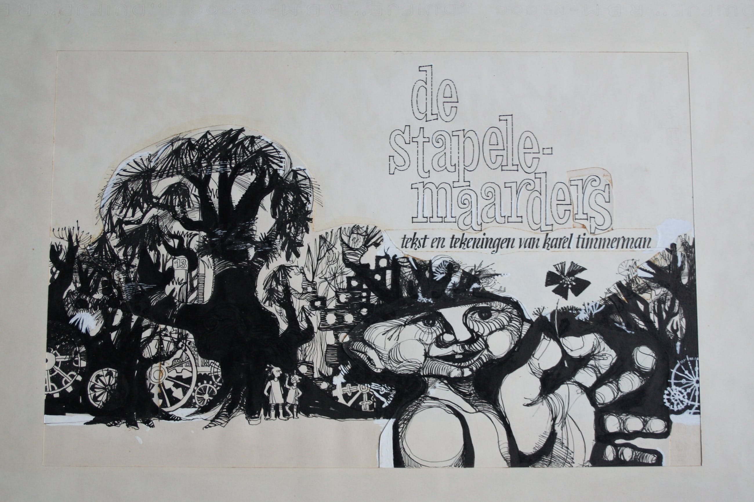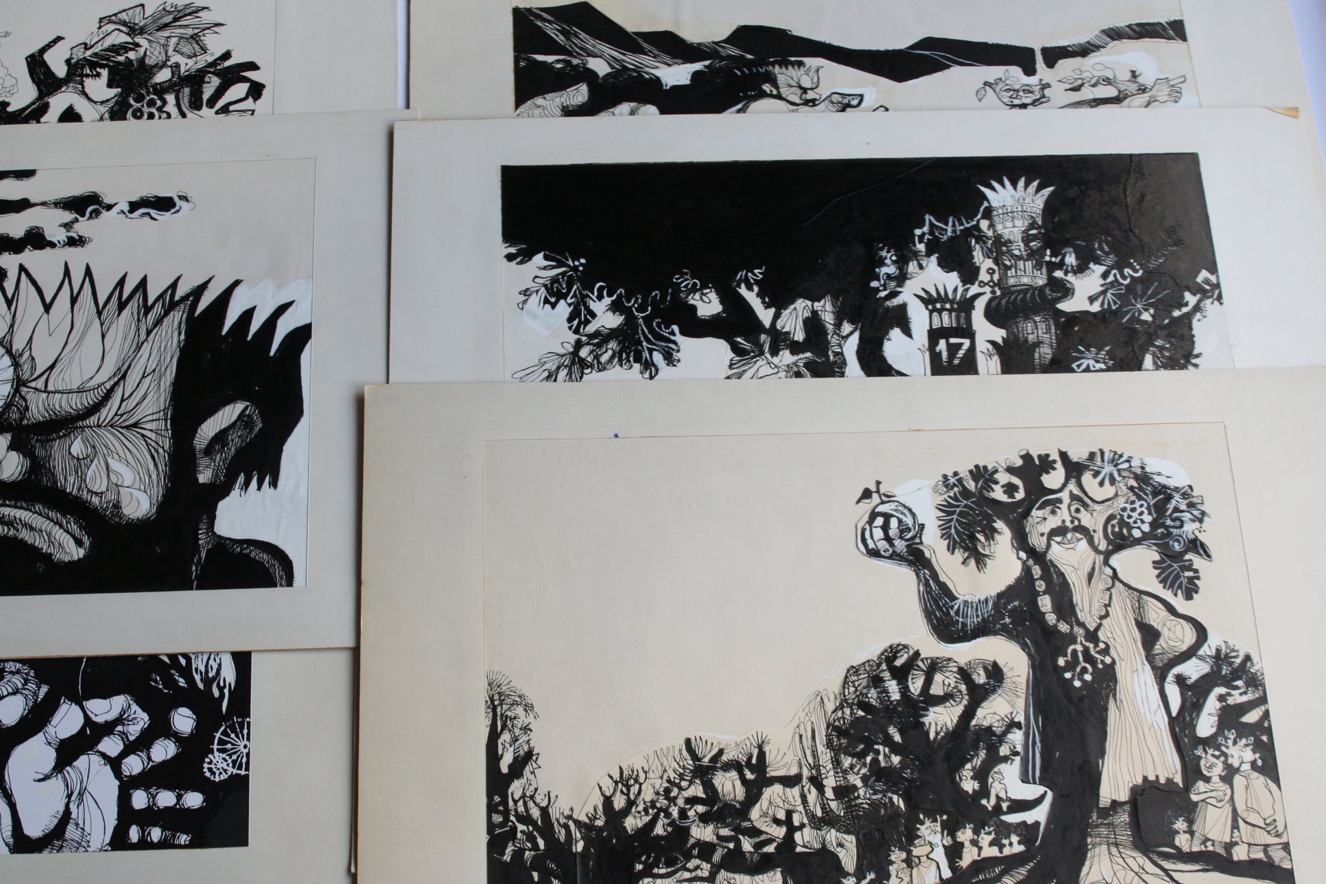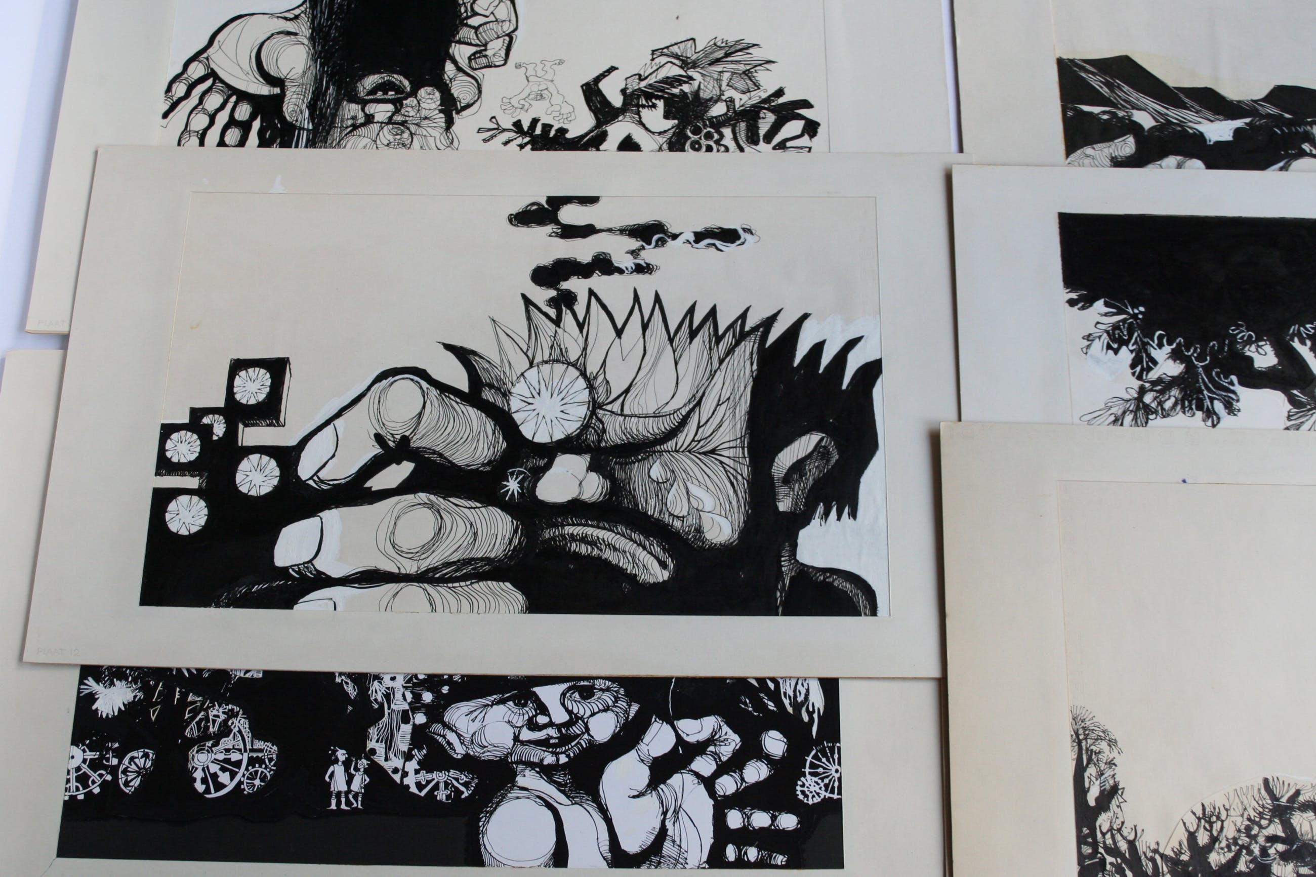Deze 8 schilderijen zijn gemaakt met inkt en witte en zwarte acrylverf. Onbekend of het bestemd was als illustratie of zelfstandig werk. De fantasy figuren noemde de kunstenaar 'stapele maarders' De tekeningen / schilderijen zijn circa 31 x 48 cm, het passepartout en blad waarop het bevestigd is meet 63 breed en 39 hoog.